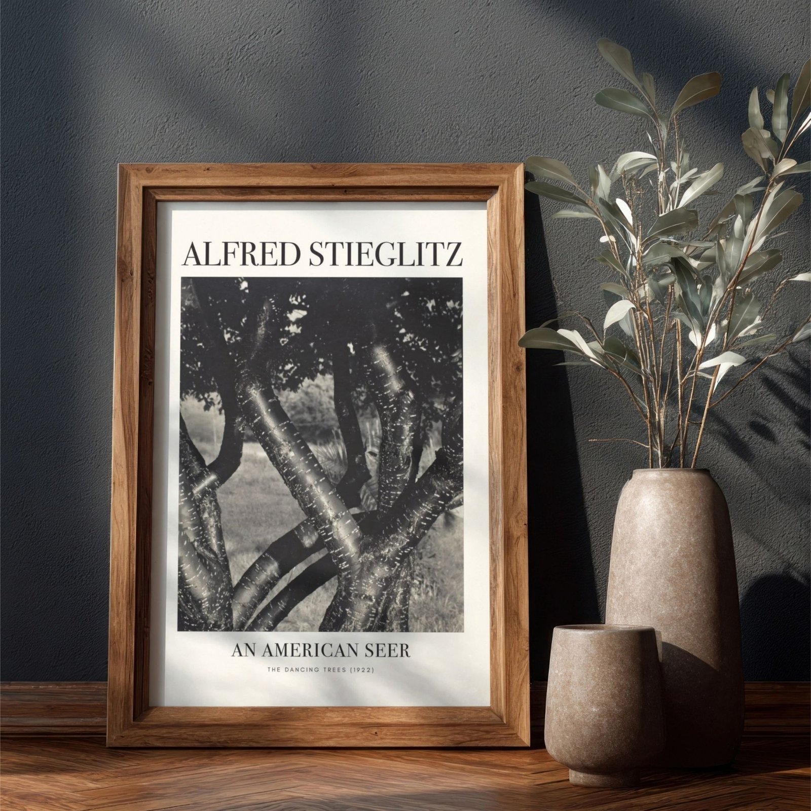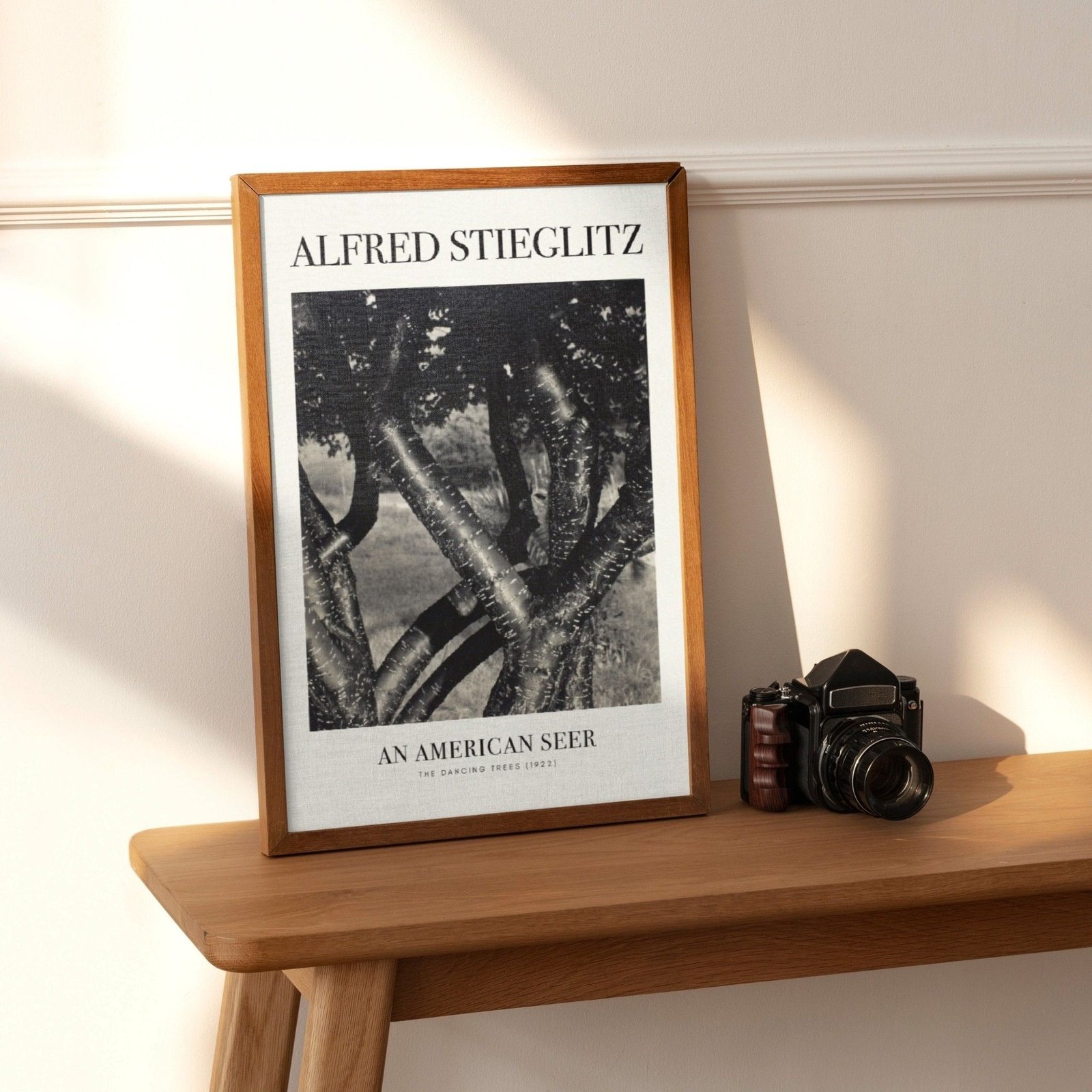 Framed photo of trees on wooden table with camera.Alfred Stieglitz – Dancing Trees