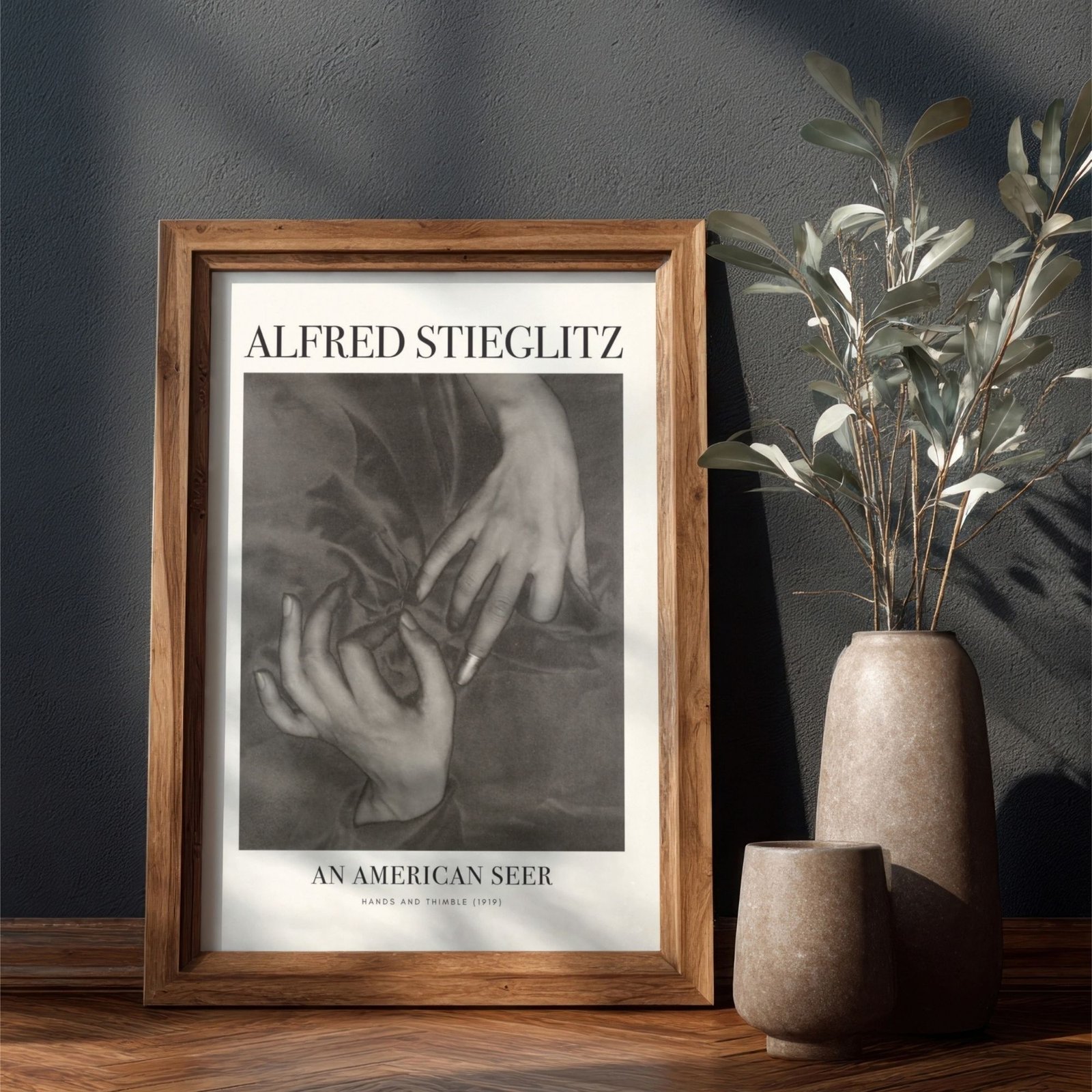 Framed photo beside camera on wooden table.Alfred Stieglitz – Hands & Thimble