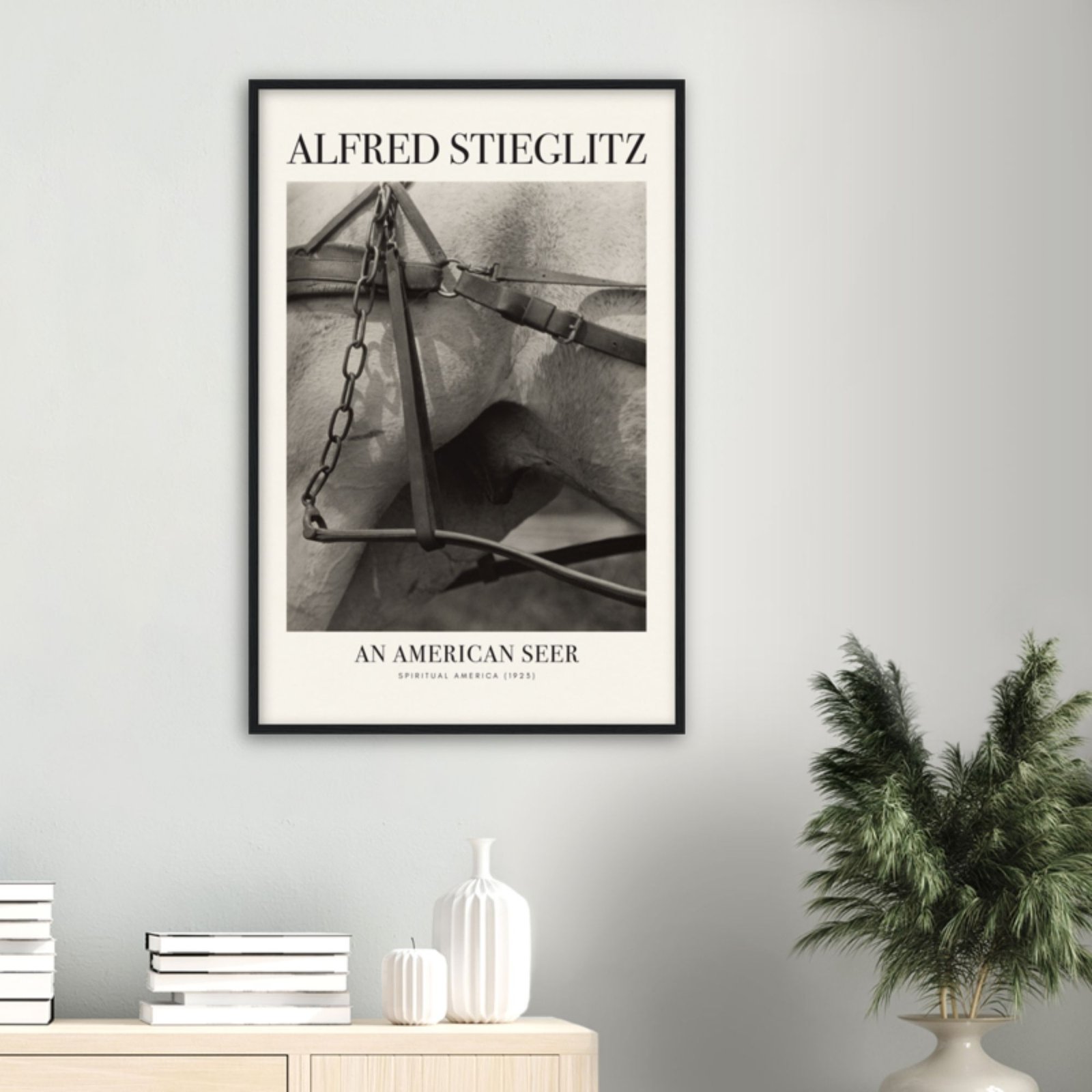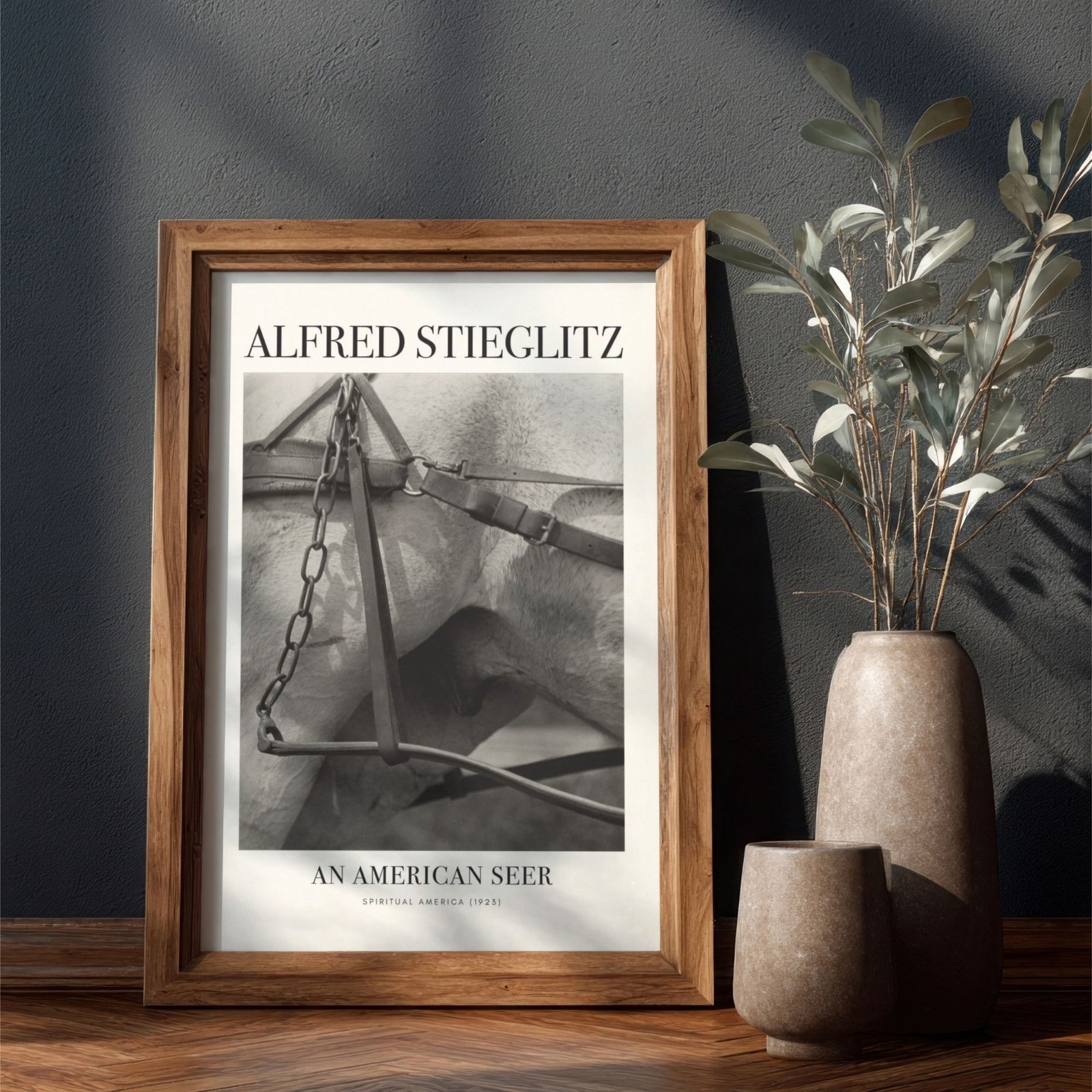 Framed Alfred Stieglitz photo on wooden shelf.Alfred Stieglitz – Spiritual America