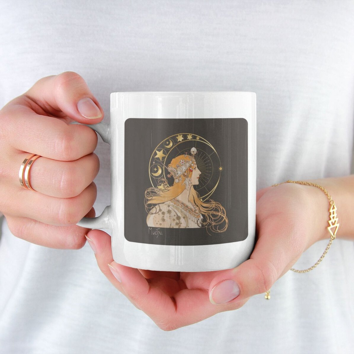 Mug with Mucha-style celestial illustration held by hand.Alphonse Mucha Coffee Mug – Art Nouveau | Custom Ceramic Mug