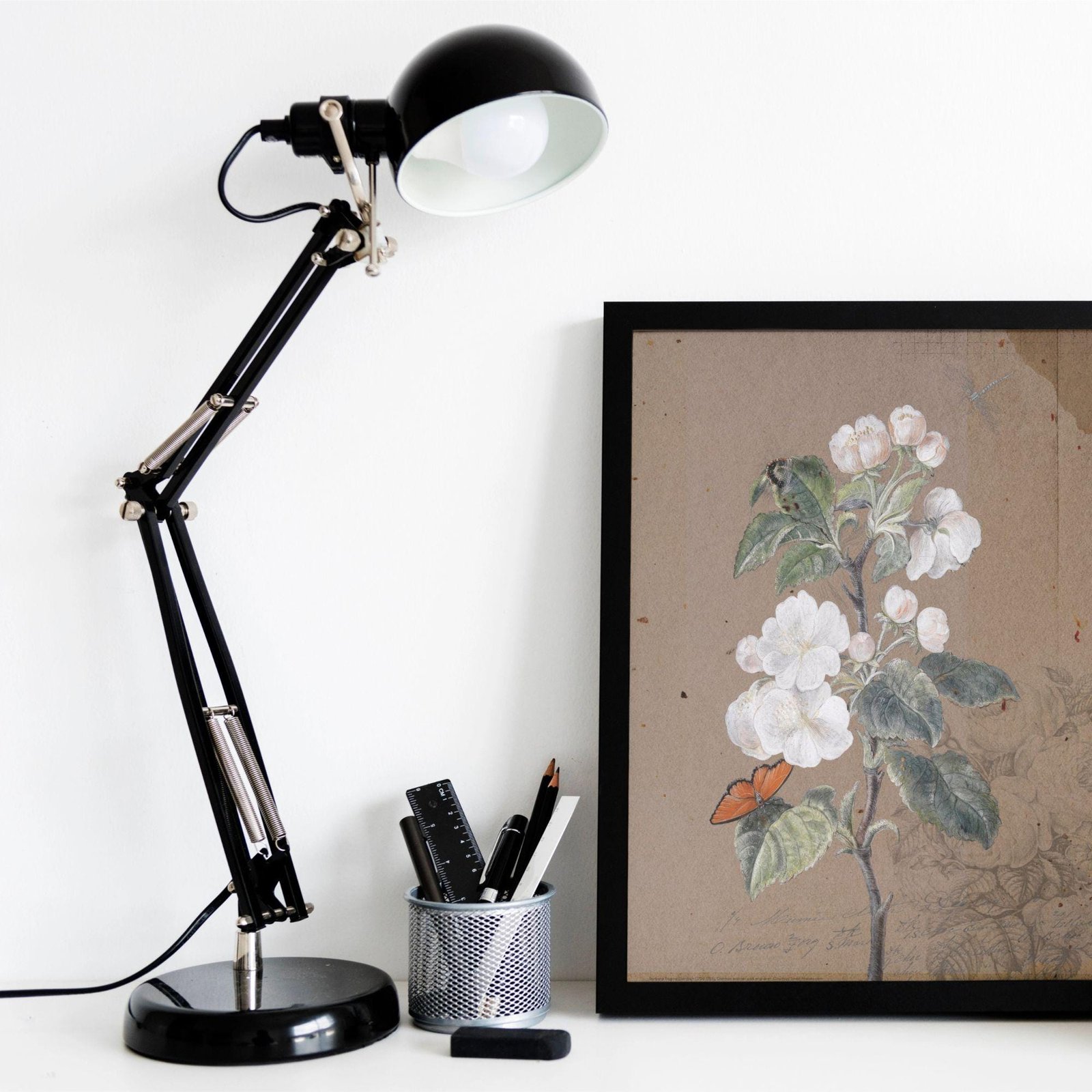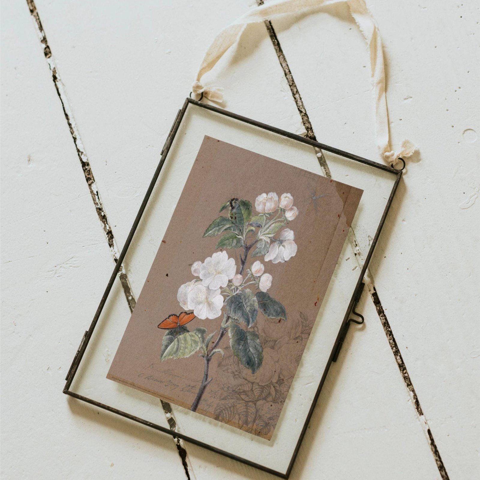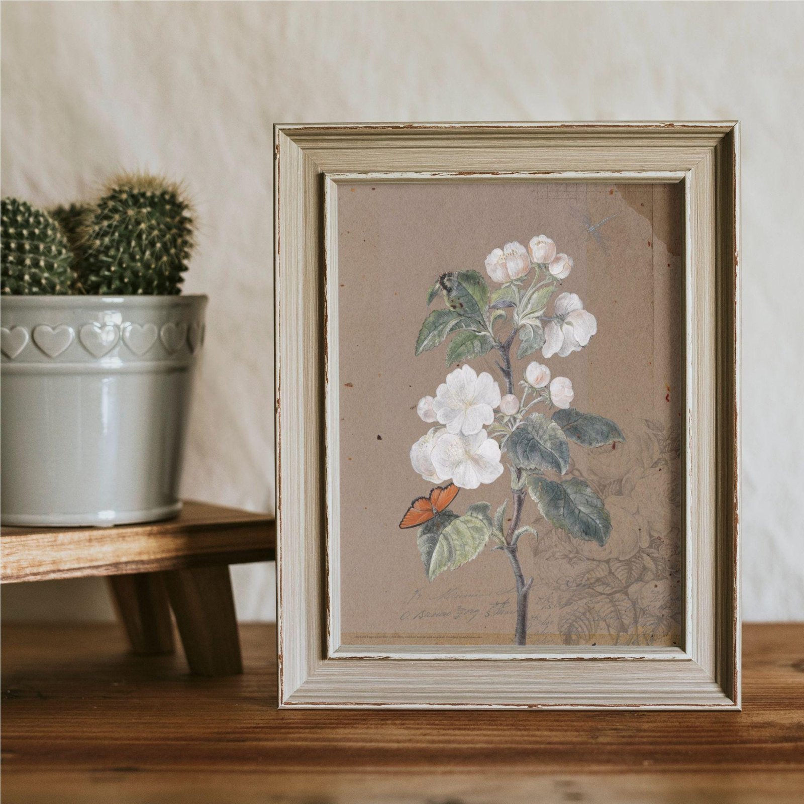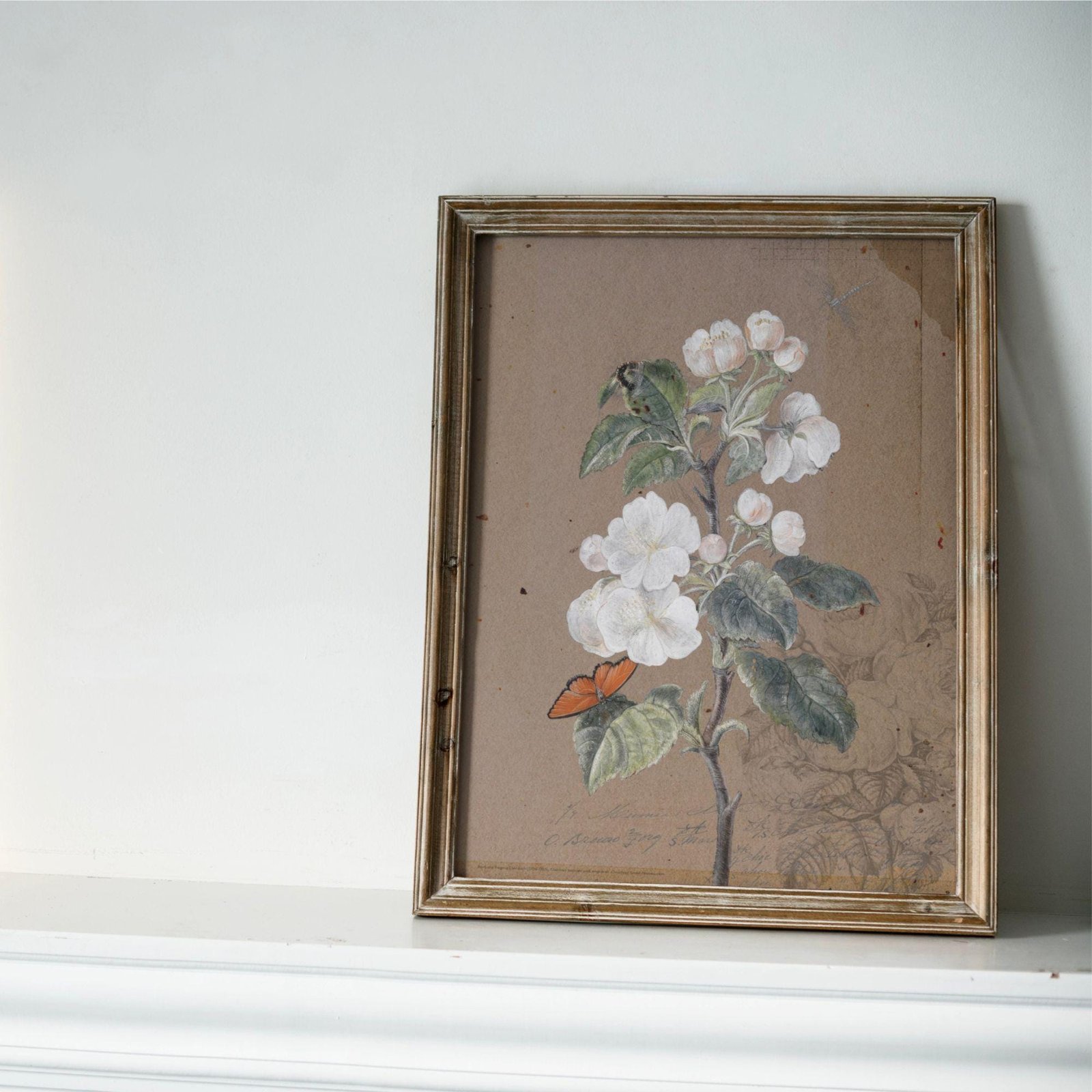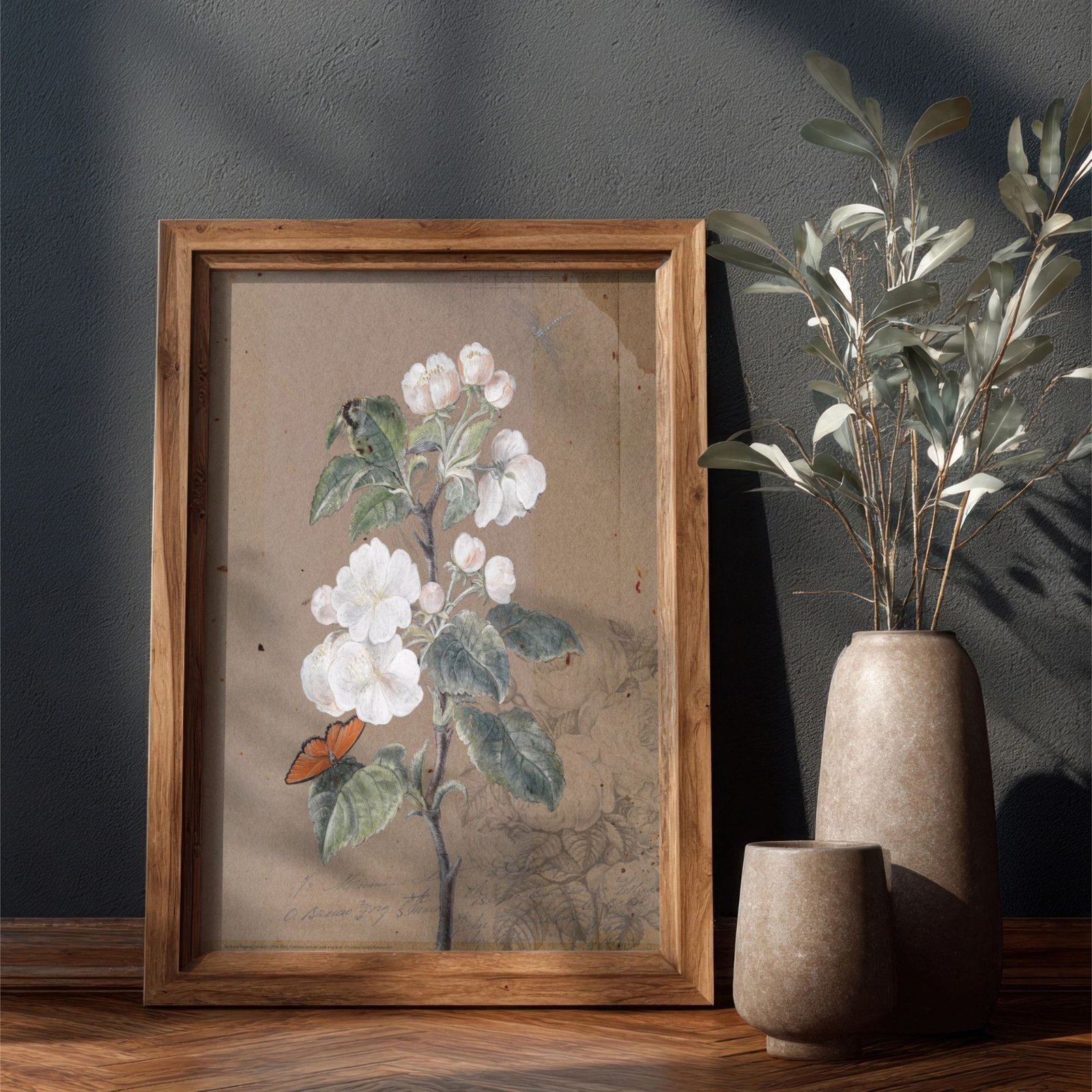 This poster presents one of her exquisite designs — Apple Blossoms (Apfelblüten) in full bloom, accompanied by a delicate butterfly, a small caterpillar, and a hovering dragonfly. The soft white and pink blossoms contrast beautifully with the fresh green leaves and lively insects, creating a scene that feels both naturalistic and timeless — a perfect example of antique floral wall art.