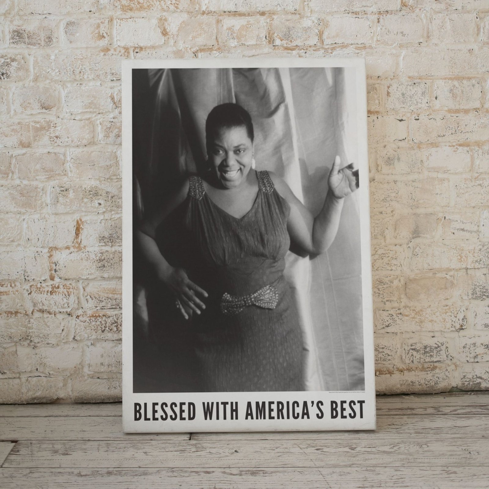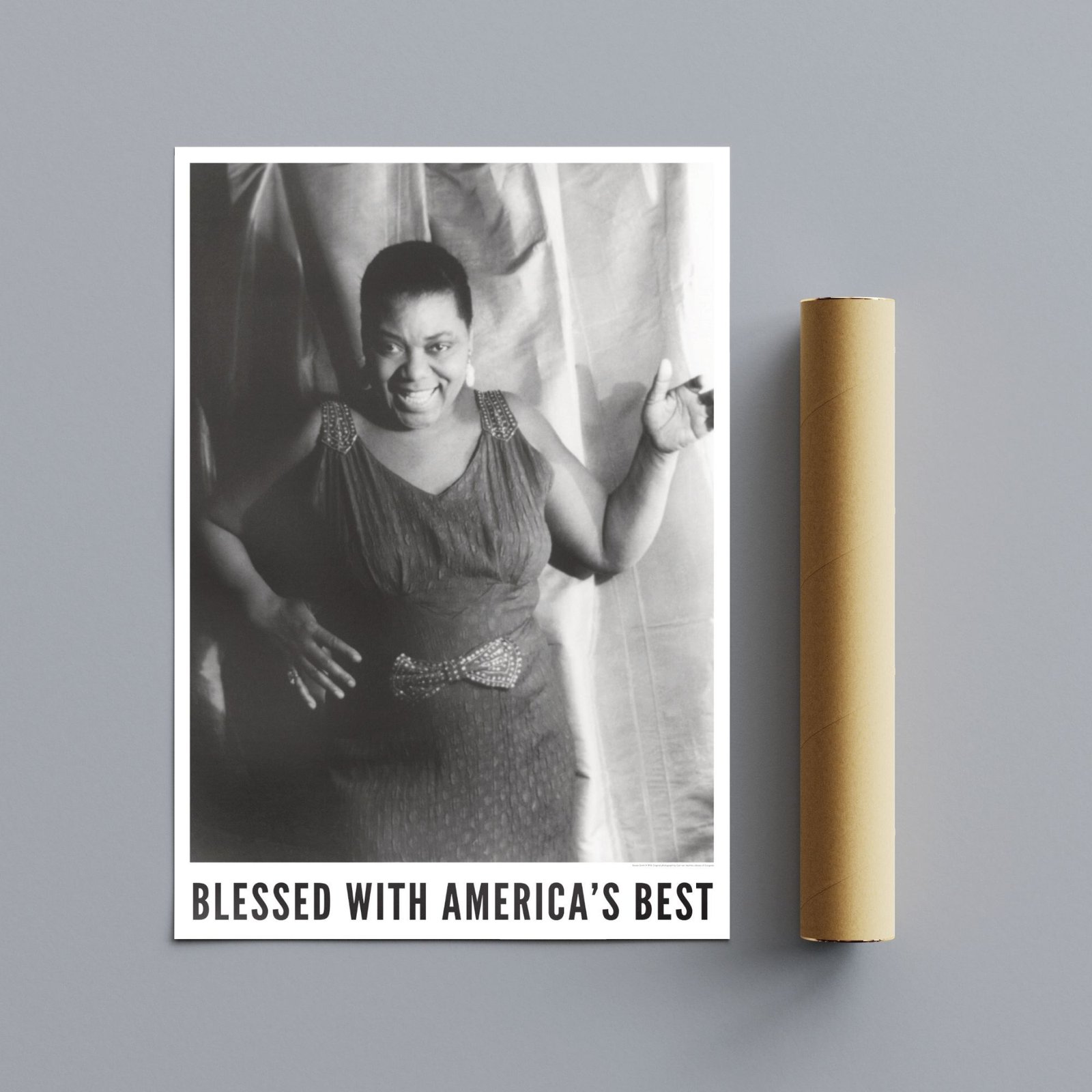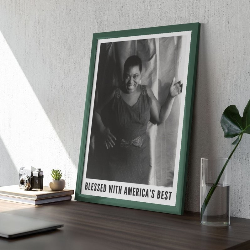 Bessie Smith (1894–1937) was the “Empress of the Blues,” an American singer whose voice carried towering power, razor-sharp phrasing, and a depth of feeling that helped define the blues for generations to come. She sang with fearless honesty—equal parts grit and grace—turning lived experience into art that still resonates in every modern soulful vocal. This music poster features a captivating portrait of Smith photographed by Carl Van Vechten in 1936, preserving her magnetic stage presence and warm, commanding spirit in a timeless black-and-white image.