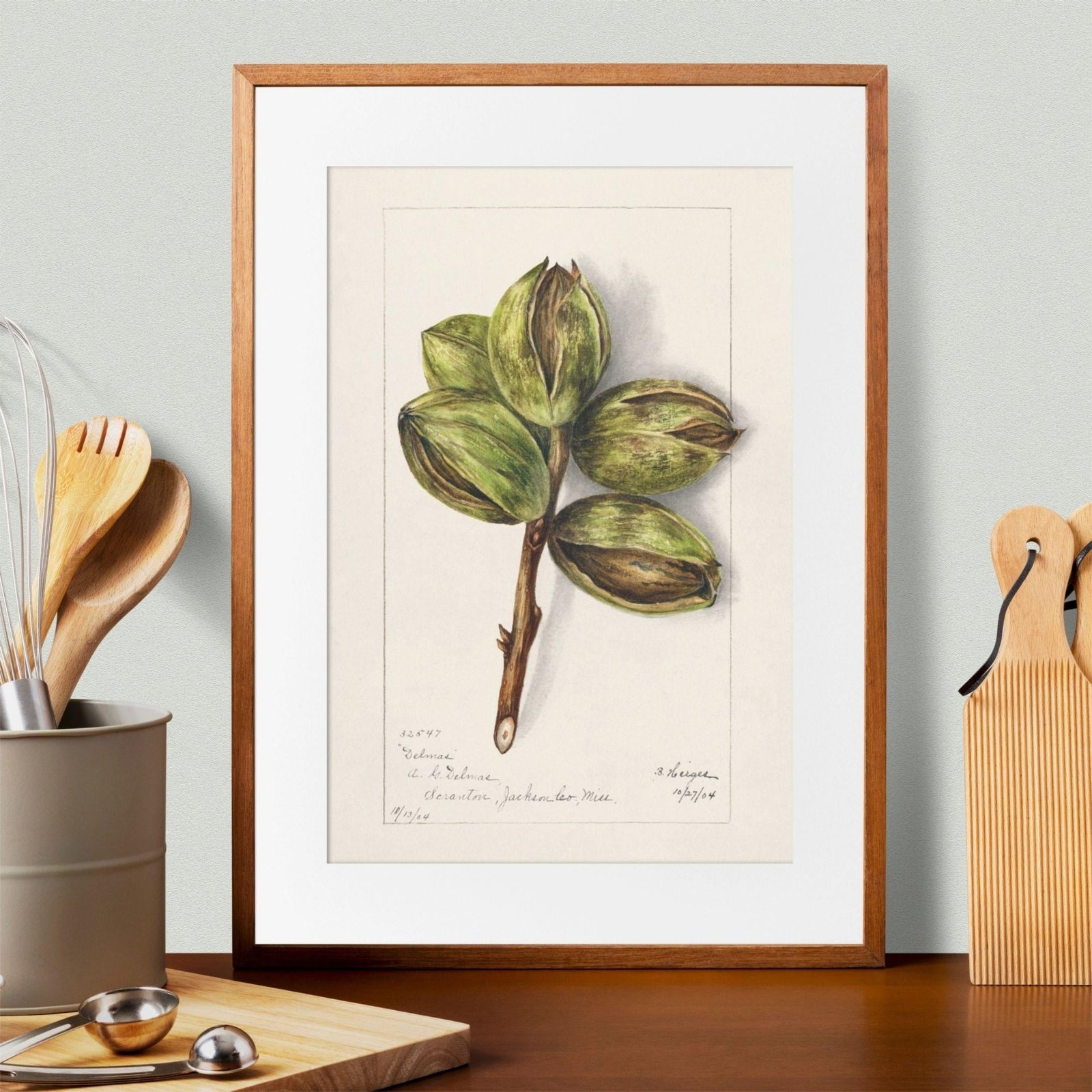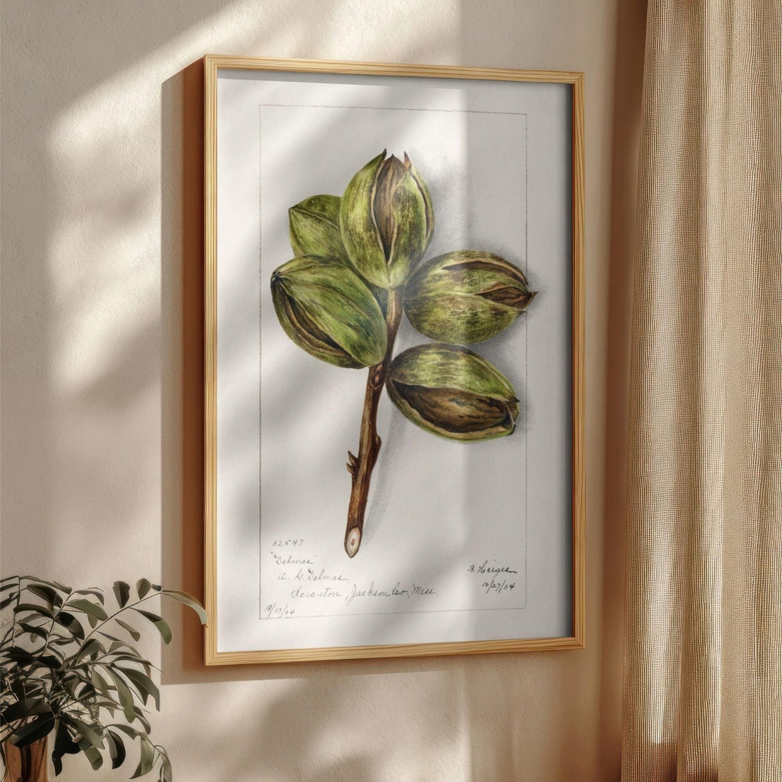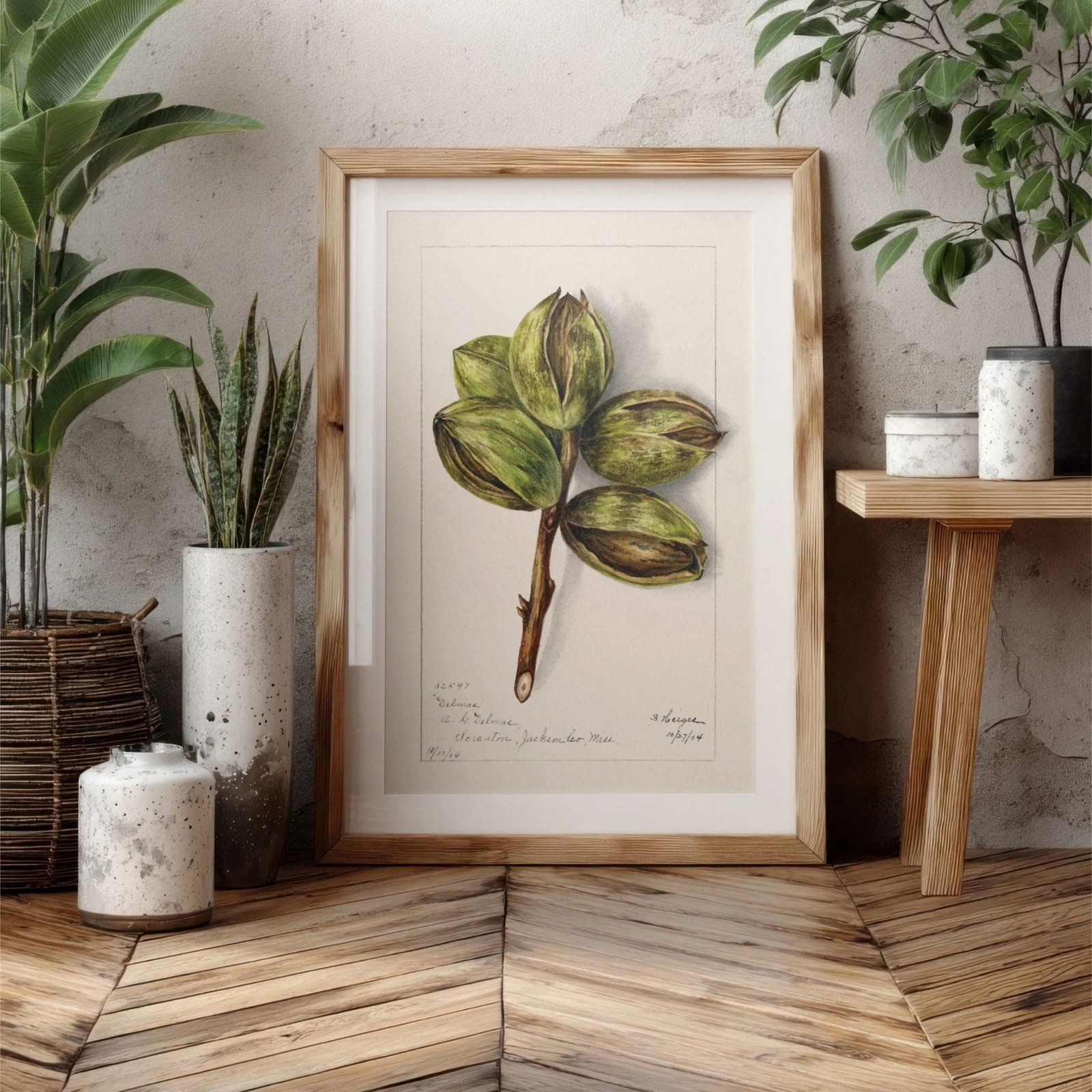 Botanical illustration of green pecan nuts in frame.Country Life Educational Poster – Hickory