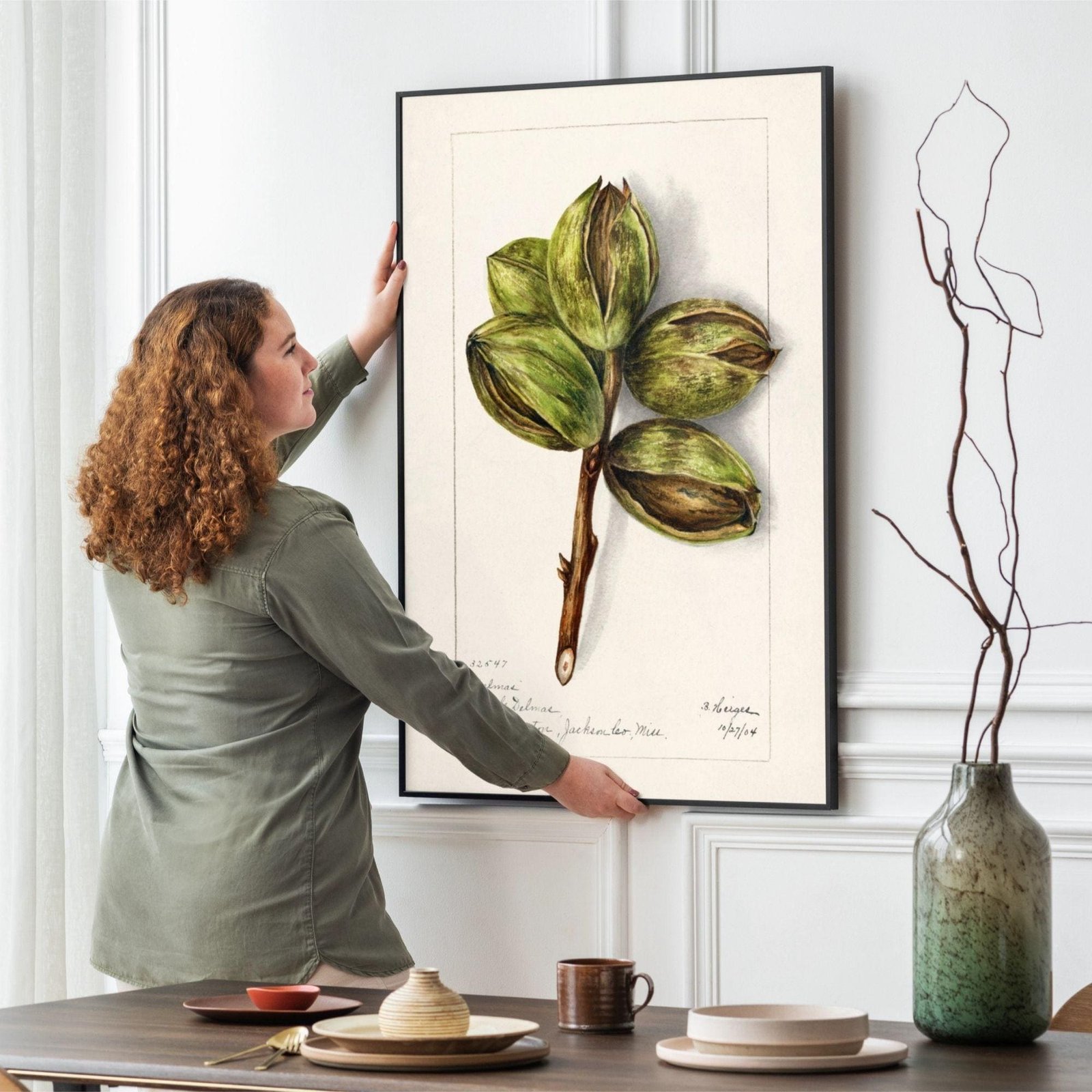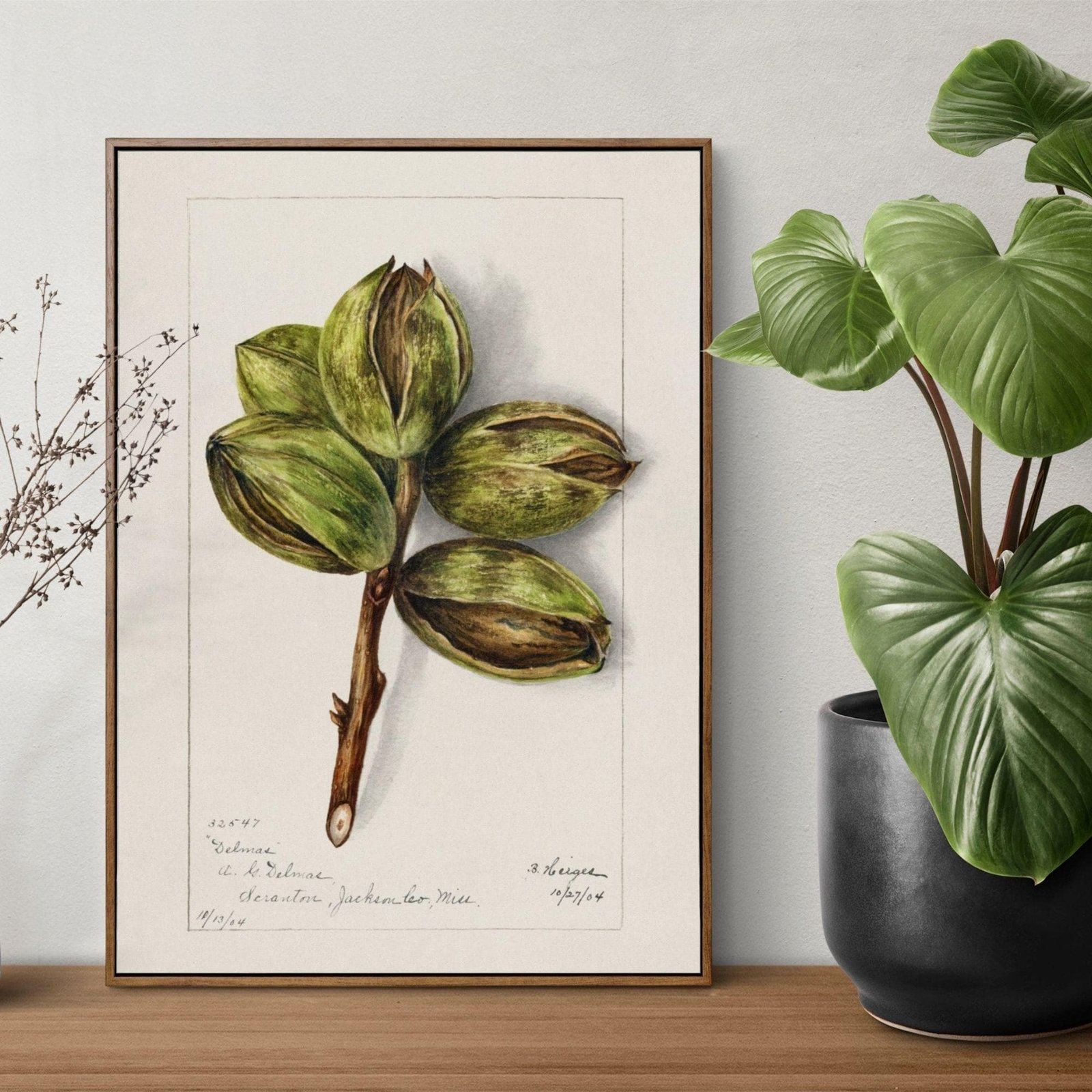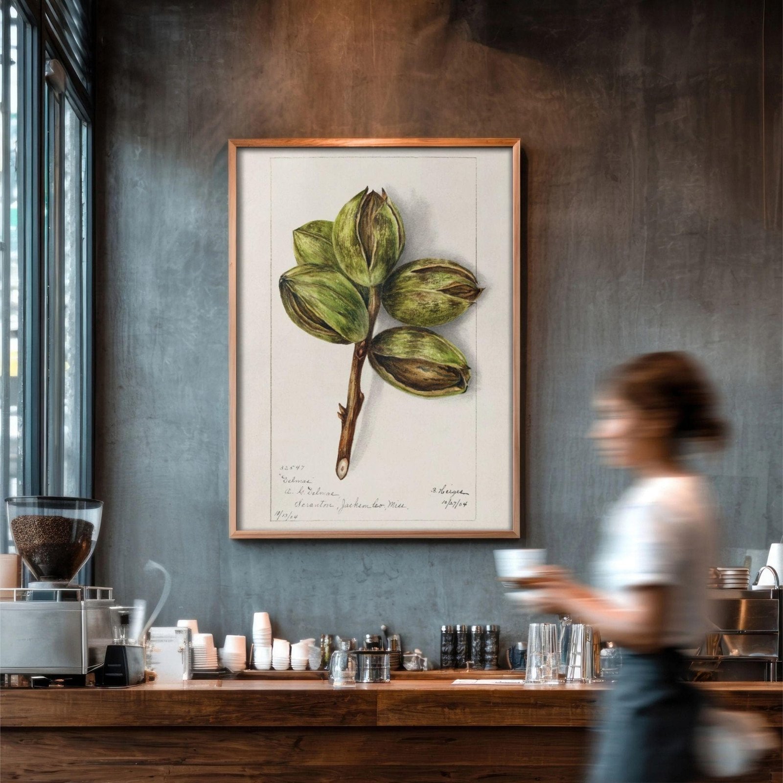 Botanical illustration of green pecan nuts in frame.Country Life Educational Poster – Hickory