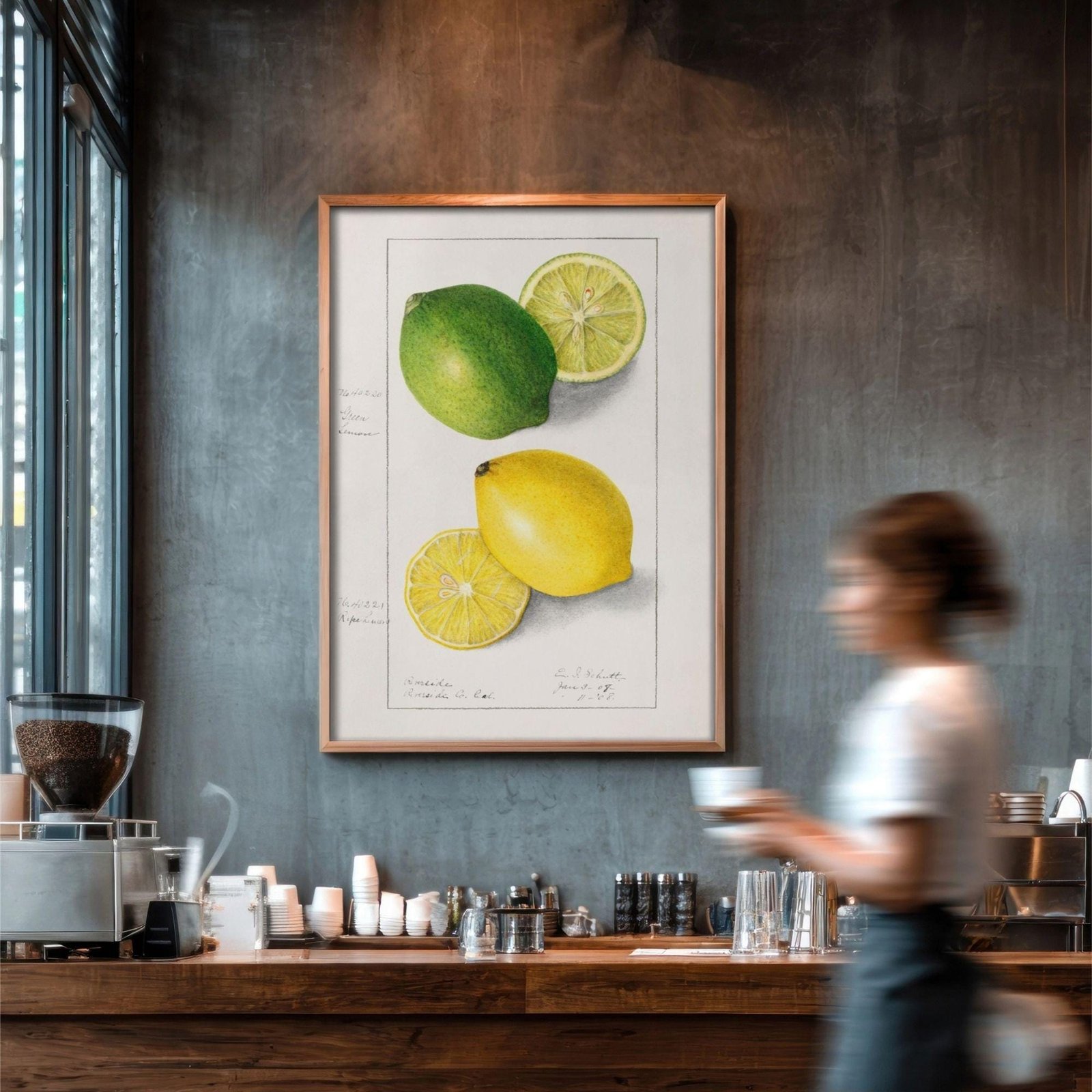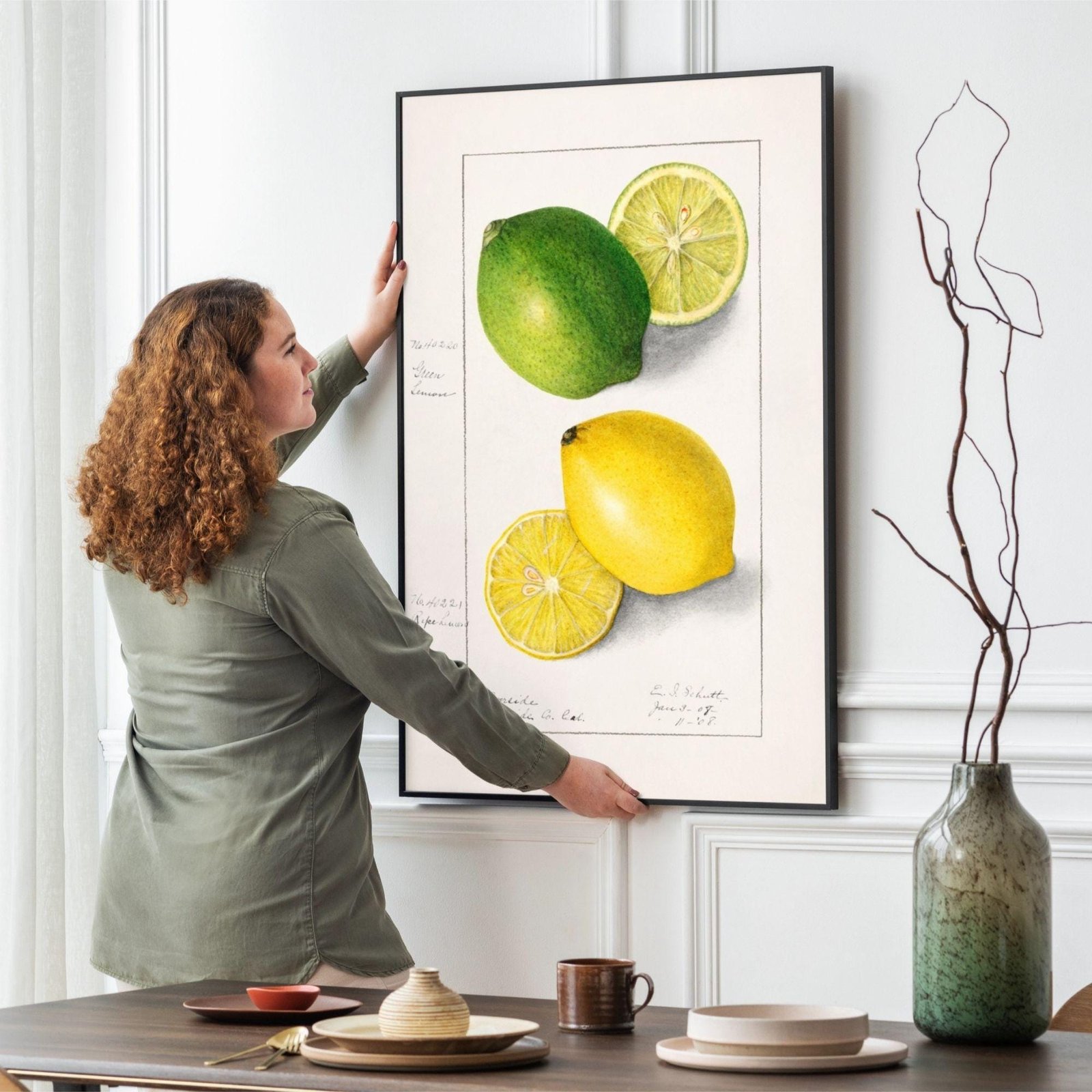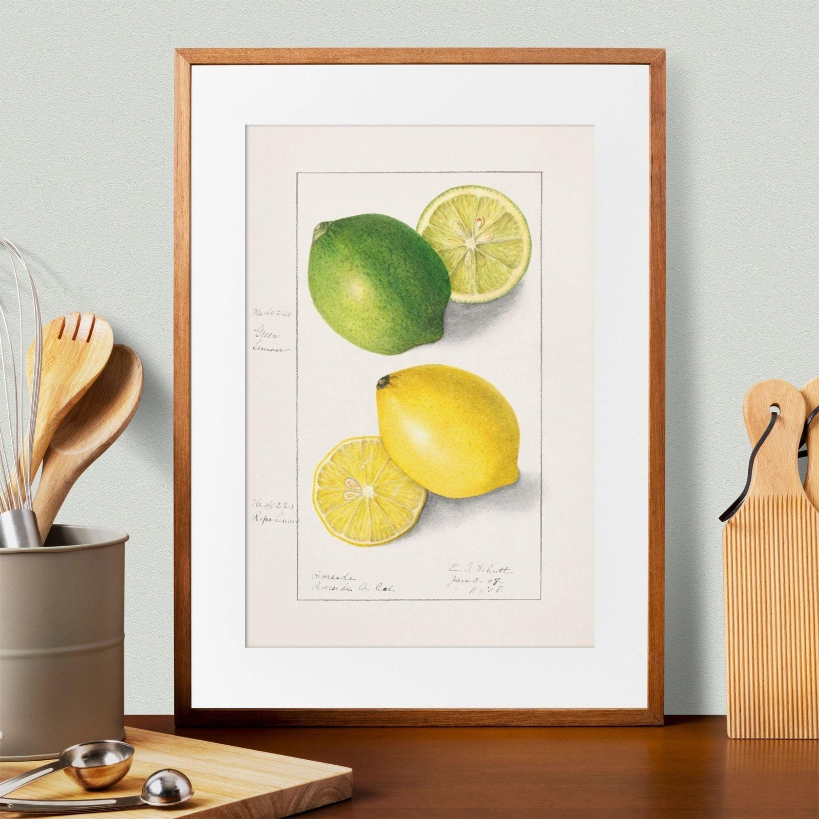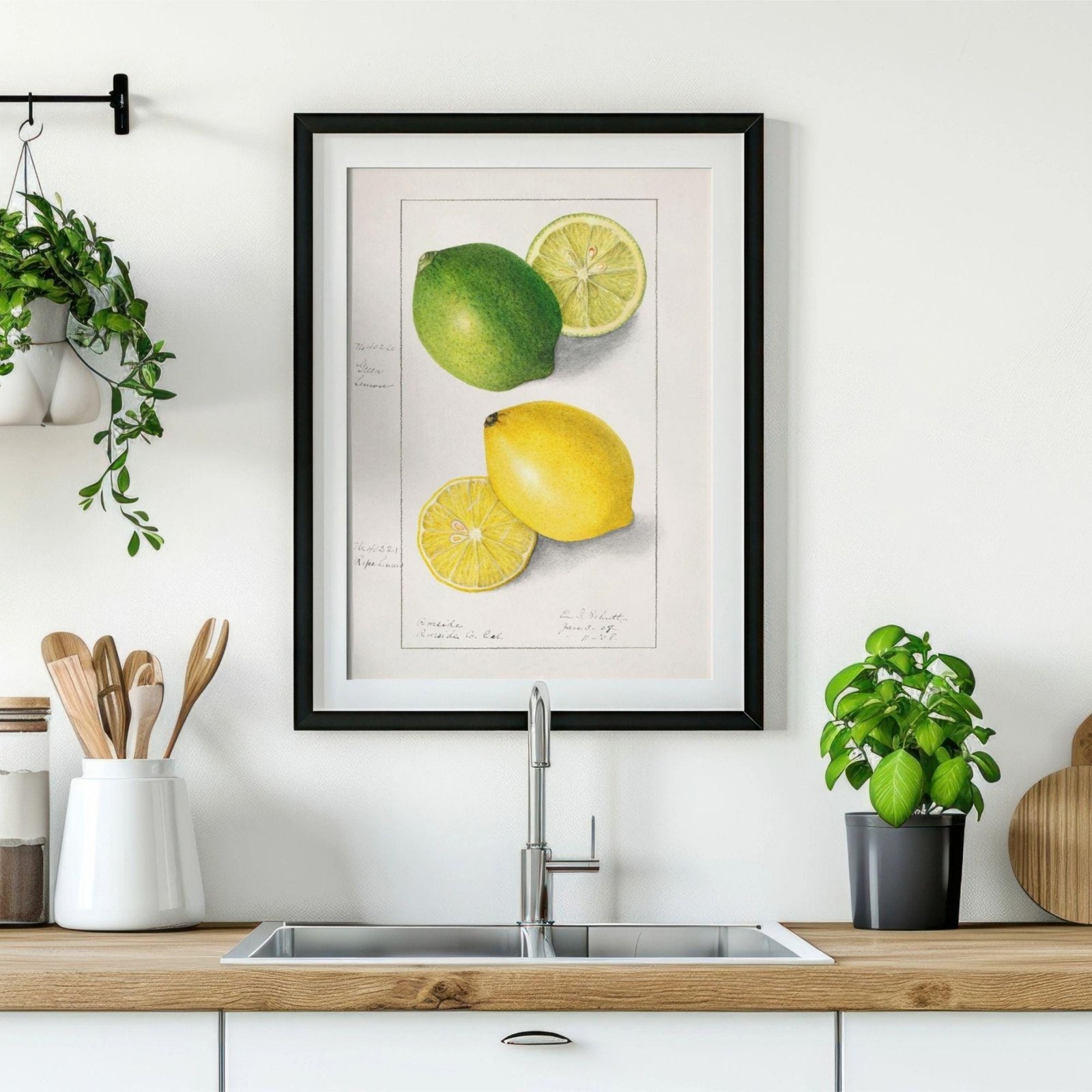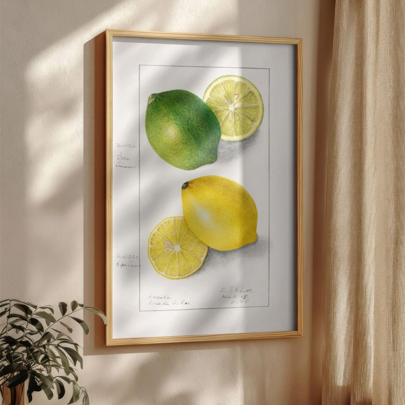 Framed citrus illustration with potted plant nearby.Country Life Educational Poster – Lemon