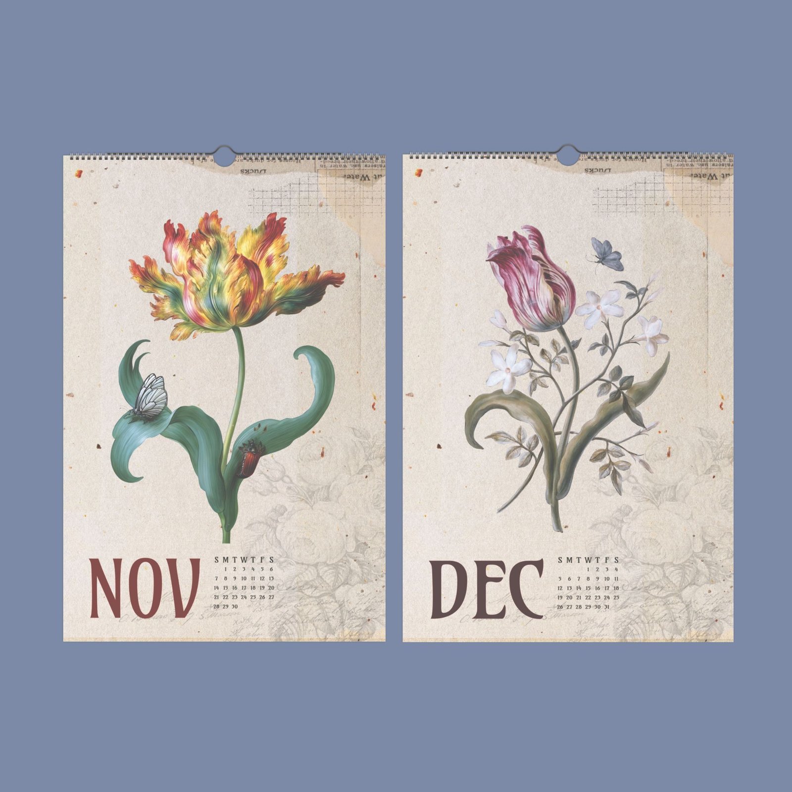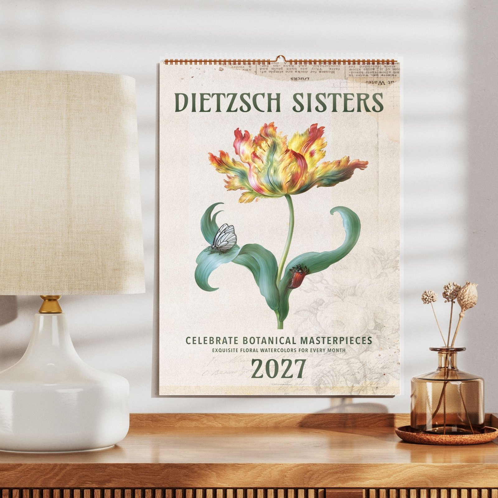 Our botanical calendar features exquisite painted flowers and still life art by the renowned Dietzsch sisters, masters of 18th-century botanical illustration. Barbara Regina Dietzsch (1706-1783) and her sisters, working in Nuremberg during the 1700s, gained recognition for their detailed watercolor paintings that beautifully capture the elegance of natural history subjects. Their celebrated works are admired by art lovers and collectors worldwide.