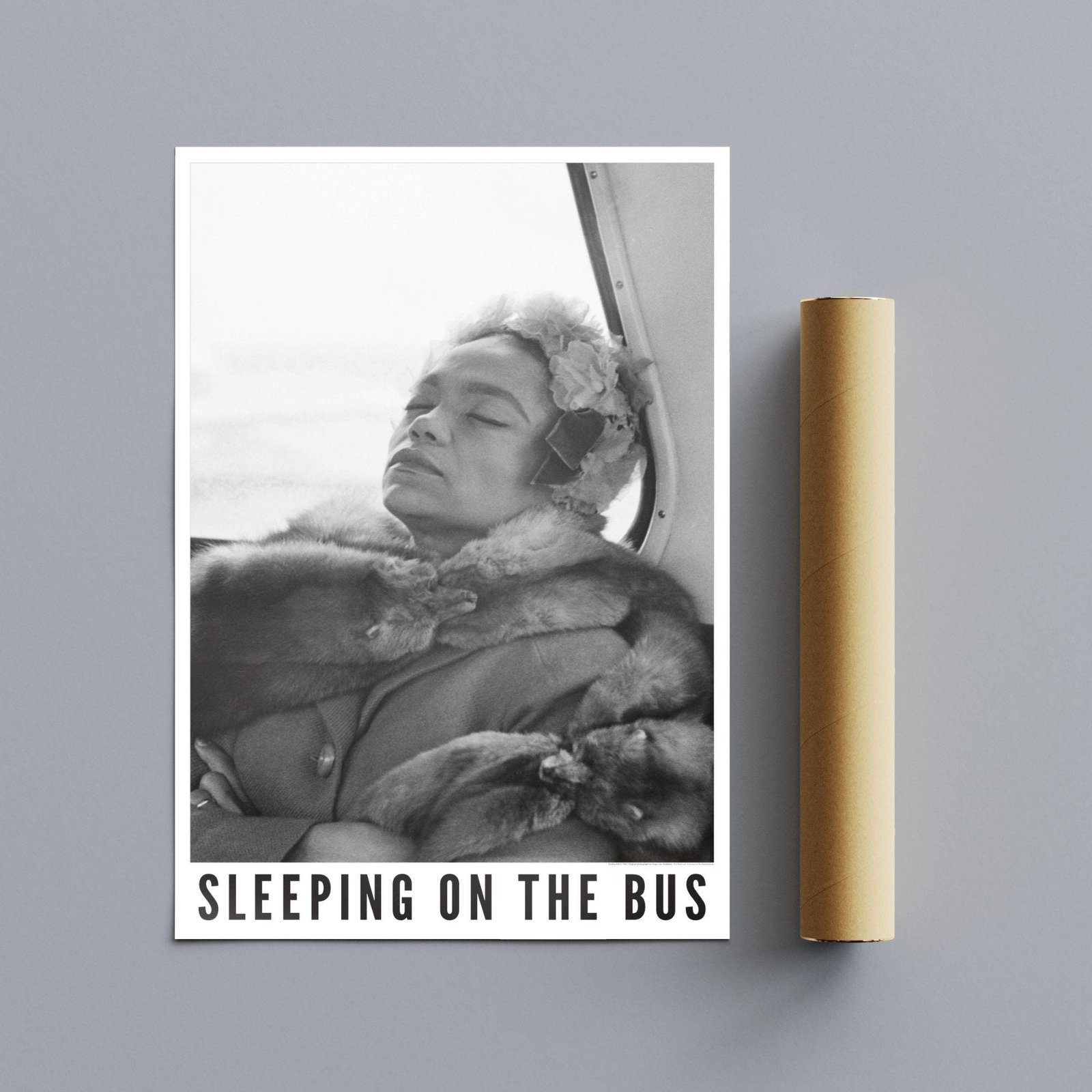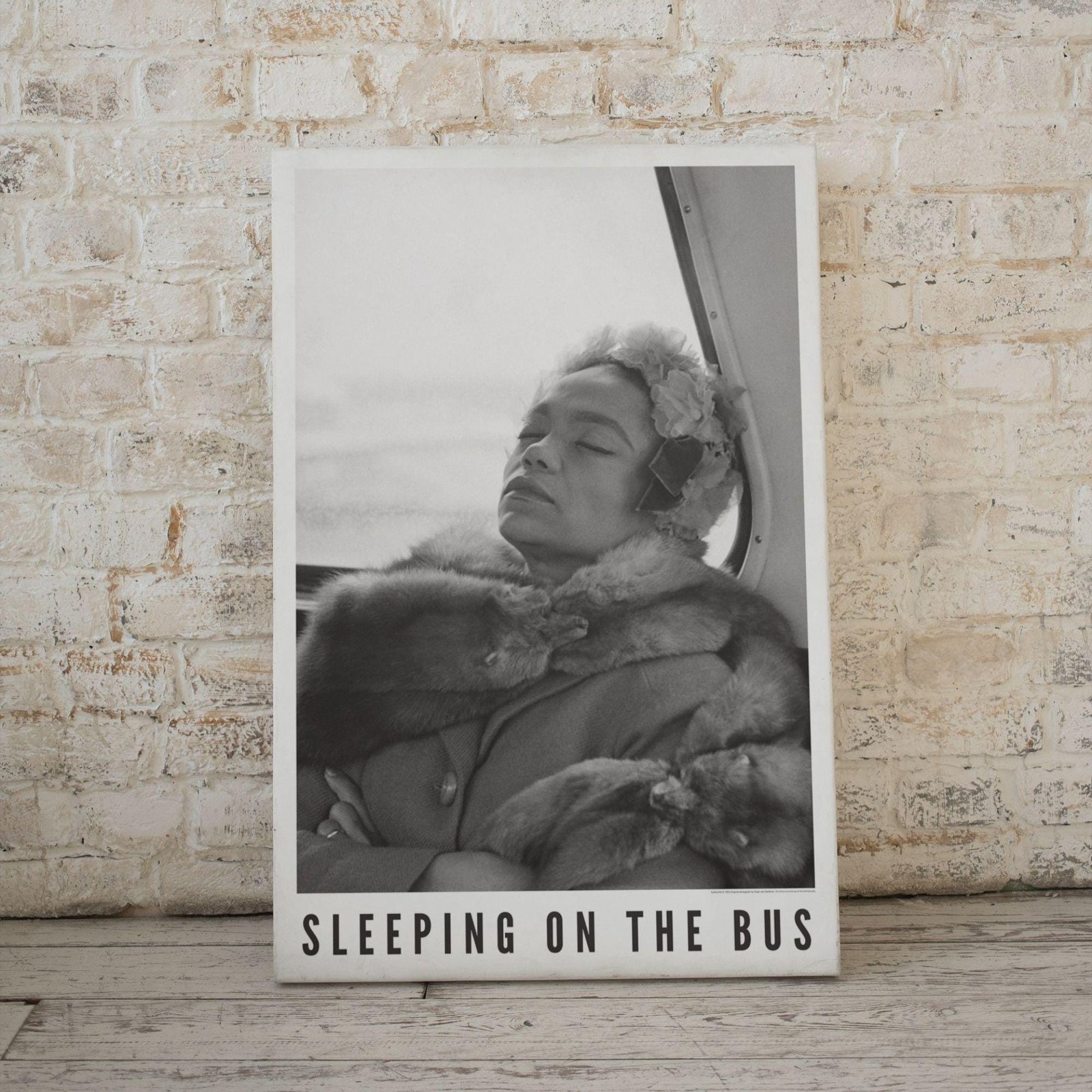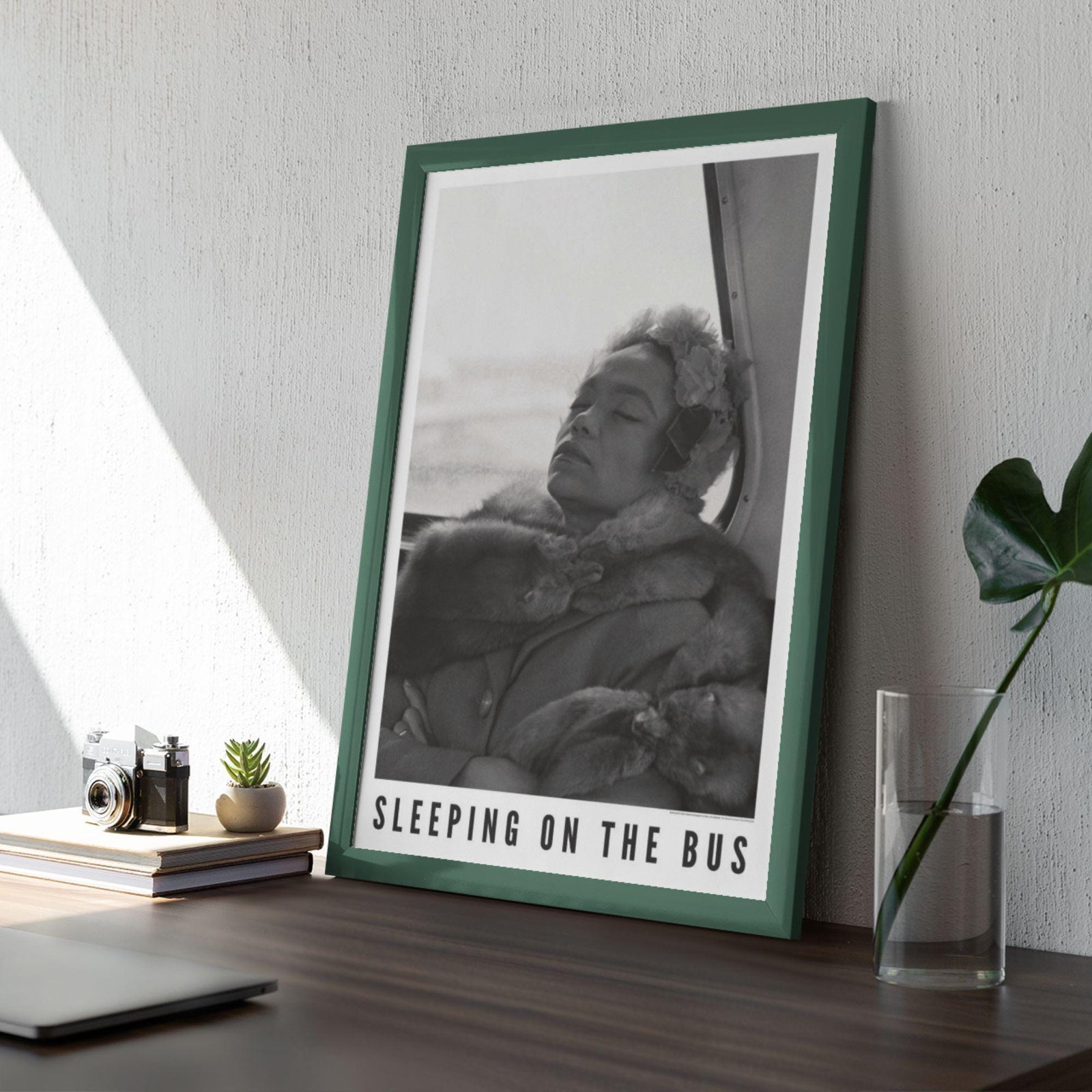 Framed photo titled 'Sleeping on the Bus' on table.Eartha Kitt – Jazz Music Poster, Sleeping On The Bus 1962