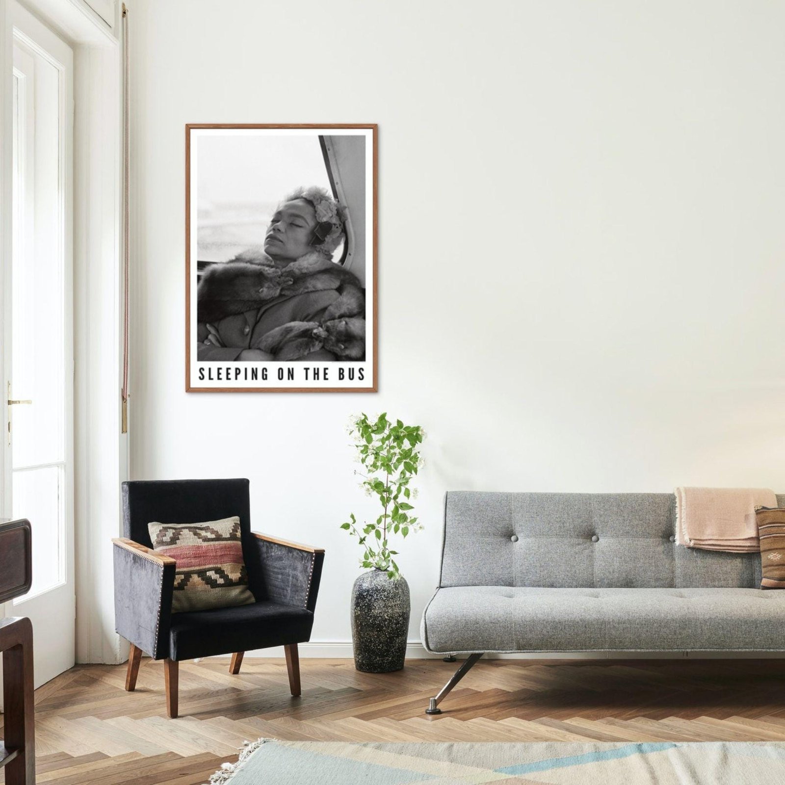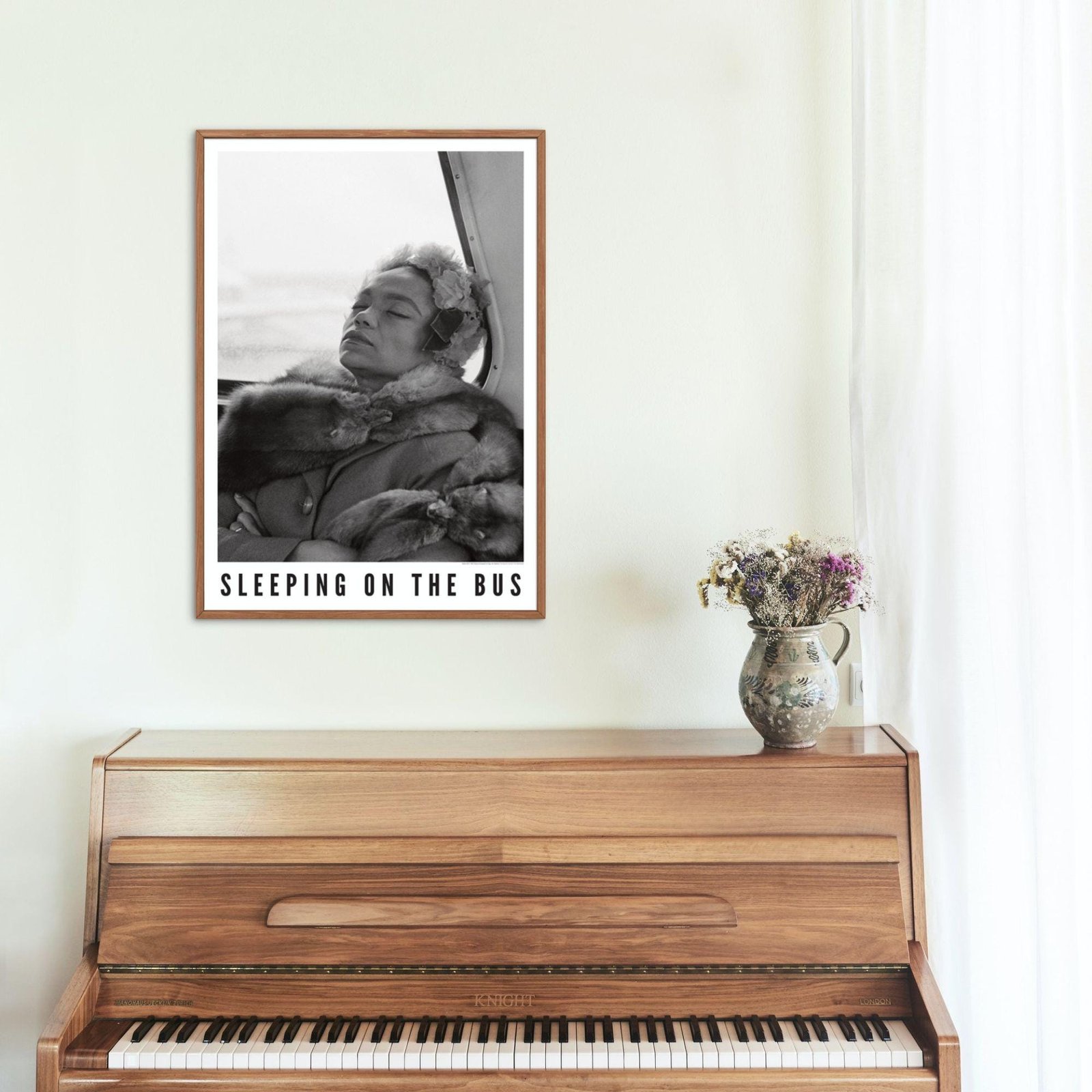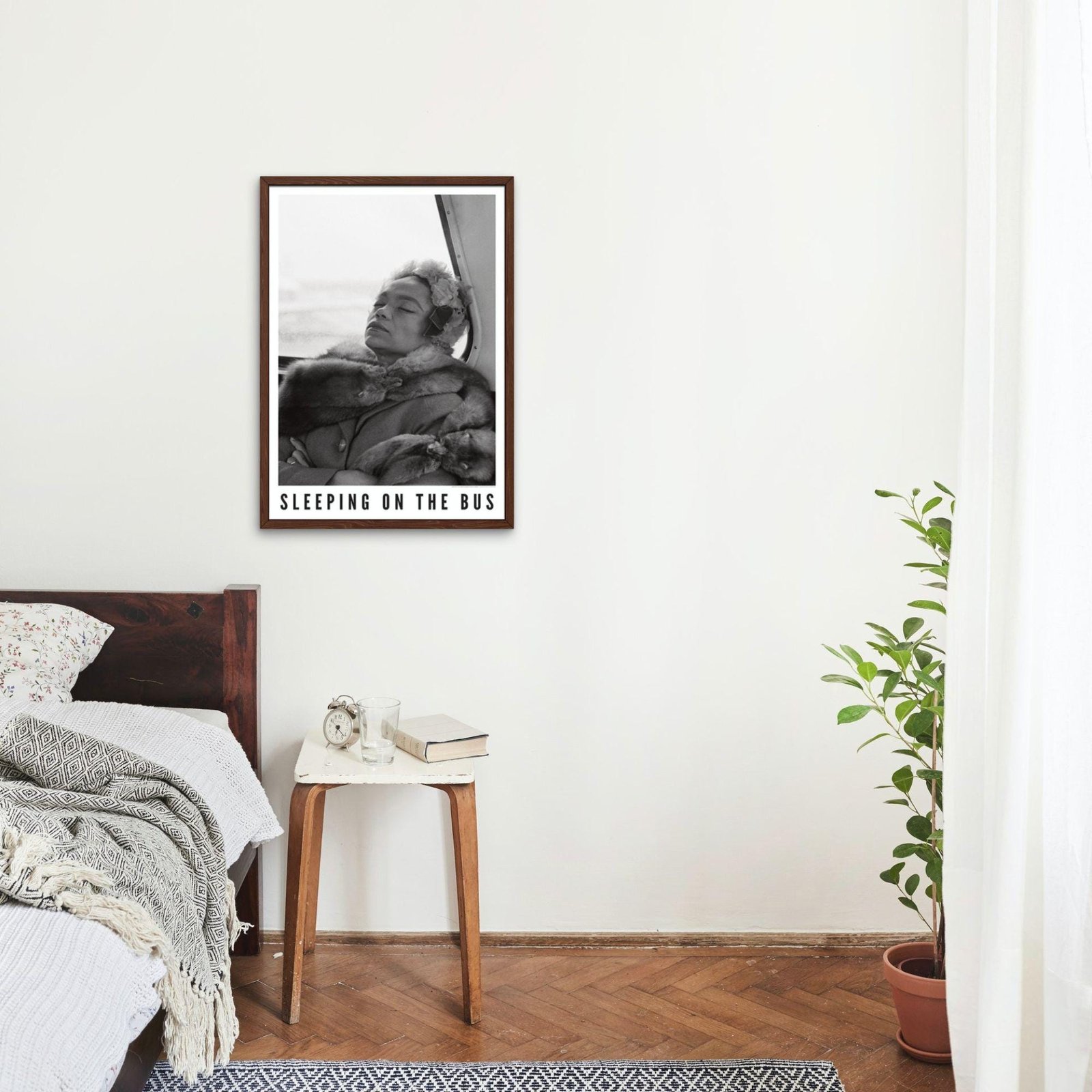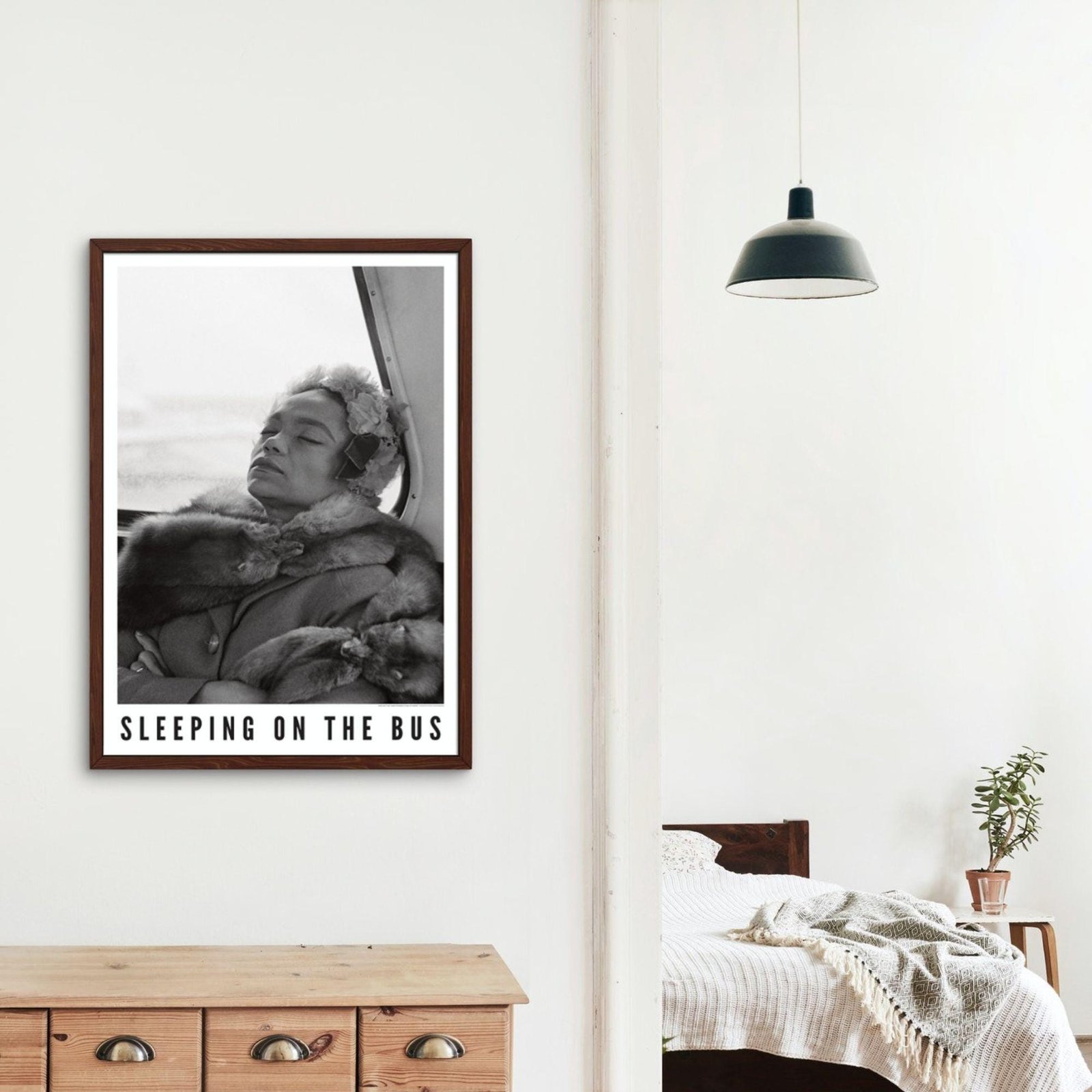 Framed photo titled 'Sleeping on the Bus' on table.Eartha Kitt – Jazz Music Poster, Sleeping On The Bus 1962