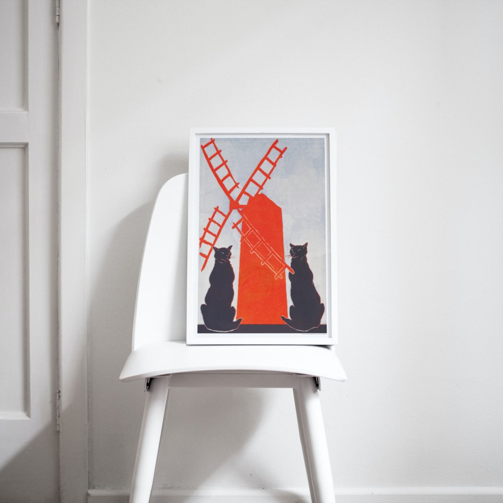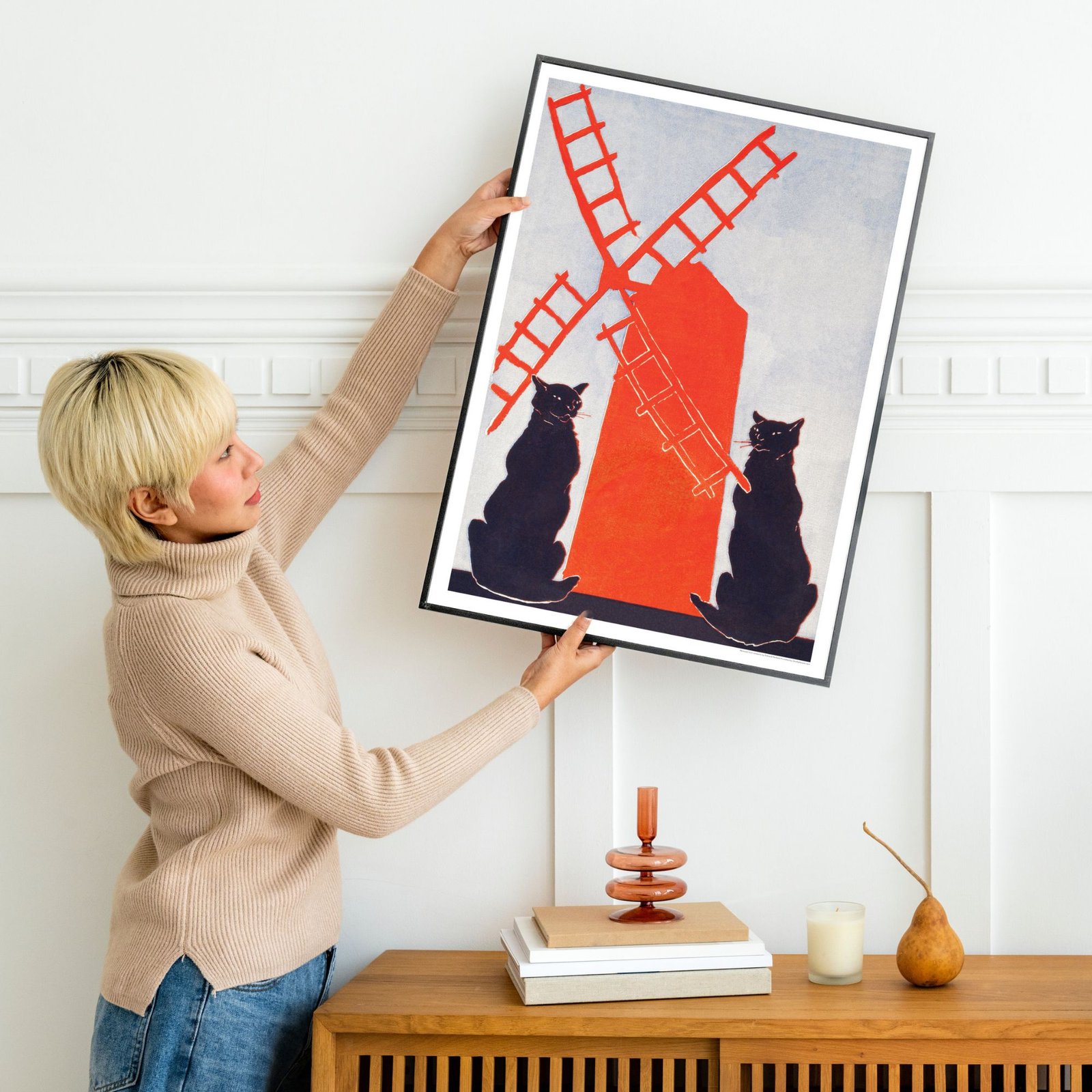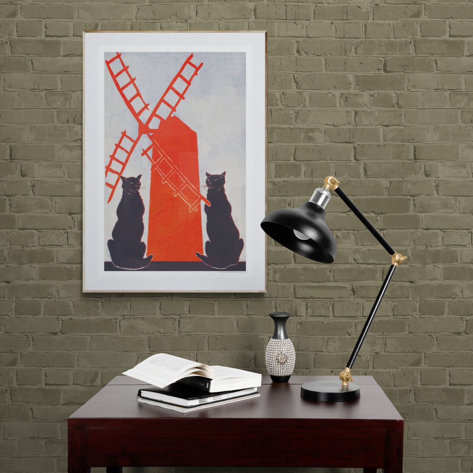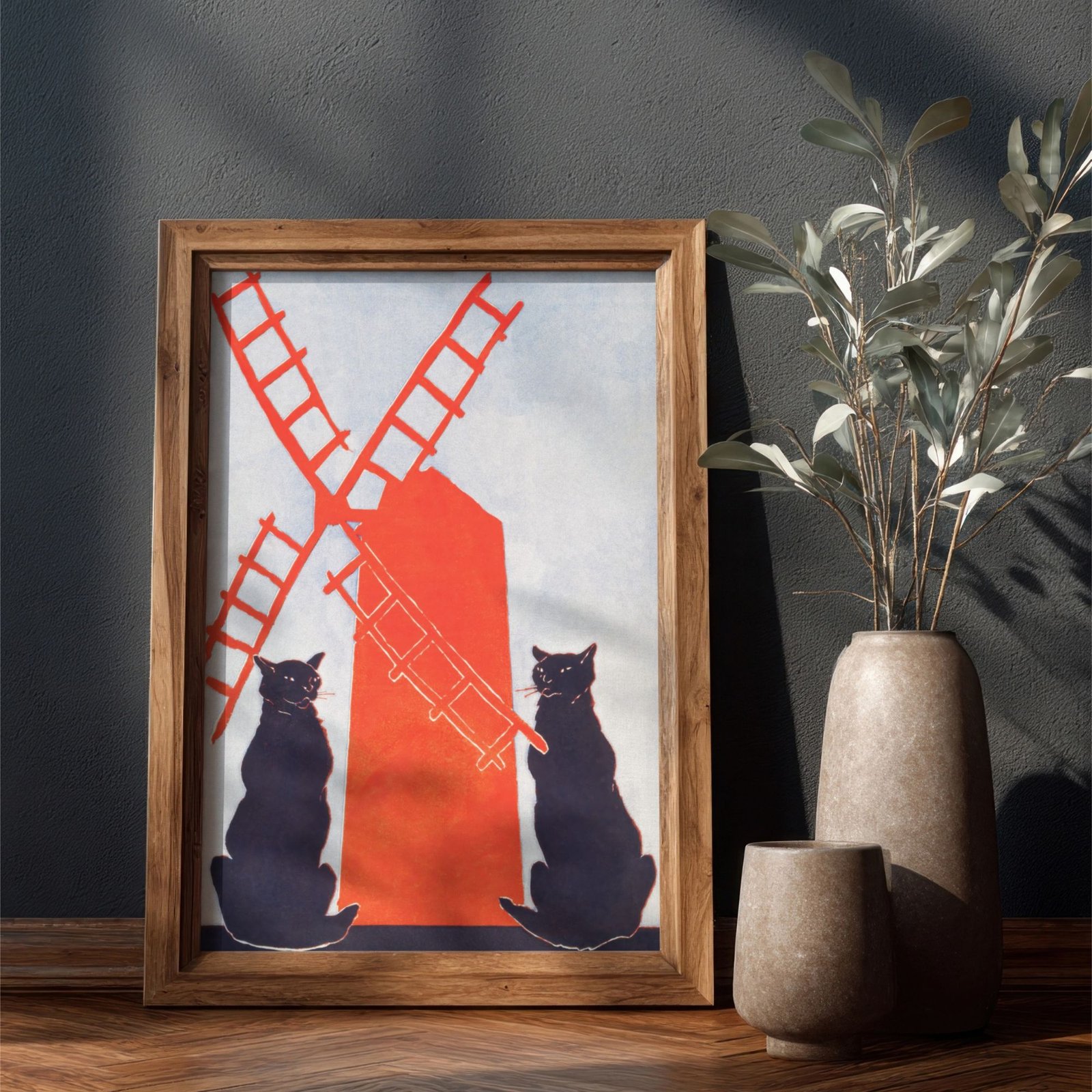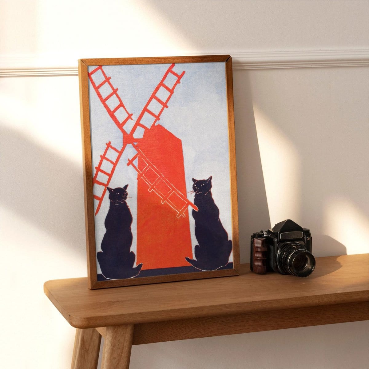 Framed cat painting and vintage camera on shelfEdward Penfield – Black Cats & Windmill