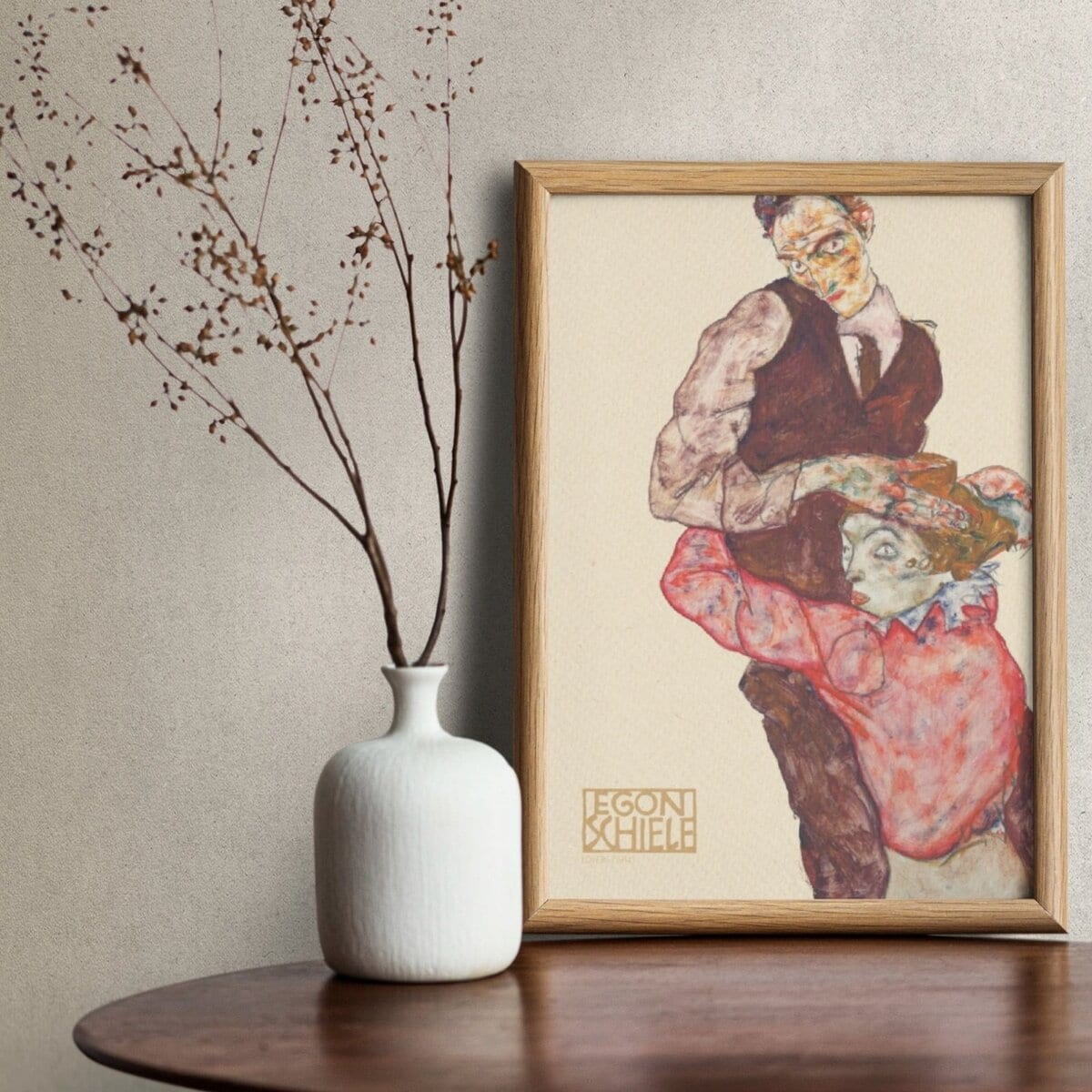 Egon Schiele painting framed on table with vaseEgon Schiele – Lovers