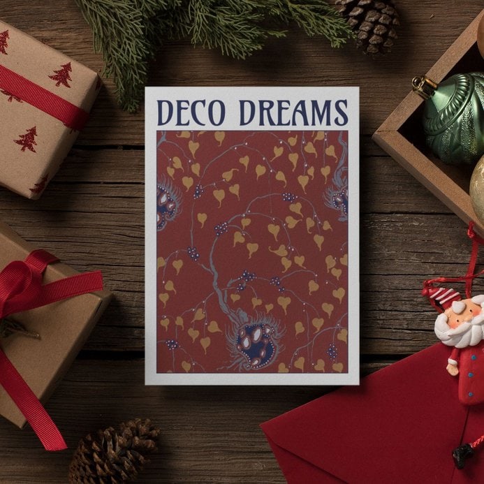 Set of 'Deco Dreams' greeting cards featuring Art Deco-inspired designs by Emile-Allain Séguy. Each card showcases intricate botanical or insect motifs in bold colors, displayed in various settings highlighting their premium quality, texture, and FSC/PEFC certification.Emile-Allain Séguy – Autumn Vines | Set of Greeting Cards