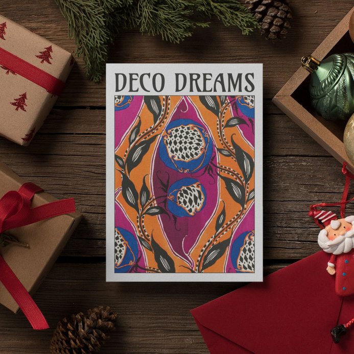 Our Emile-Allain Séguy – Pomegranate Whimsy greeting card set includes 10 folded cards, celebrating Art Nouveau’s bold botanical artistry. The composition features ornate pomegranate-like motifs, woven among flowing vines, vibrant orange and magenta backdrops, and rich black detailing. Inspired by Persian textiles and natural ornamentation, this dynamic pattern captures the playful elegance and decorative movement of early 20th-century design. Printed using the pochoir technique, Séguy’s patterns bring a refined artistic touch to every message.