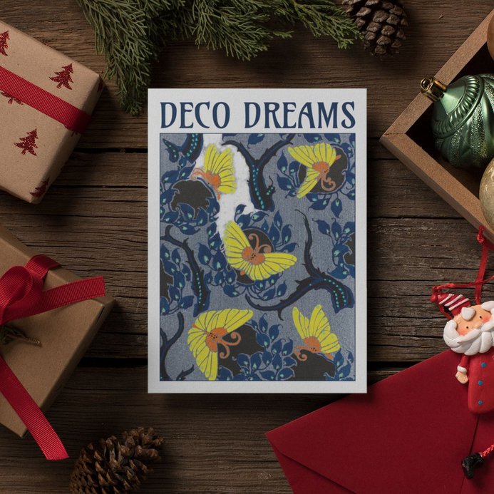 Our Emile-Allain Séguy – Twilight Wings greeting card set includes 10 folded cards, each celebrating the graceful beauty of Art Nouveau ornamentation. Featuring delicate yellow butterflies fluttering among deep blue foliage and twisting black branches, this mesmerizing design evokes the serene elegance of twilight. Inspired by Japanese prints and early 20th-century textile patterns, this composition captures the fluid movement and intricate detailing characteristic of Séguy’s work.