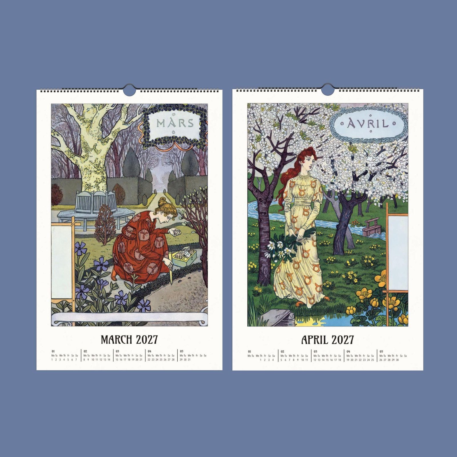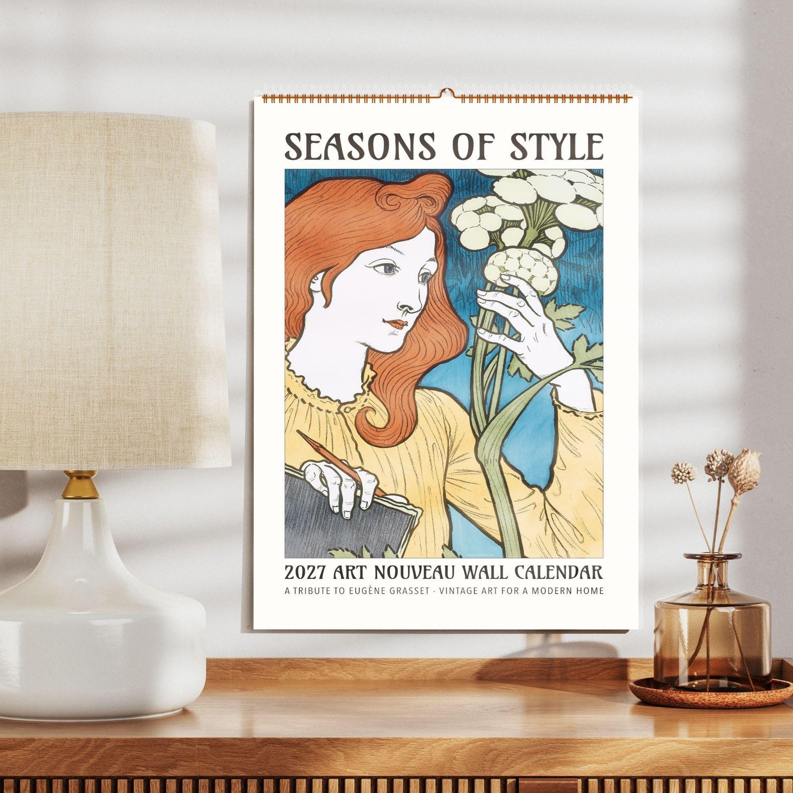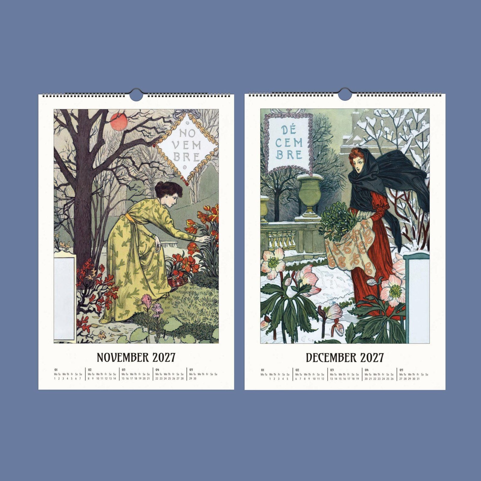 Art Nouveau wall calendar 2027 on wooden table.Eugène Grasset Art Nouveau Calendar