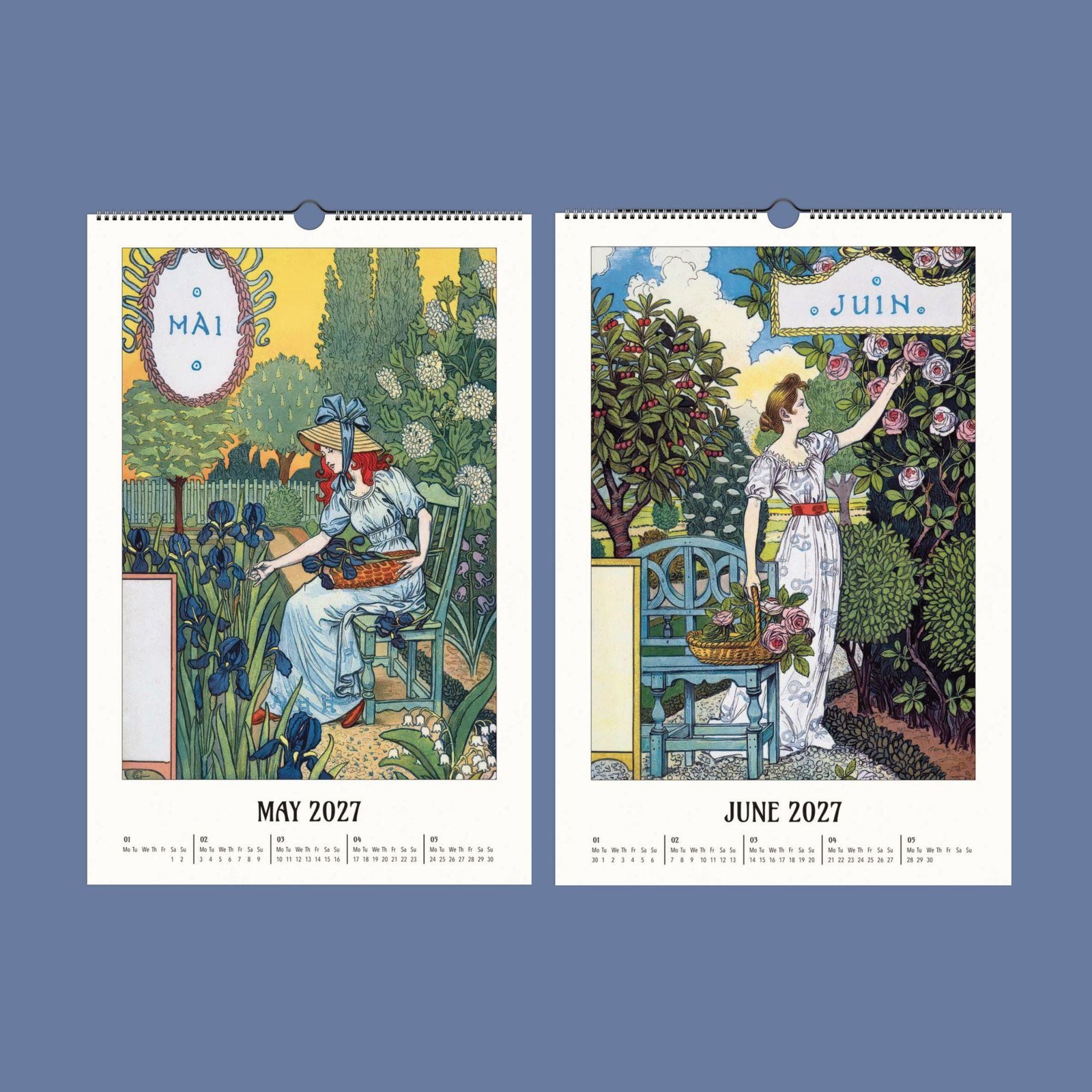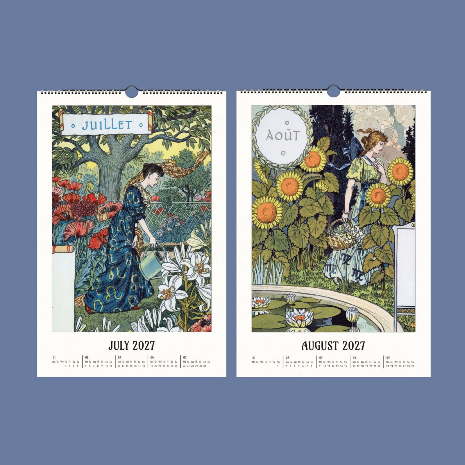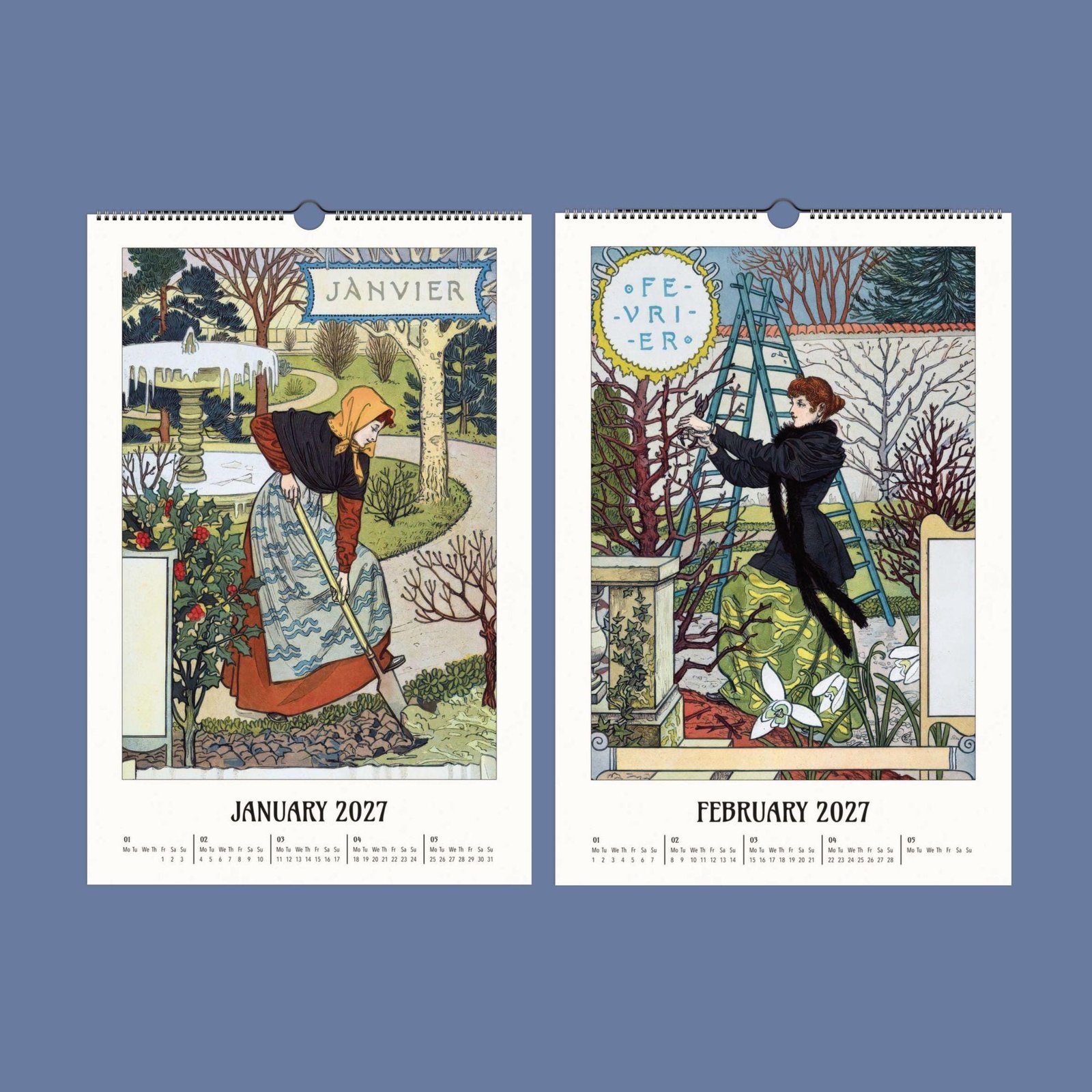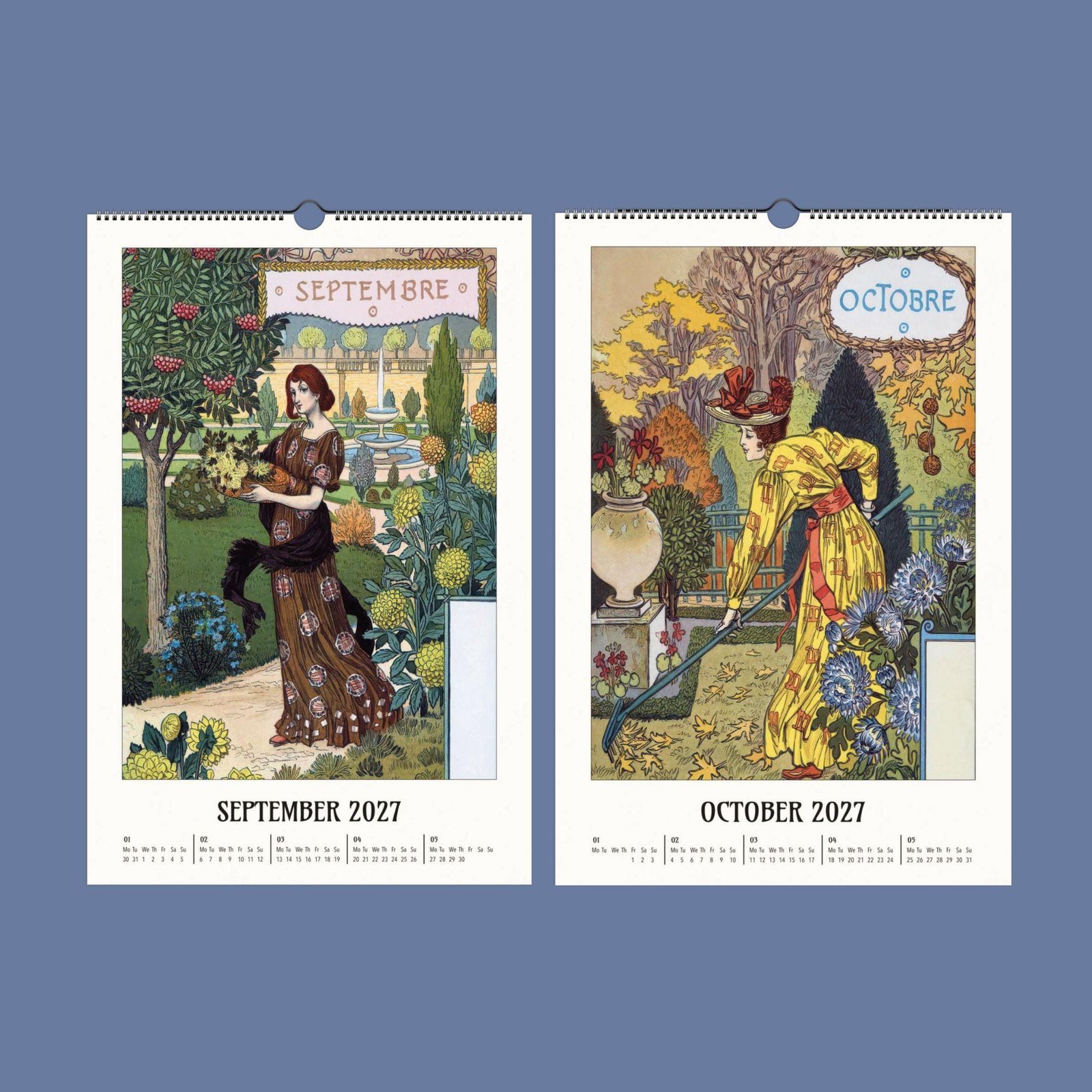 Art Nouveau wall calendar 2027 on wooden table.Eugène Grasset Art Nouveau Calendar