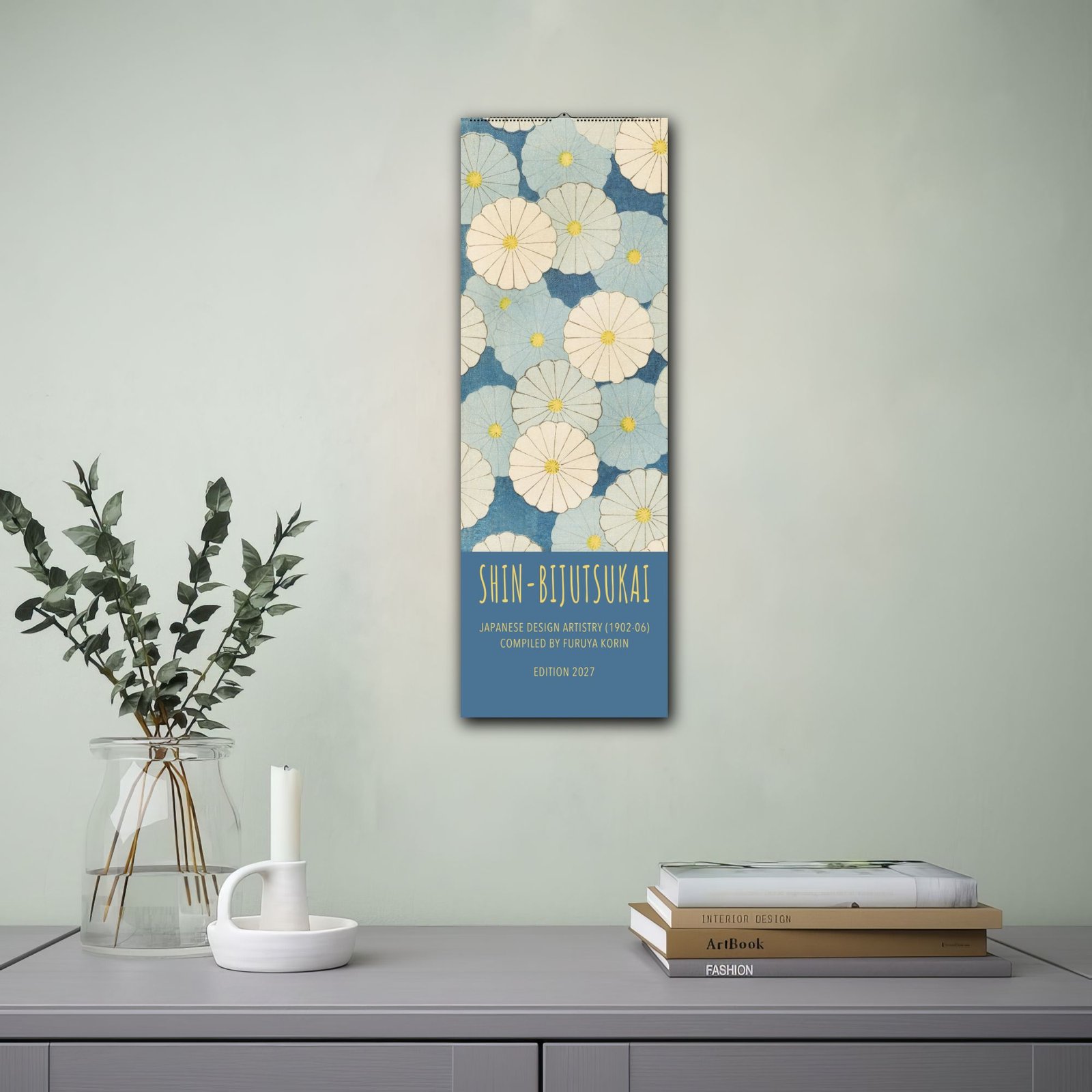 Japanese art book with floral design on wall.Furuya Korin Wall Calendar – Japanese Artist