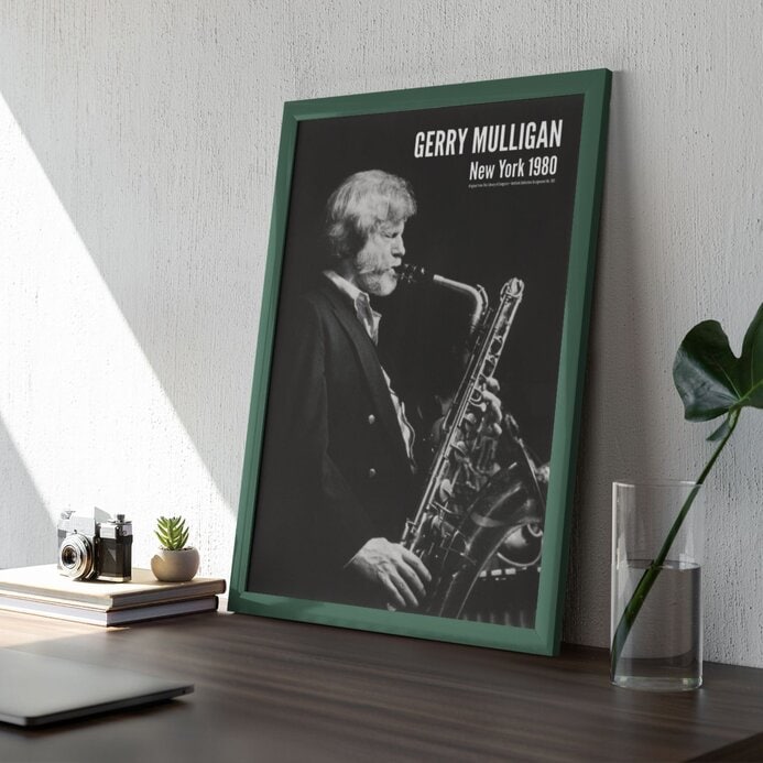 Gerry Mulligan (1927–1996) was an American jazz saxophonist, composer, and arranger celebrated for his cool jazz sophistication and his warm, lyrical baritone sound. A true architect of West Coast jazz, Mulligan helped define an era with inventive writing, effortless swing, and a style that felt both relaxed and razor-sharp. This music poster features a striking portrait of Mulligan captured by William P. Gottlieb in 1980, showing him mid-performance—focused, expressive, and completely at home with his baritone saxophone.