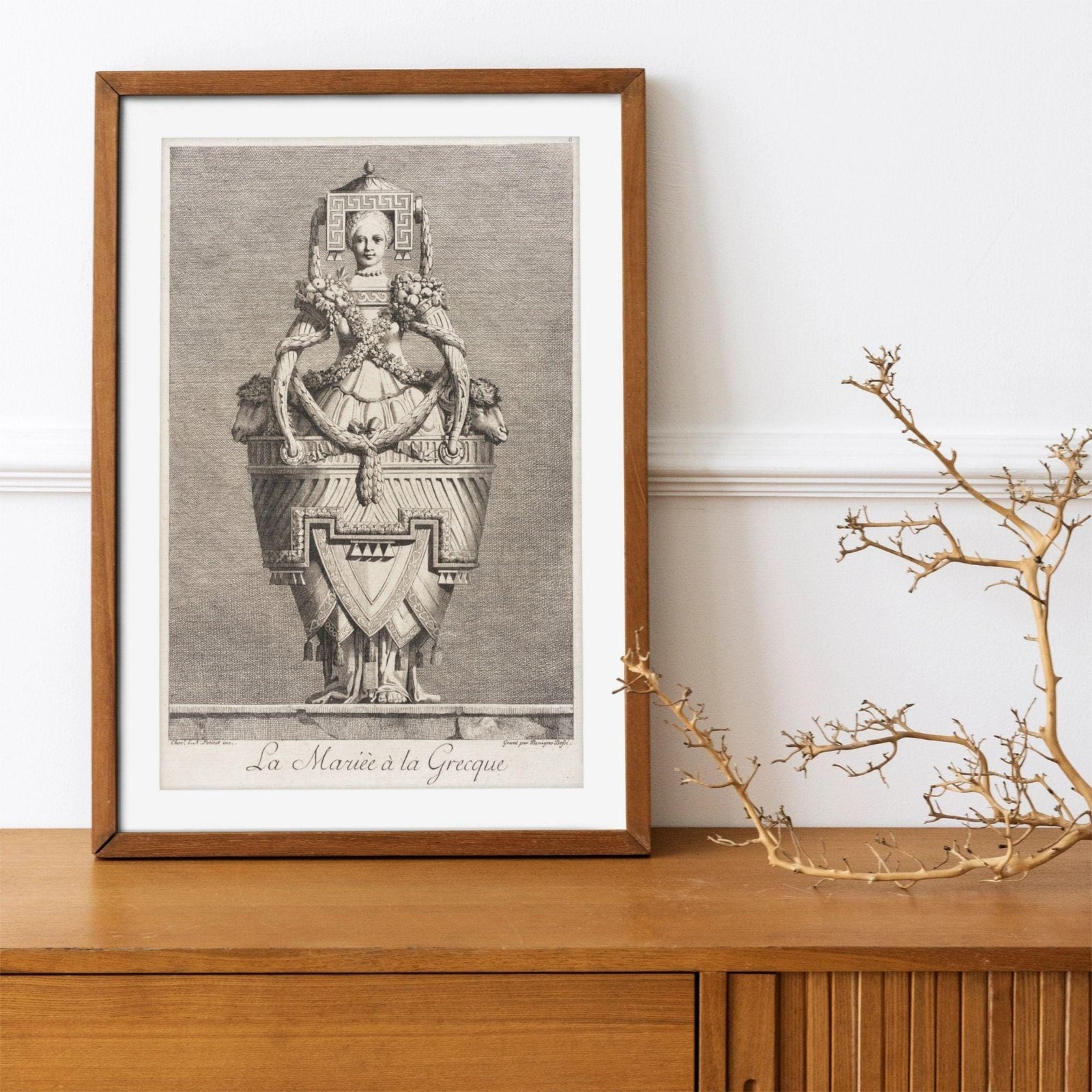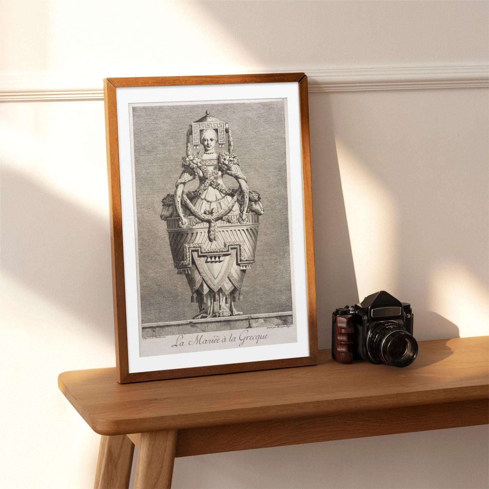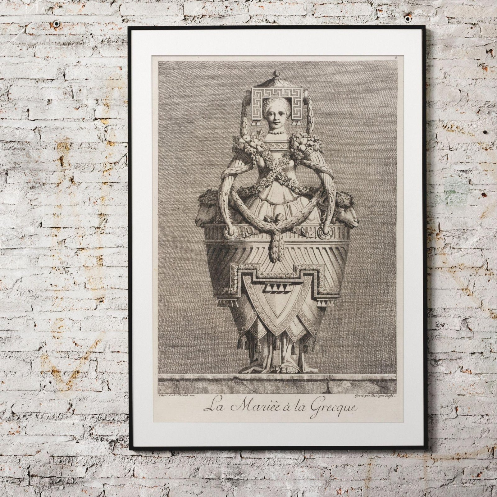 Framed artwork depicting intricate ancient Greek sculpture.Greek Mythology – Masquerade Bride Poster