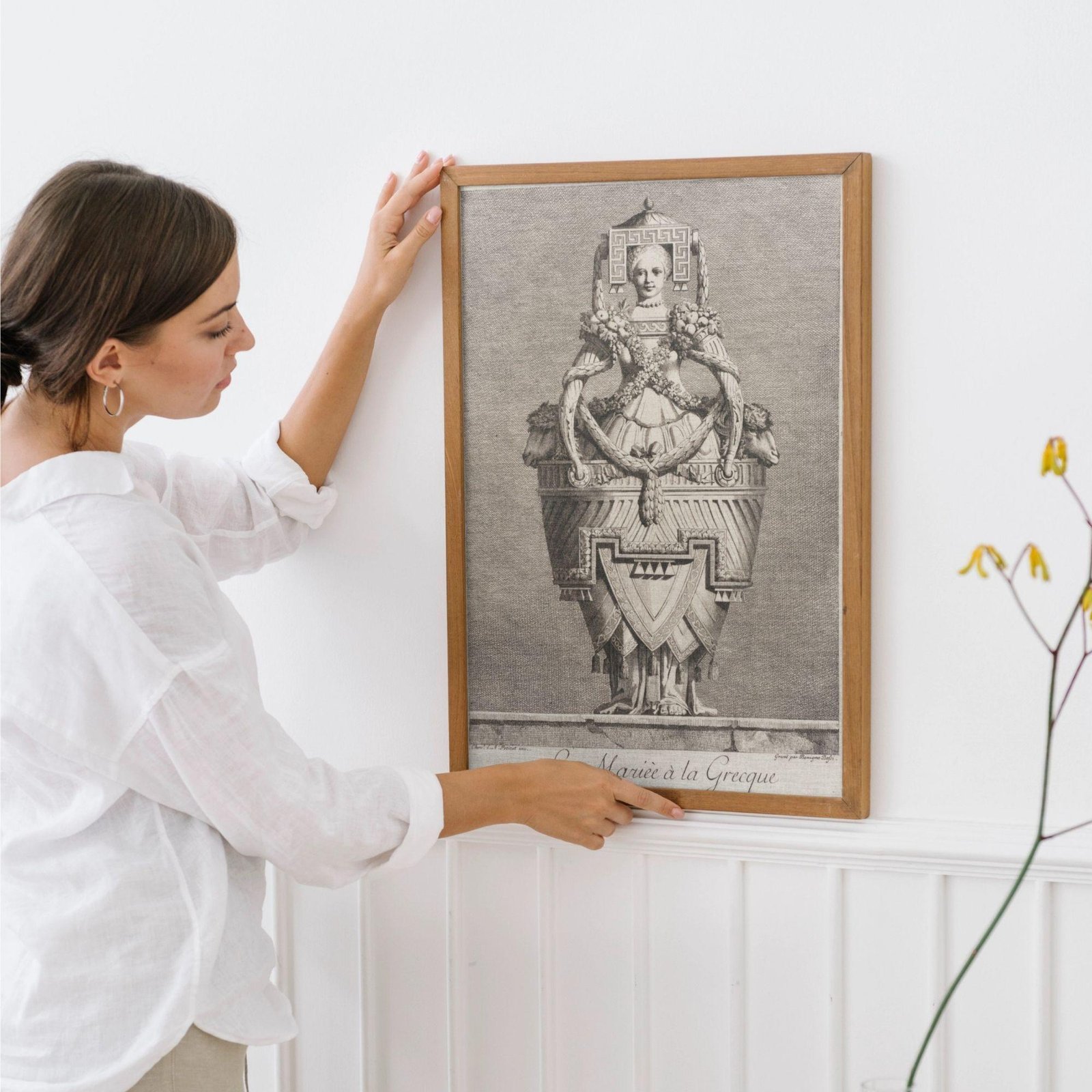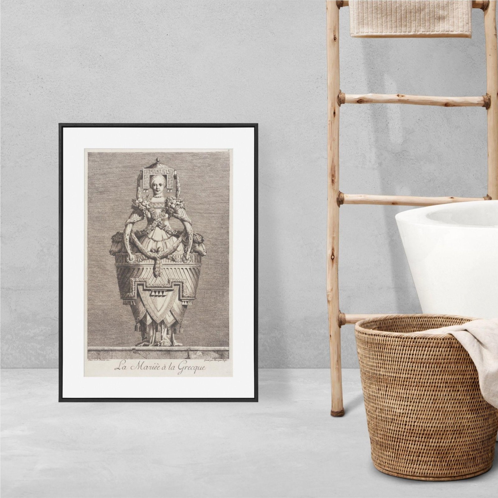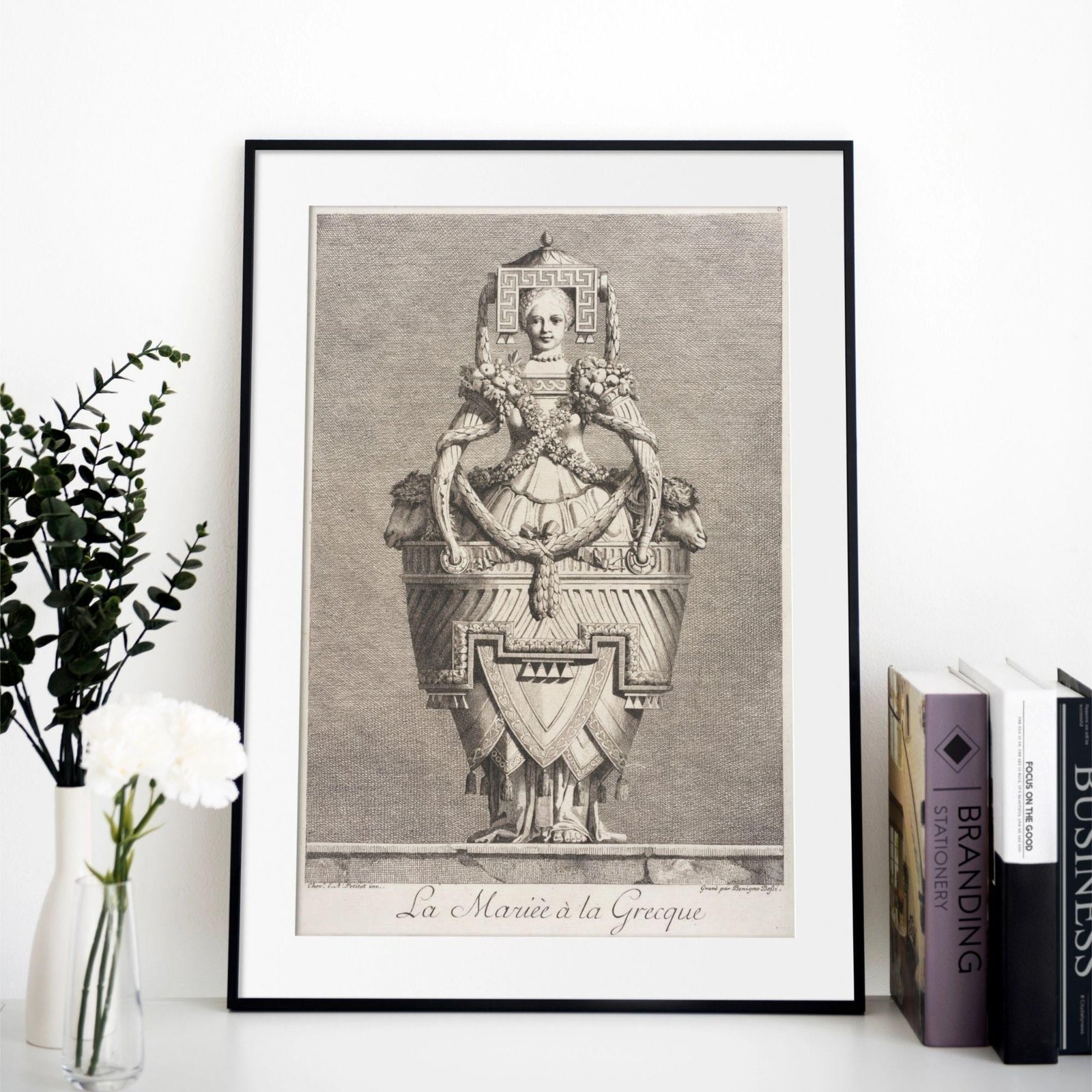 Framed artwork depicting intricate ancient Greek sculpture.Greek Mythology – Masquerade Bride Poster
