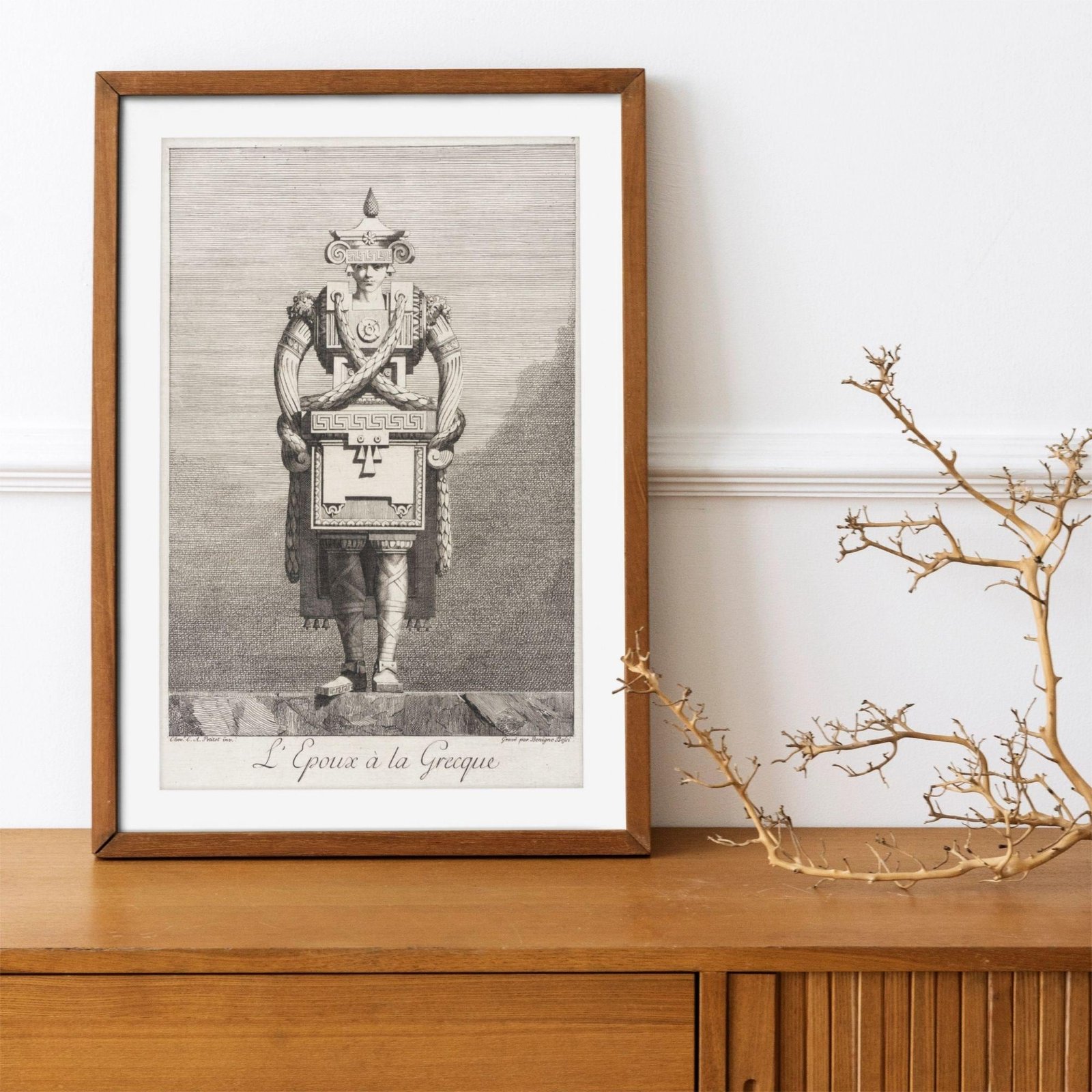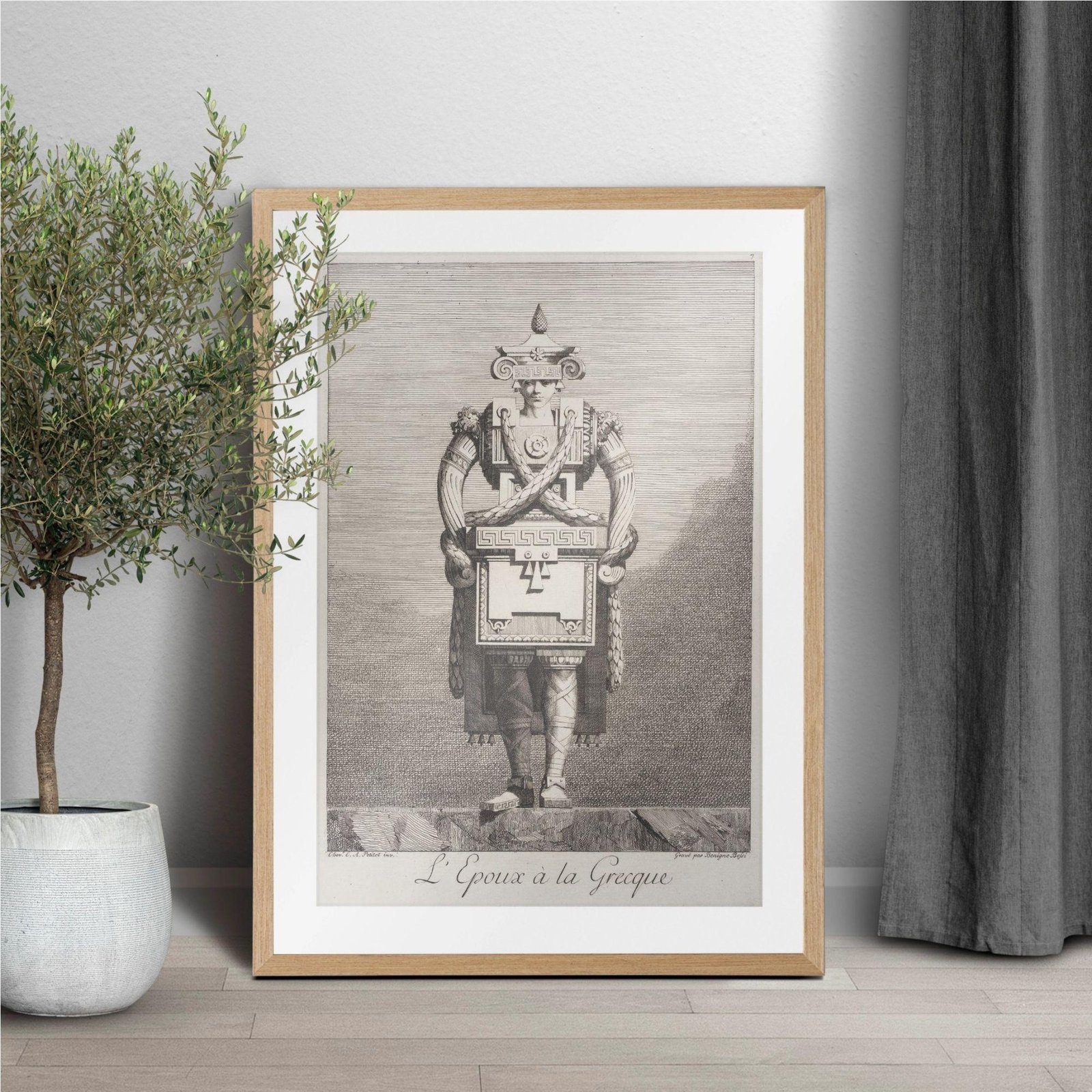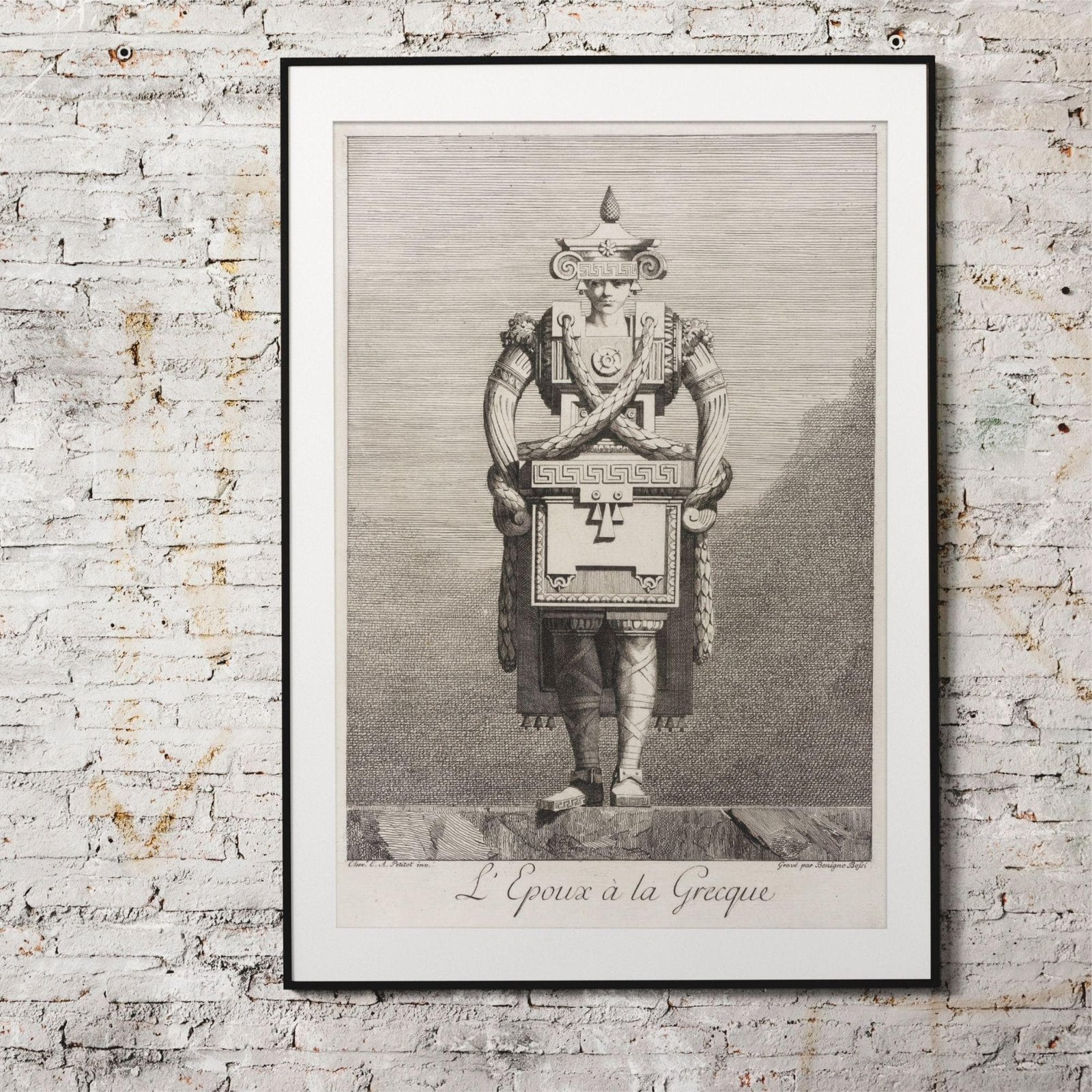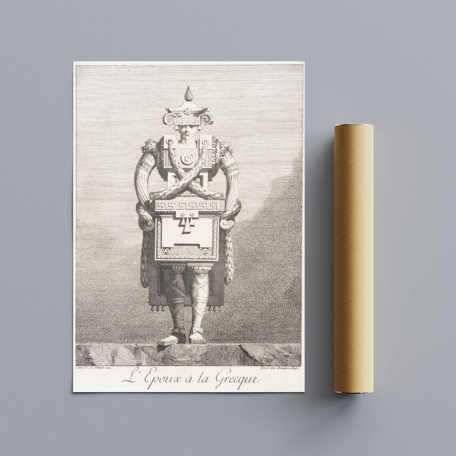 Step into a world where greek mythology and ancient greece meet the whimsical “goût grec” of the eighteenth century. This greek masquerade poster captures a unique moment in art history where greek sculpture and greek statues were reimagined through a lens of architectural fantasy and satirical wit. Inspired by the “Greek taste” that swept through neoclassical circles, these designs by Ennemond Alexandre Petitot (1727-1801) transform the human form into living monuments, blending the elegance of greek goddesses with playful, structural motifs like meander patterns and ionic scrolls. It is a masterpiece of ingenuity that perfectly embodies the light academia aesthetic, celebrating both ancient greek art and the human inclination toward fantasy.