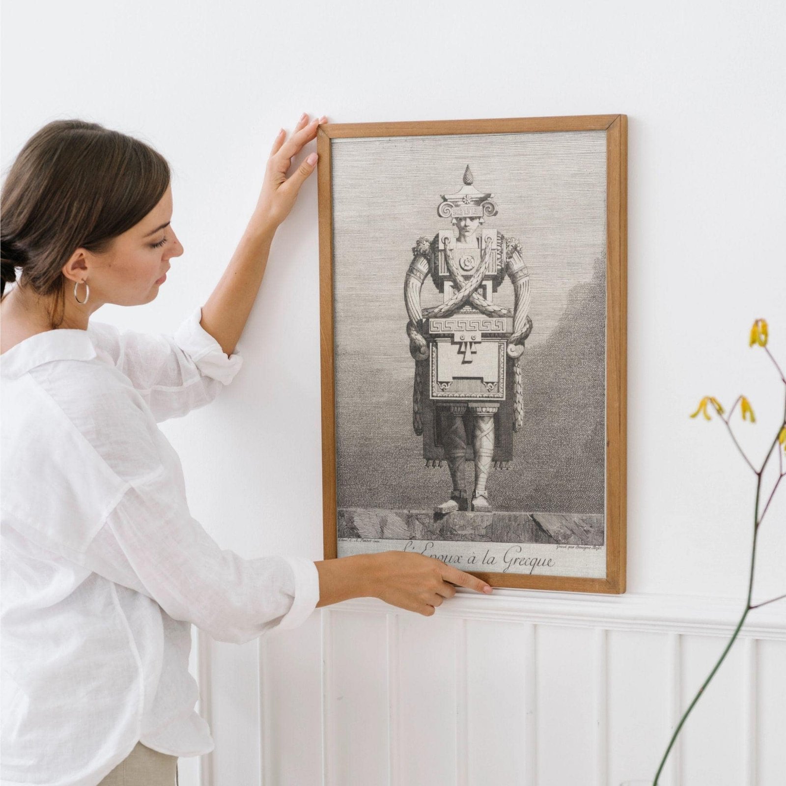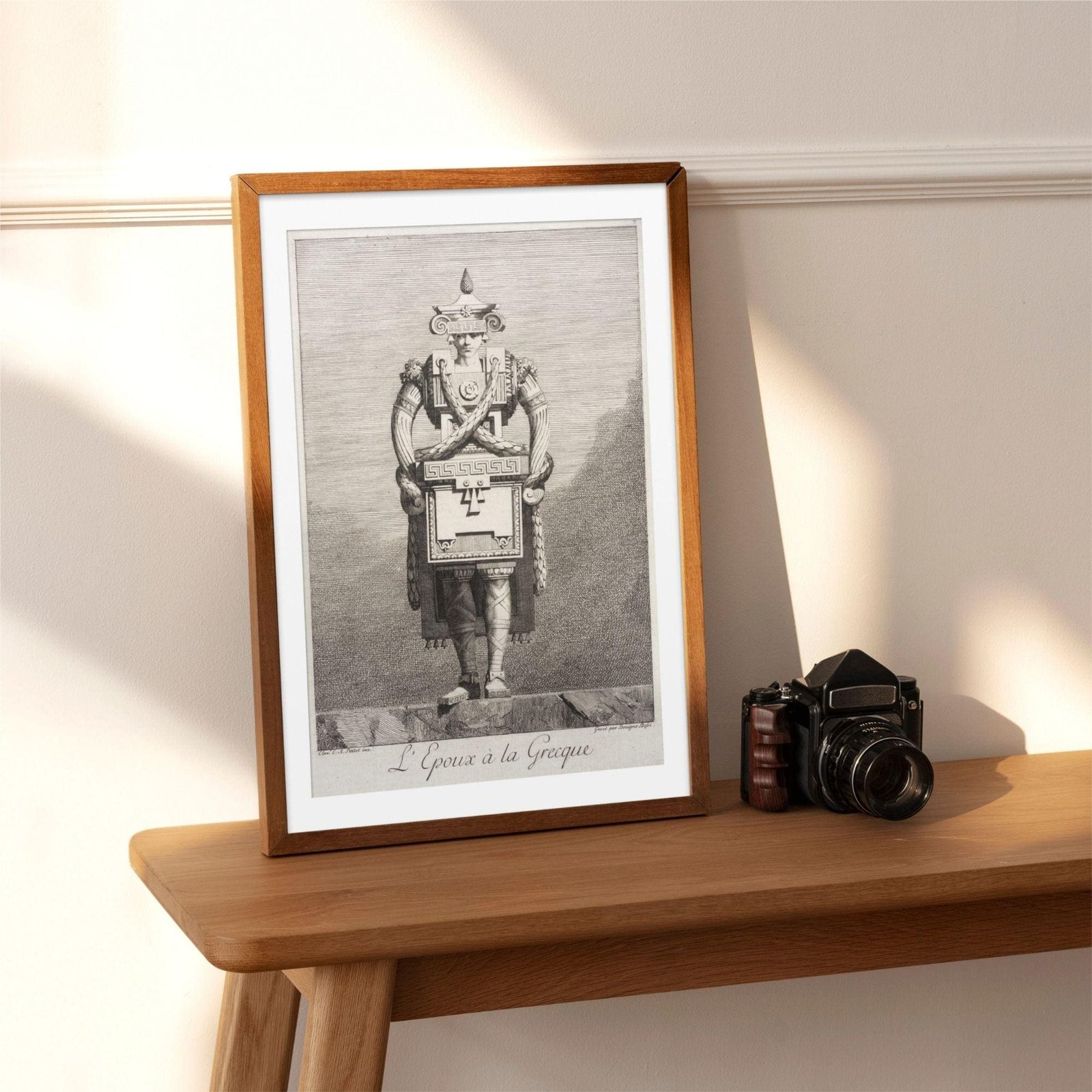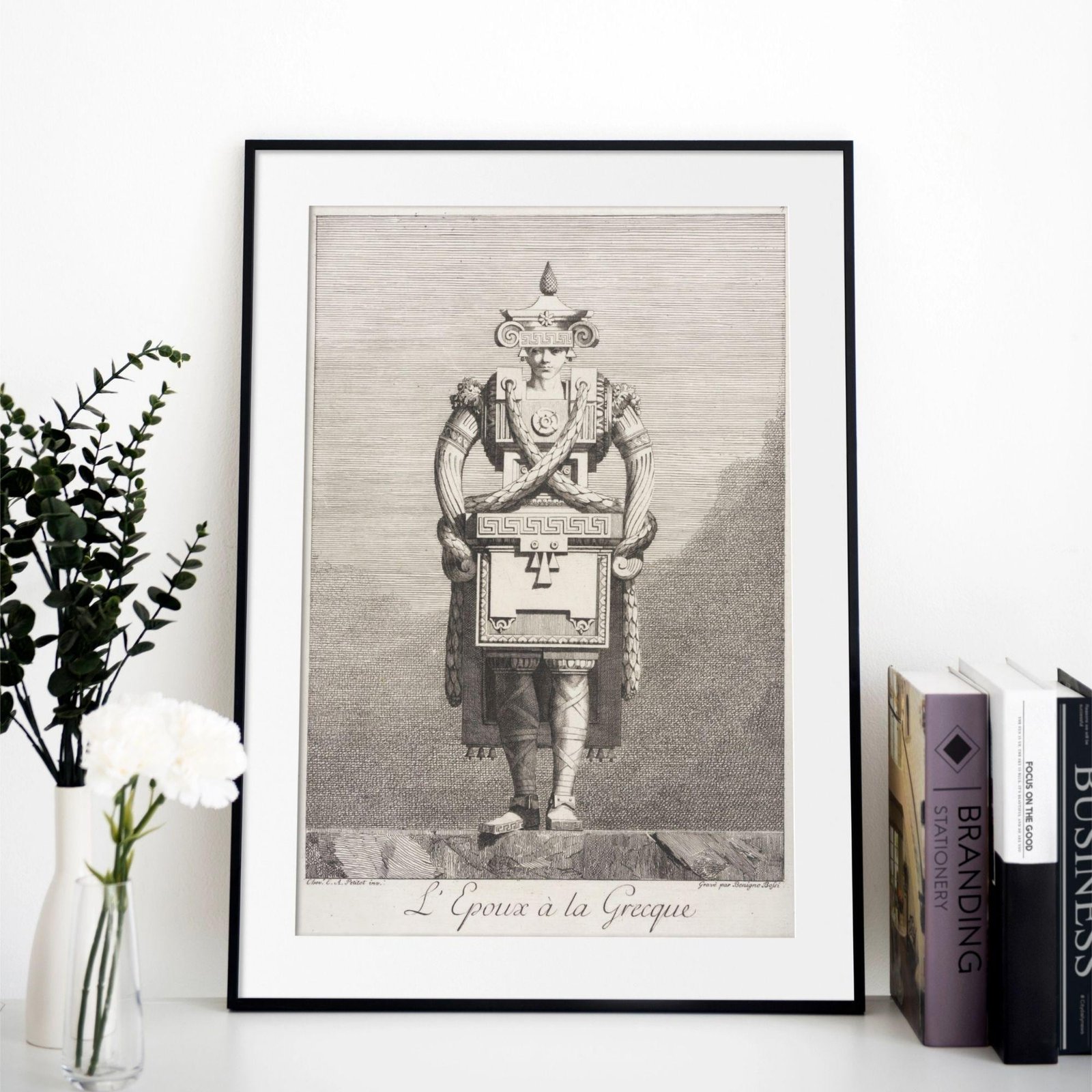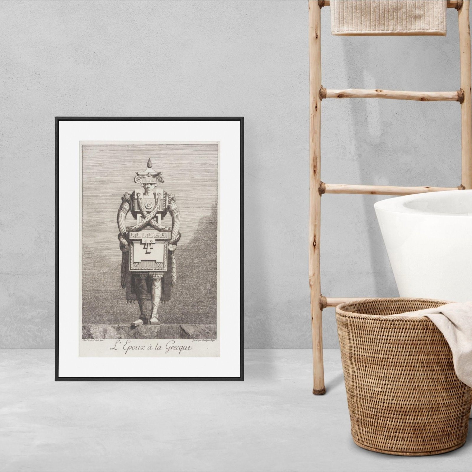 Step into a world where greek mythology and ancient greece meet the whimsical “goût grec” of the eighteenth century. This greek masquerade poster captures a unique moment in art history where greek sculpture and greek statues were reimagined through a lens of architectural fantasy and satirical wit. Inspired by the “Greek taste” that swept through neoclassical circles, these designs by Ennemond Alexandre Petitot (1727-1801) transform the human form into living monuments, blending the elegance of greek goddesses with playful, structural motifs like meander patterns and ionic scrolls. It is a masterpiece of ingenuity that perfectly embodies the light academia aesthetic, celebrating both ancient greek art and the human inclination toward fantasy.