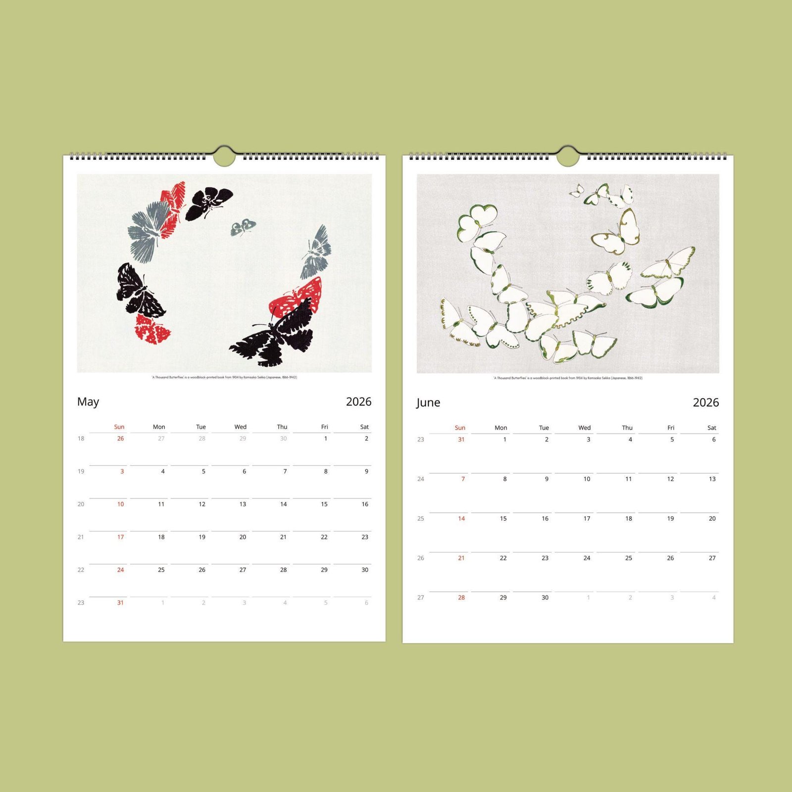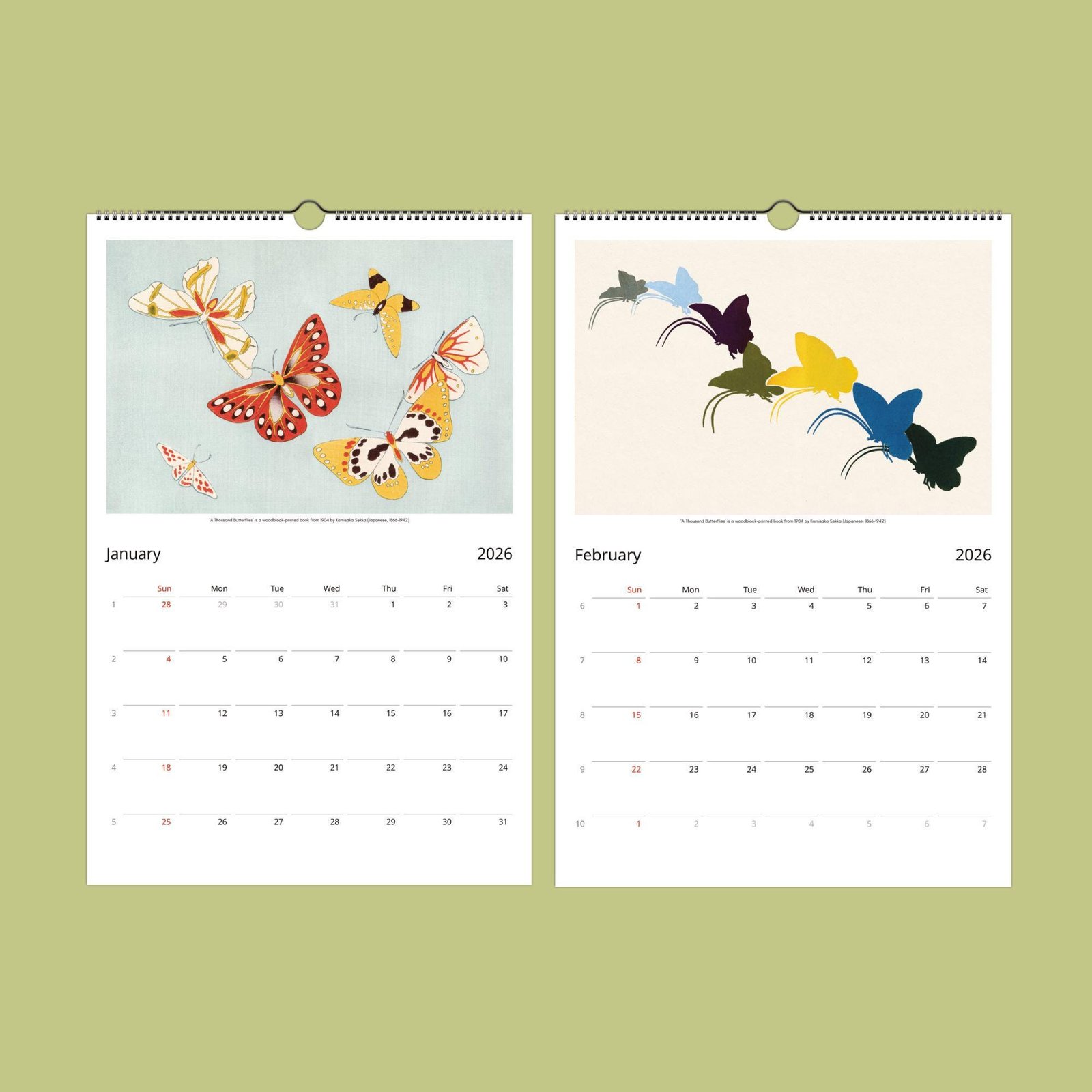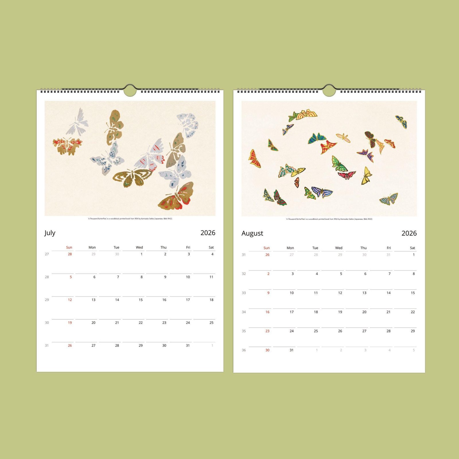 Each month showcases a thoughtfully curated selection of Sekka’s most enchanting butterfly images, chosen to highlight his artistry and the beauty of Japanese woodblock prints. More than just a calendar, this piece is sure to spark conversation and admiration wherever it hangs. When the year comes to a close, simply cut out the images and frame them—perfect for adding a touch of elegance to your own space or gifting unique art to friends and loved ones.