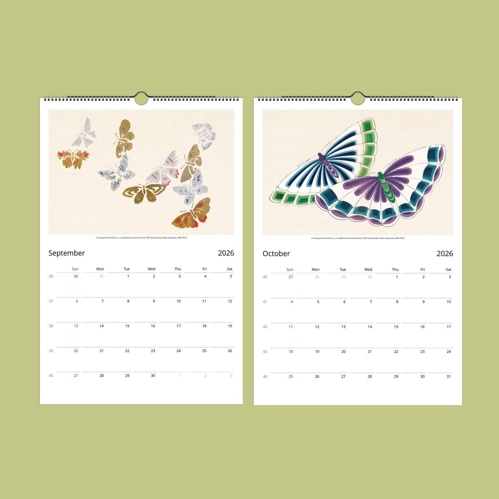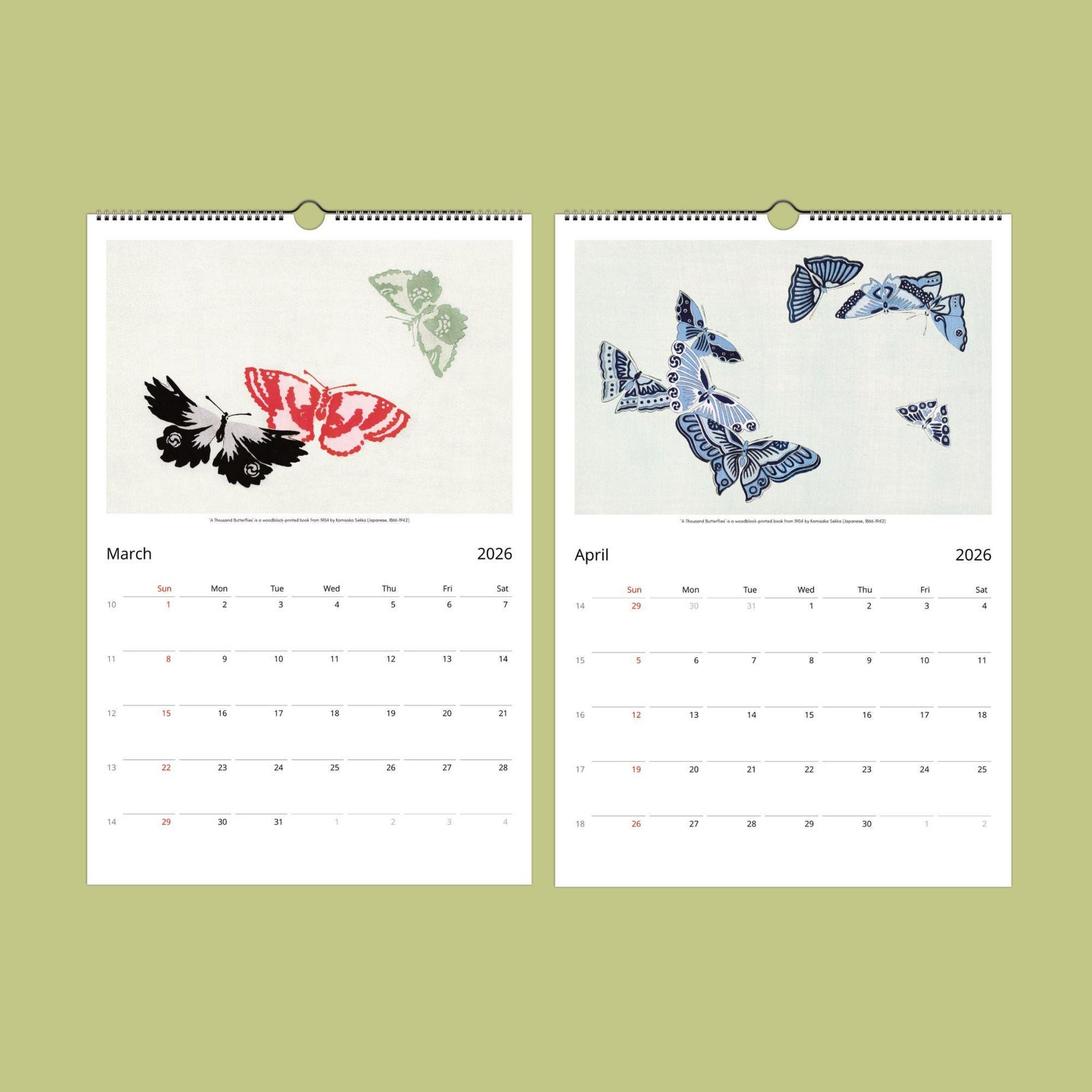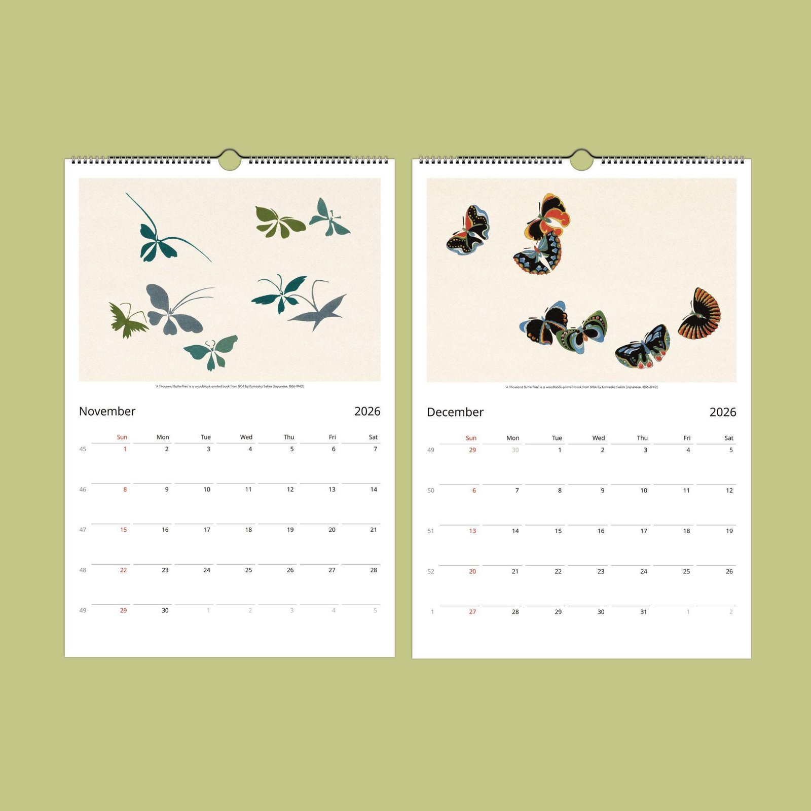 Each month showcases a thoughtfully curated selection of Sekka’s most enchanting butterfly images, chosen to highlight his artistry and the beauty of Japanese woodblock prints. More than just a calendar, this piece is sure to spark conversation and admiration wherever it hangs. When the year comes to a close, simply cut out the images and frame them—perfect for adding a touch of elegance to your own space or gifting unique art to friends and loved ones.