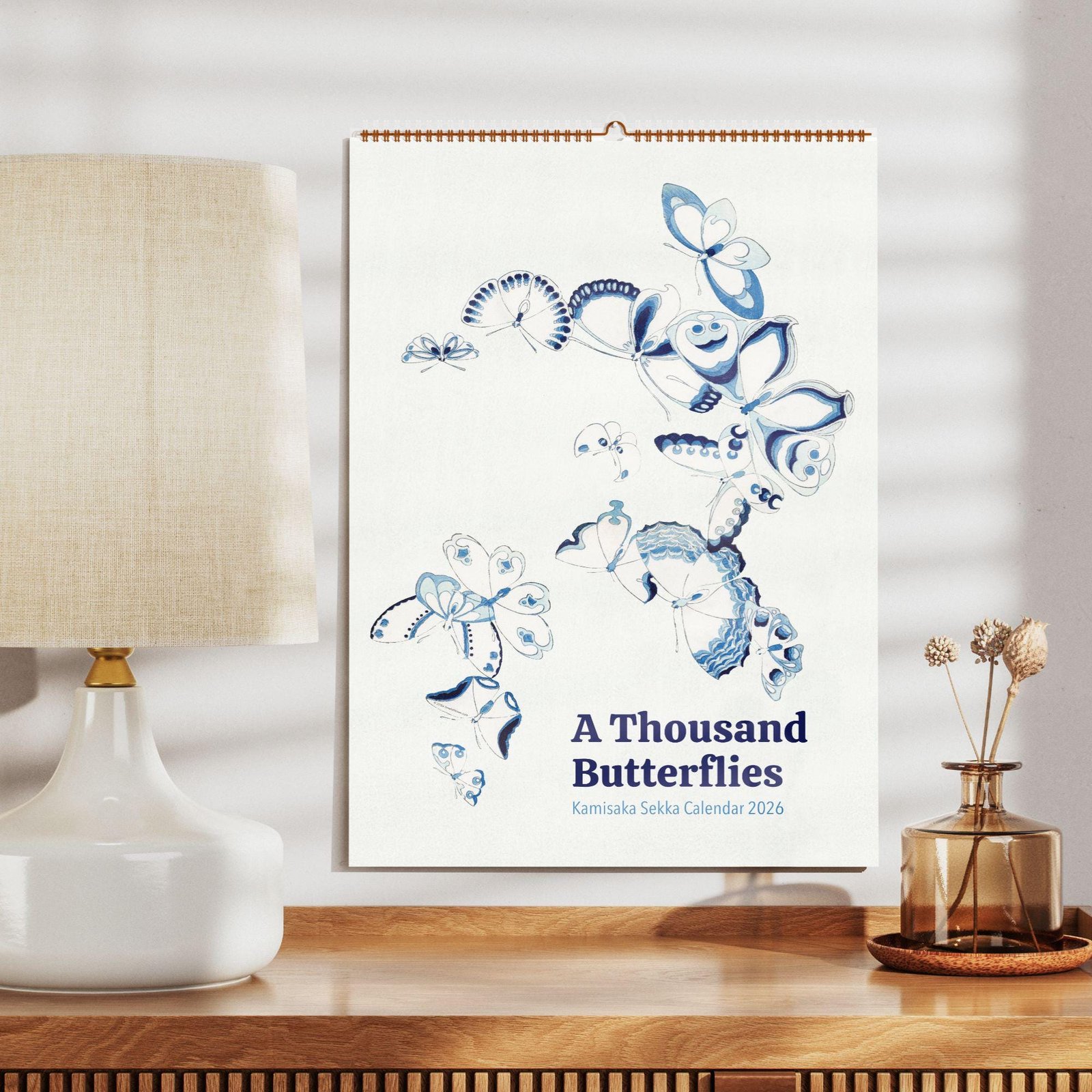 Blue butterfly calendar on a wooden shelf.Kamisaka Sekka Wall Calendar – Japanese Woodblock, Painting Butterfly