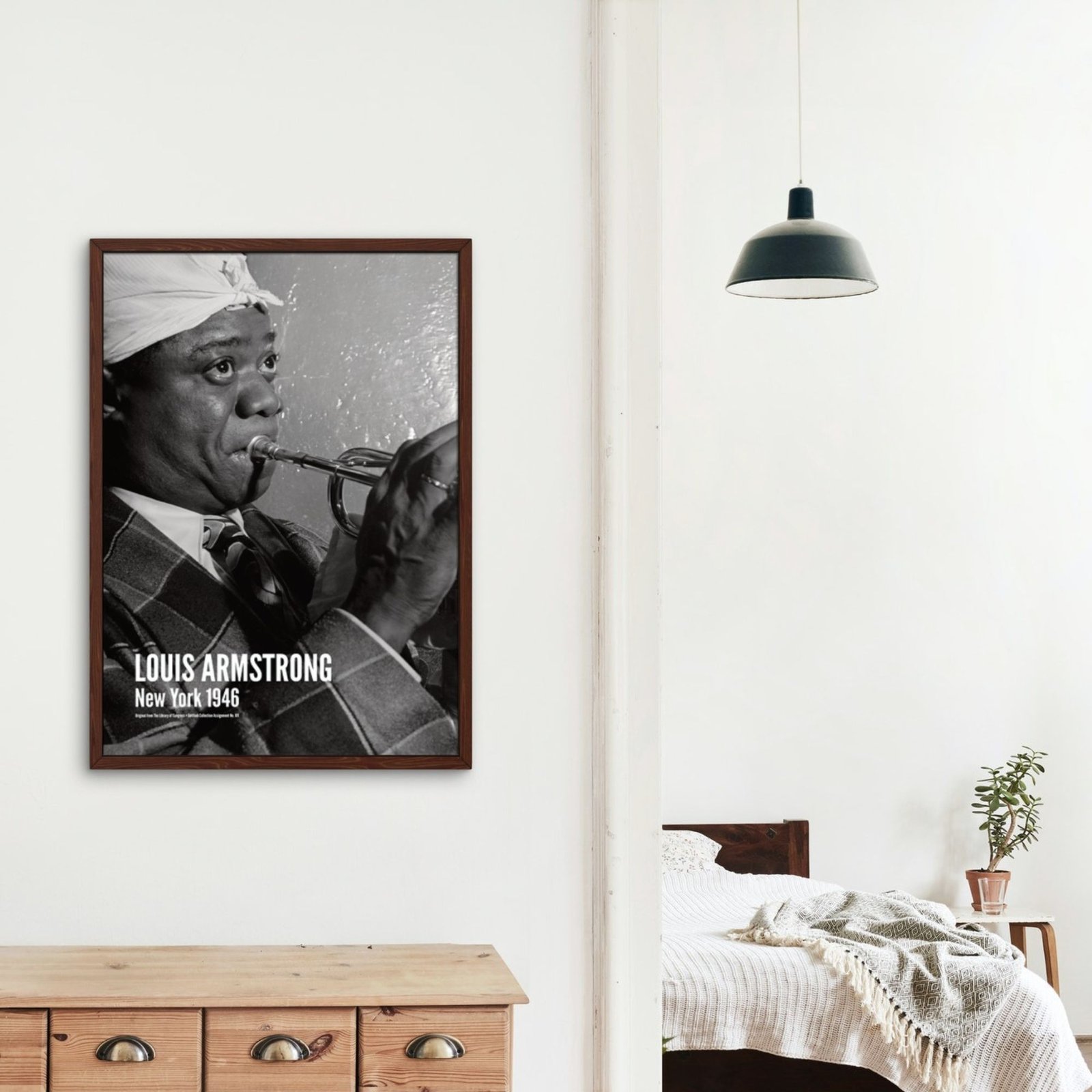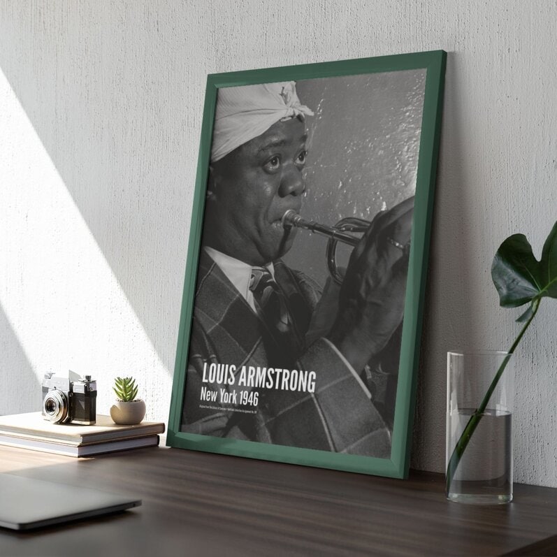 Framed photo of musician playing trumpet, vintage style.Louis Armstrong – Jazz Music Poster, New York City 1946