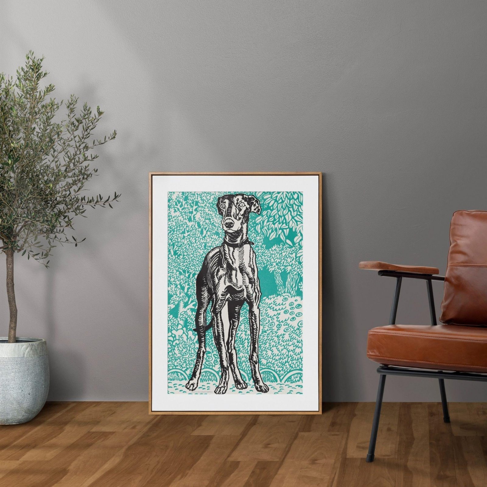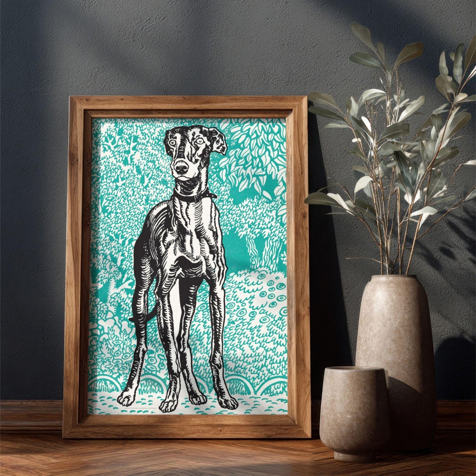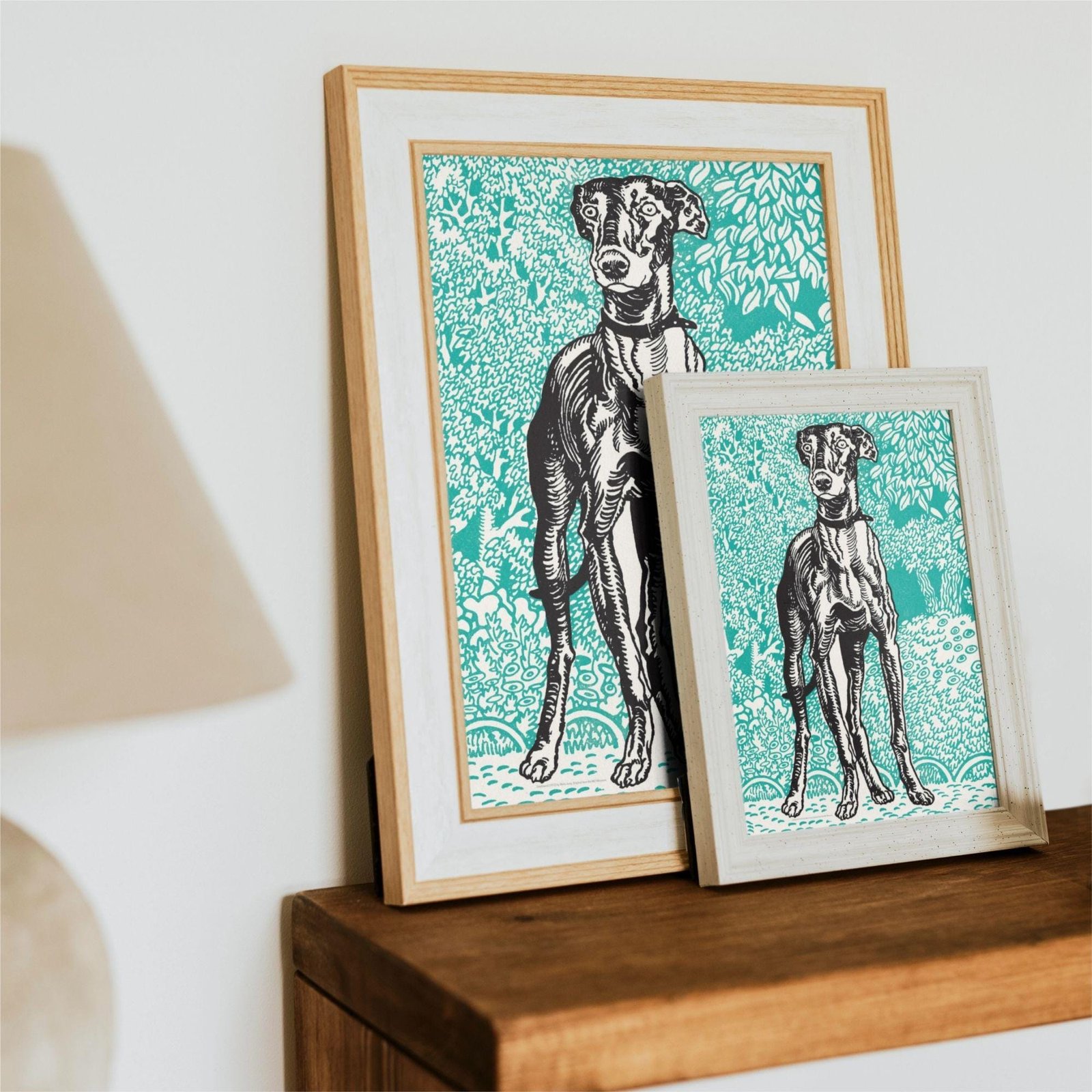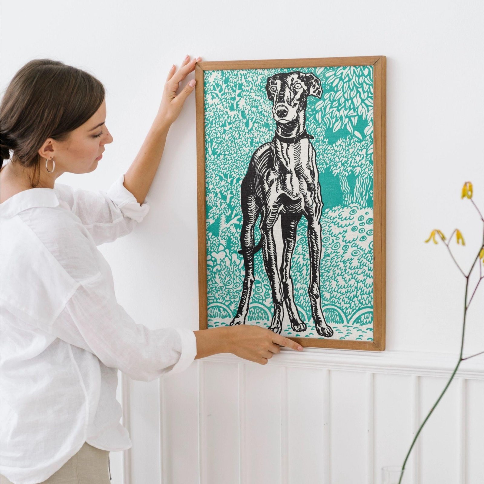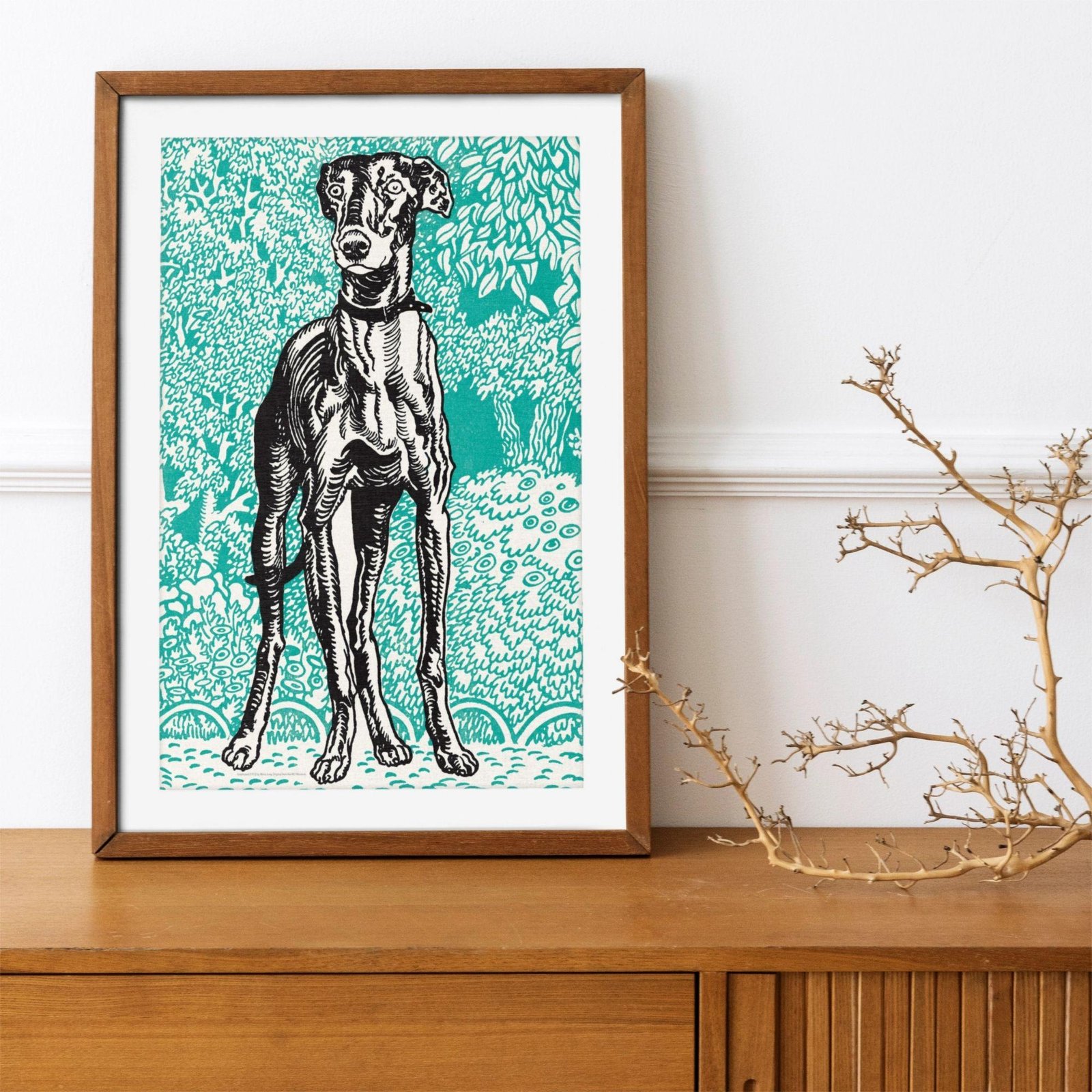 Meet this cute Greyhound—a charming woodcut-style art print by Moriz Jung, a celebrated Austrian artist known for playful, character-filled animal designs. Ready to frame, this dog art print adds warmth to your space and makes a standout choice for living room wall art and thoughtful gifting.