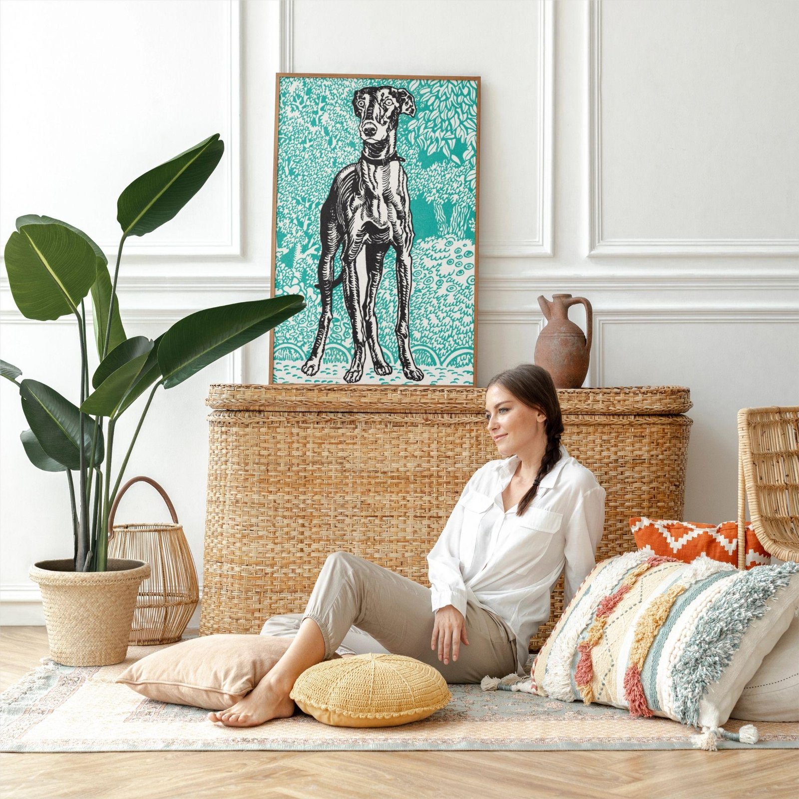 Dog print in wooden frame on wicker cabinetMoriz Jung – Greyhound Woodcut Print