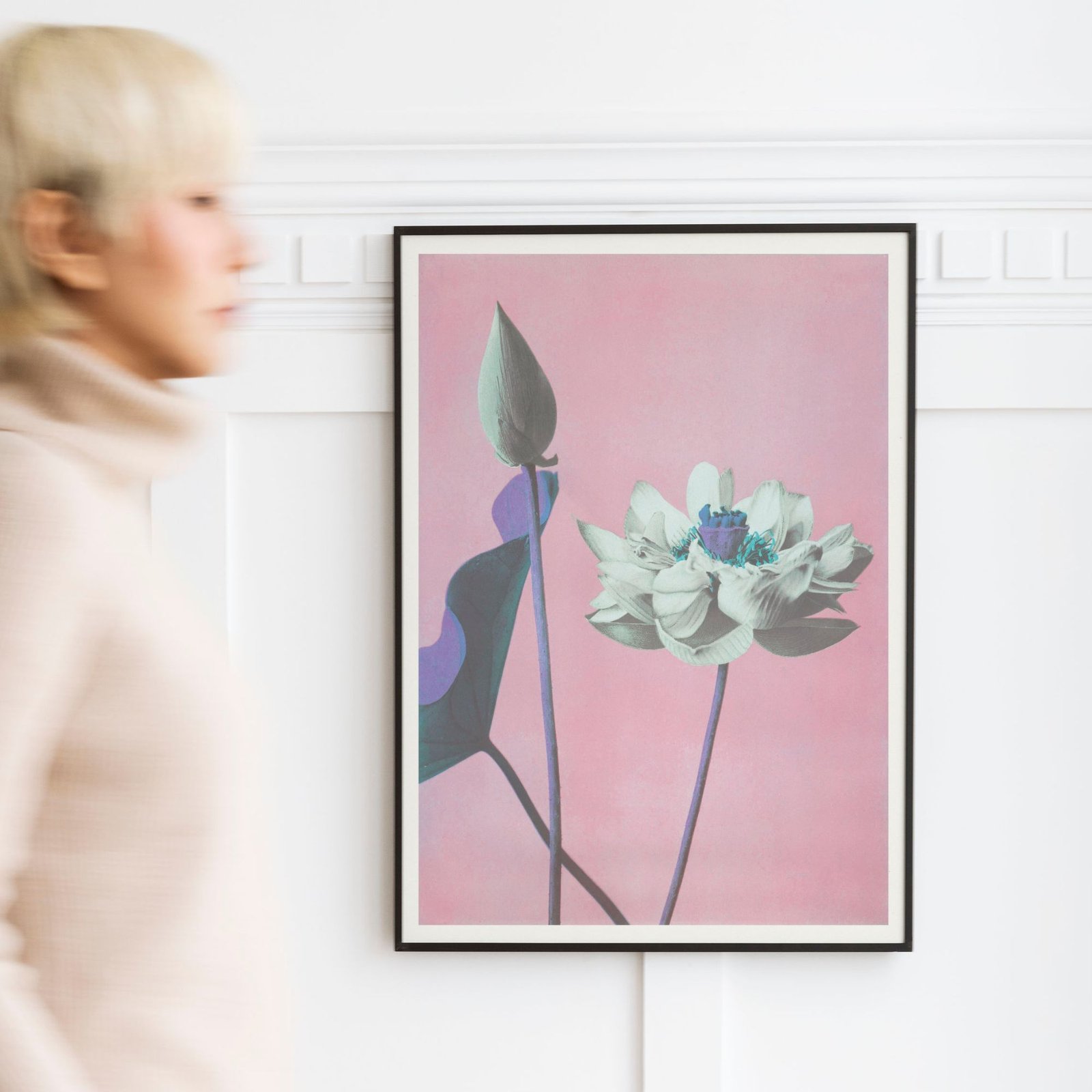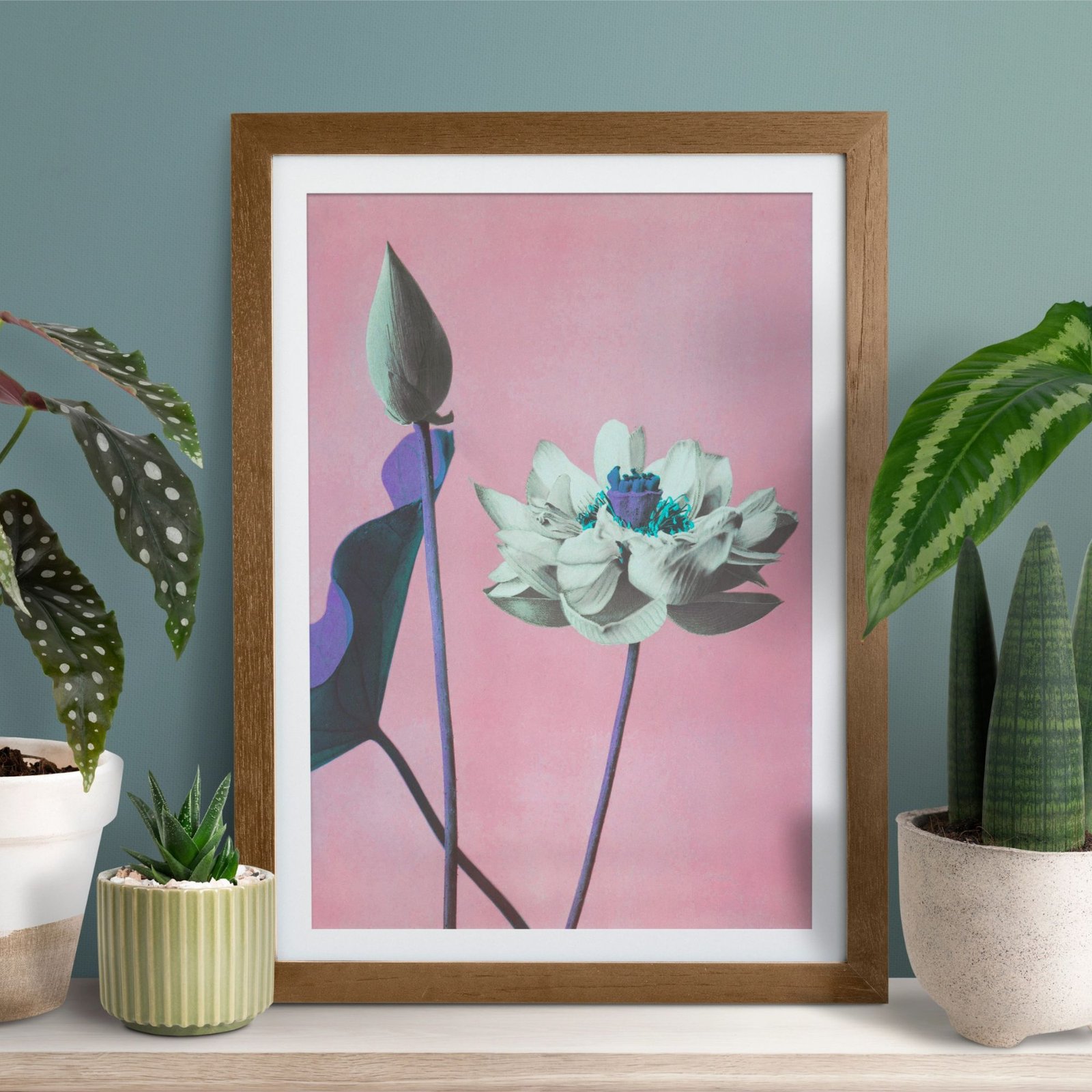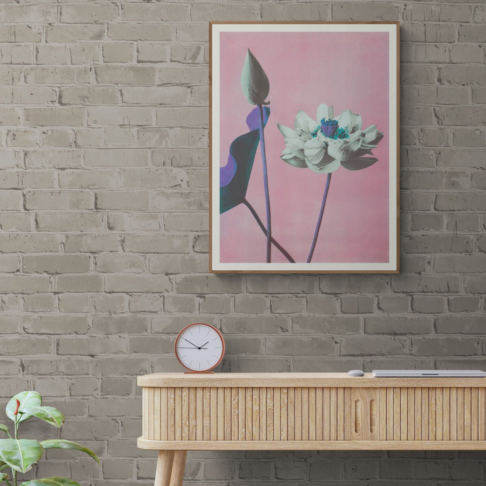 Framed flower artwork on pink background near potted plant.Ogawa Kazumasa – Japanese Flower Art, Lotus Pink