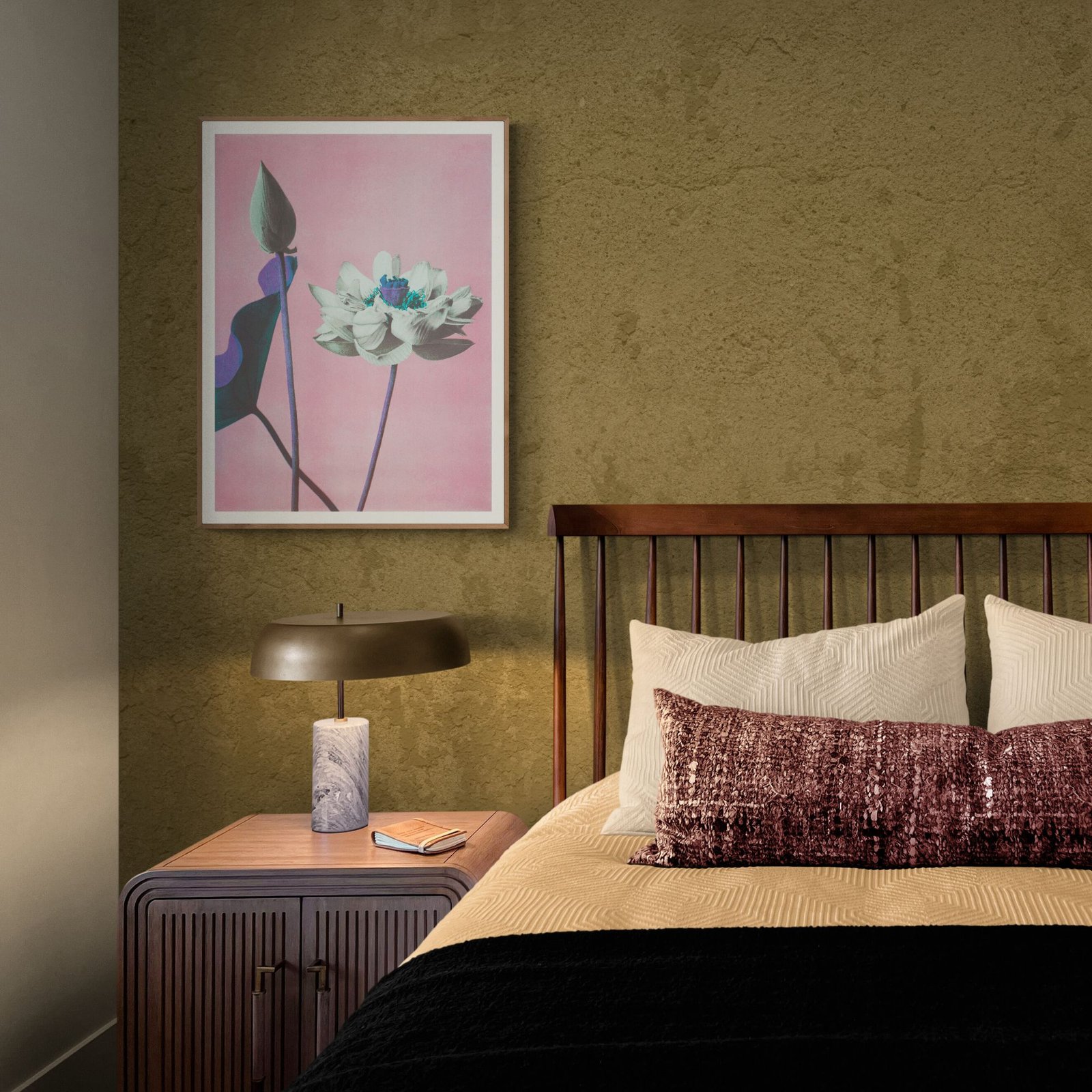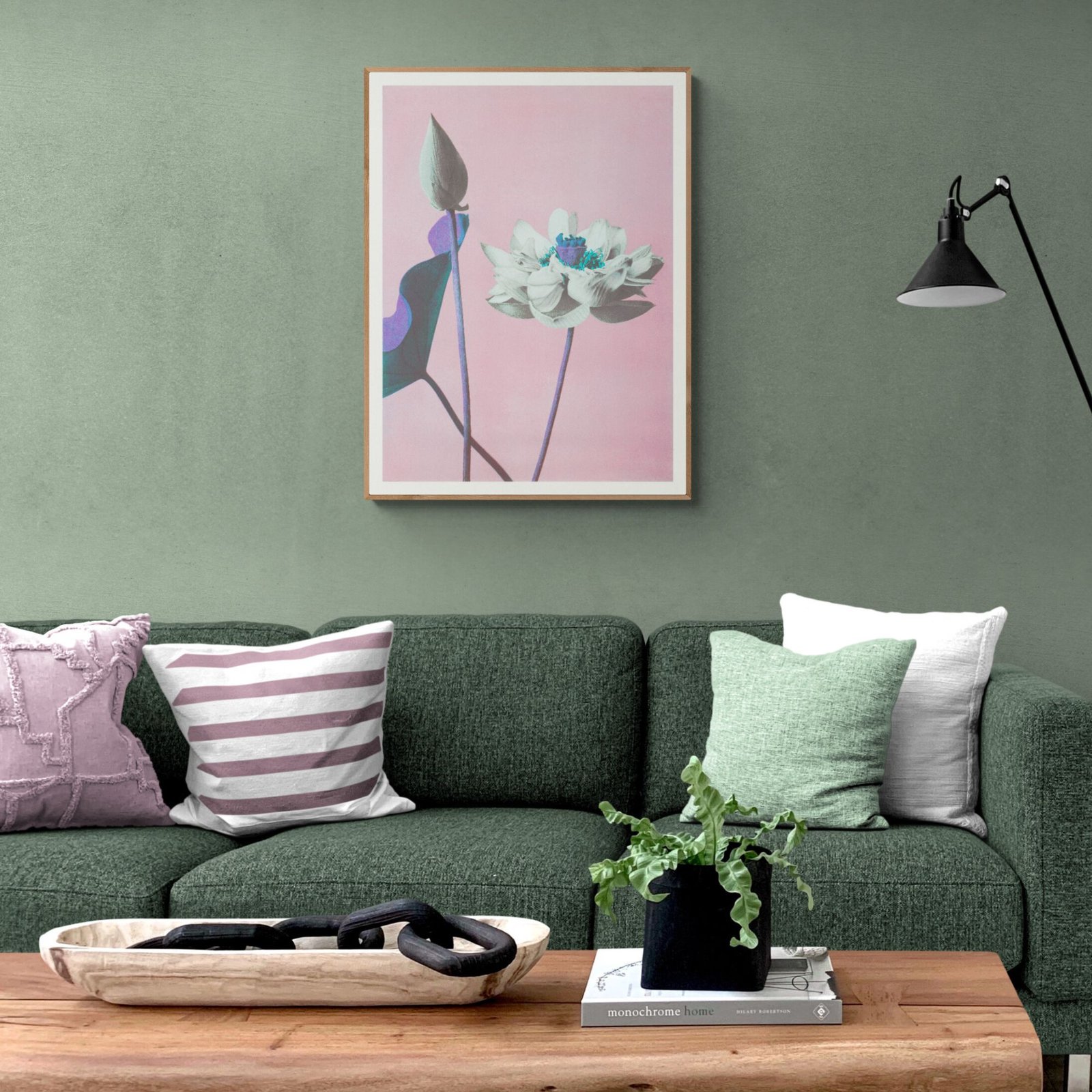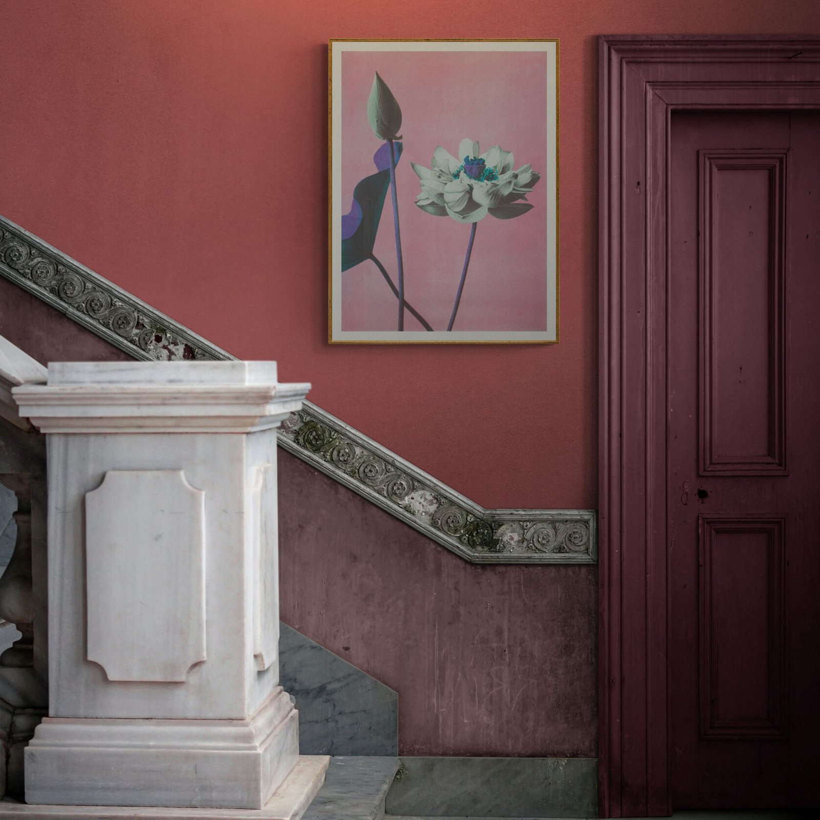 Framed flower artwork on pink background near potted plant.Ogawa Kazumasa – Japanese Flower Art, Lotus Pink
