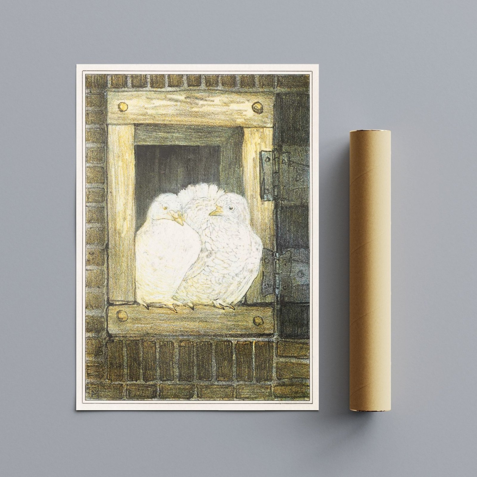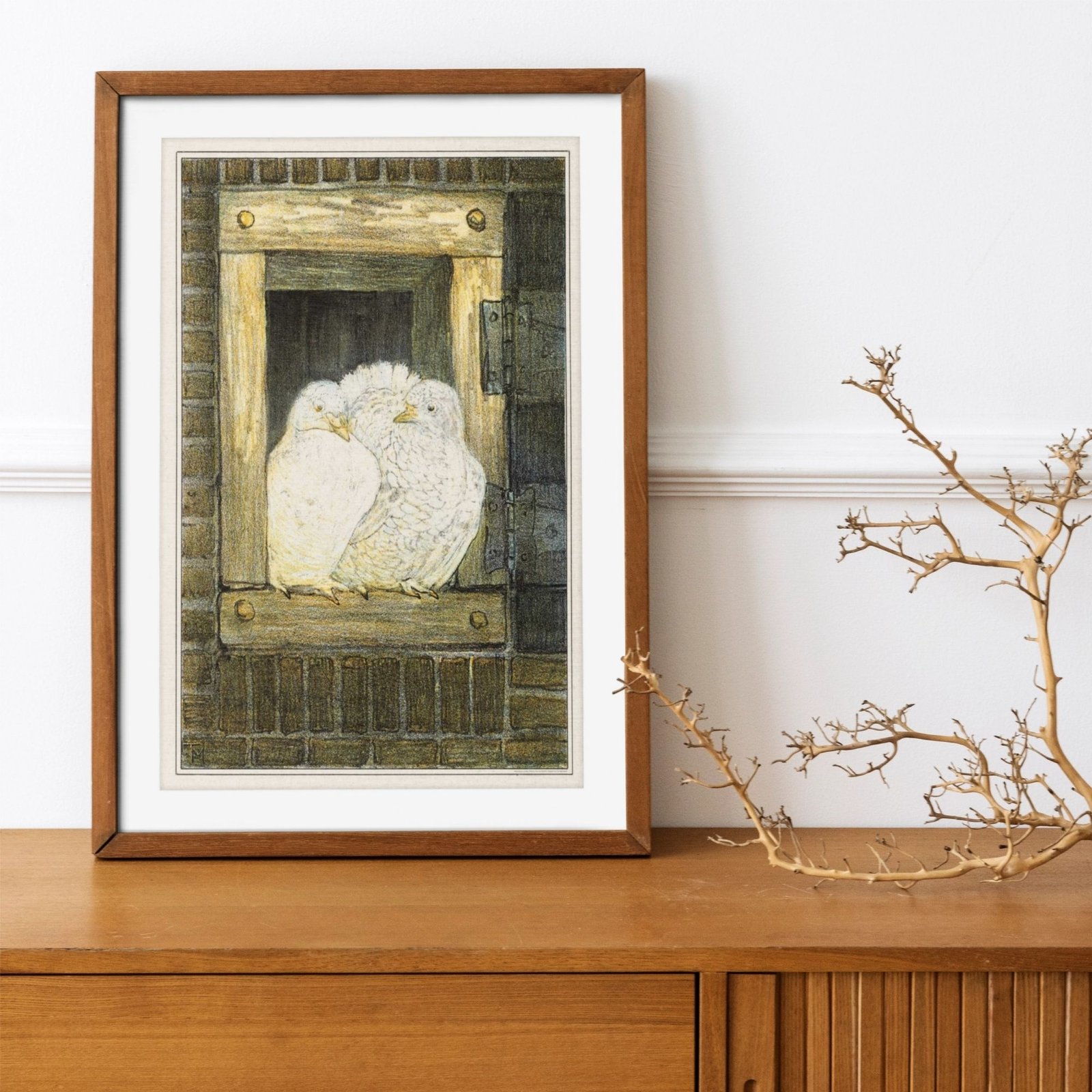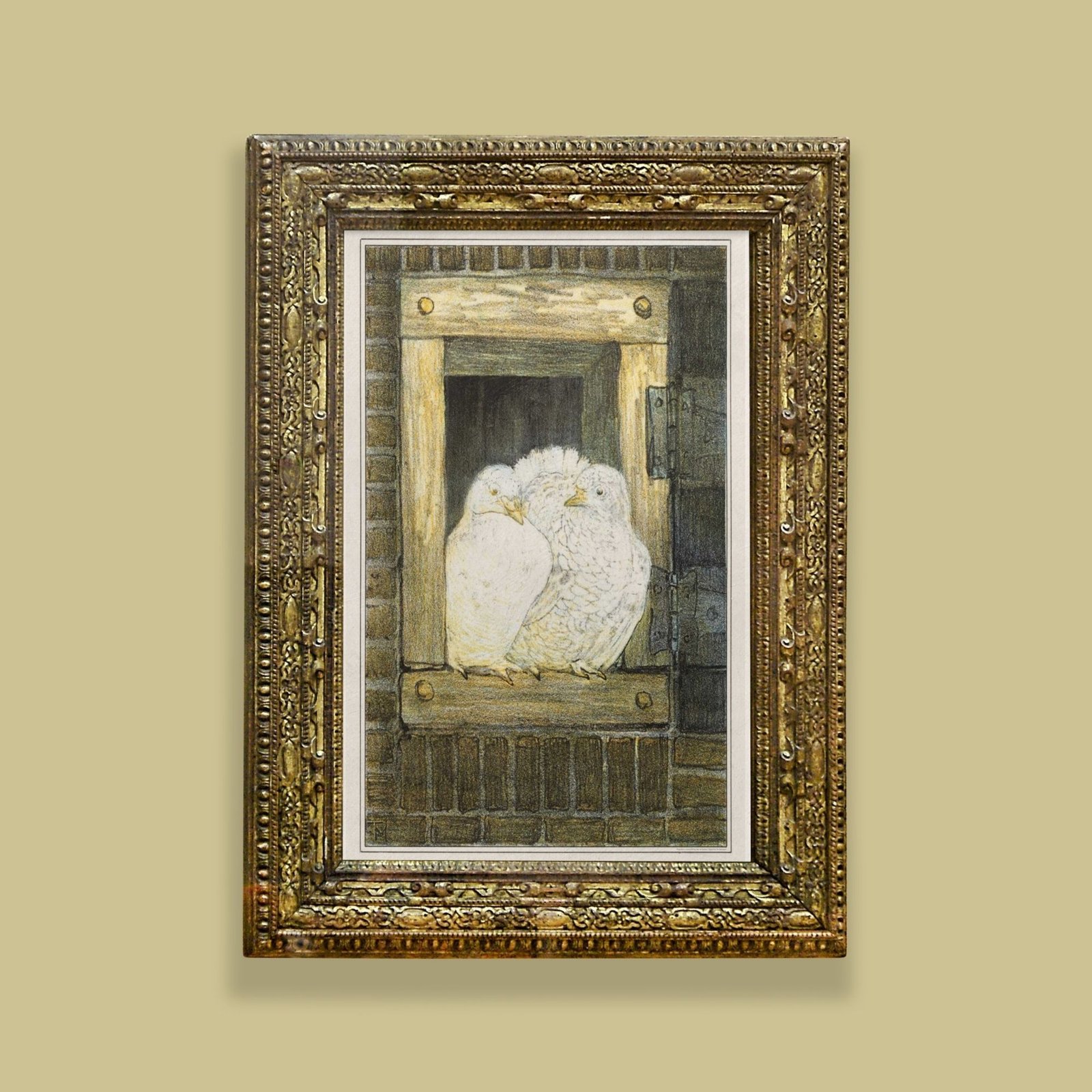 Framed artwork of two white birds in nest.Theo van Hoytema – White Doves in Window