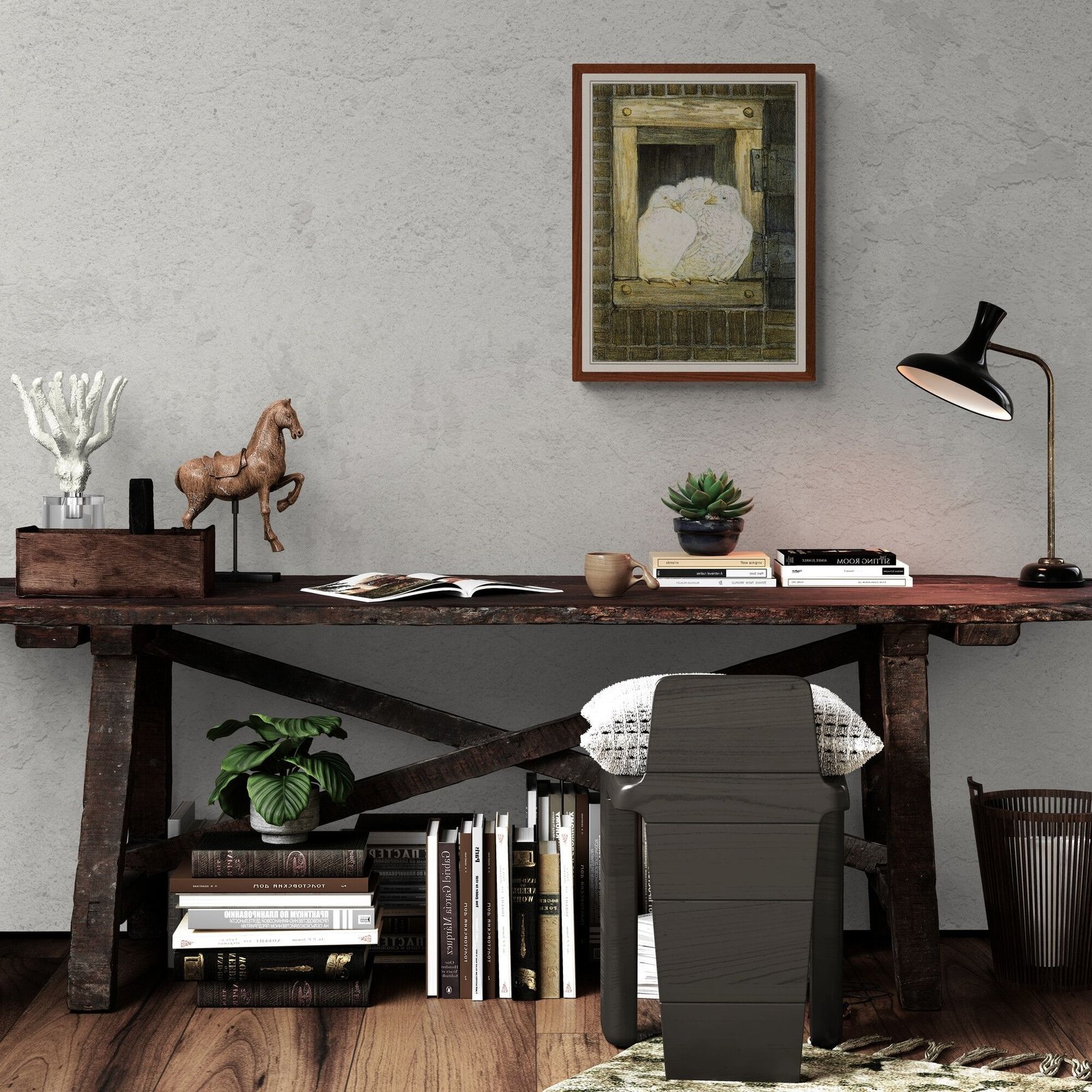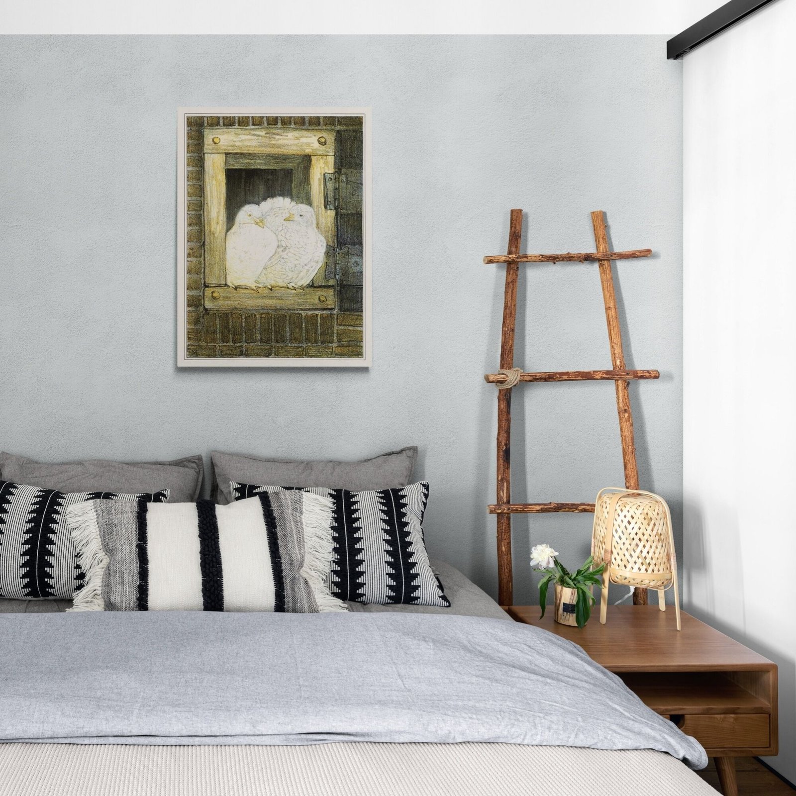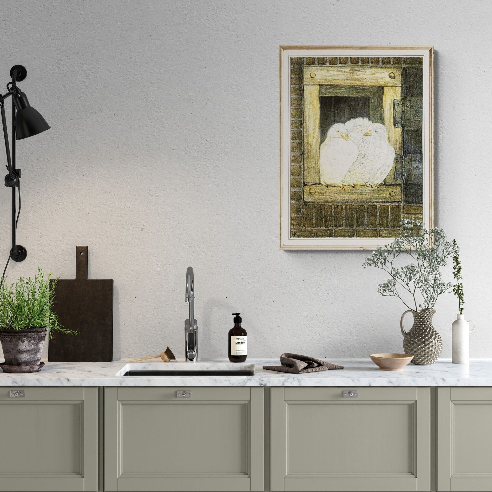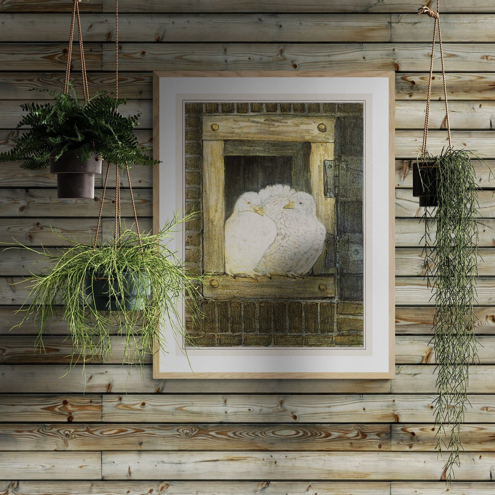 Framed artwork of two white birds in nest.Theo van Hoytema – White Doves in Window