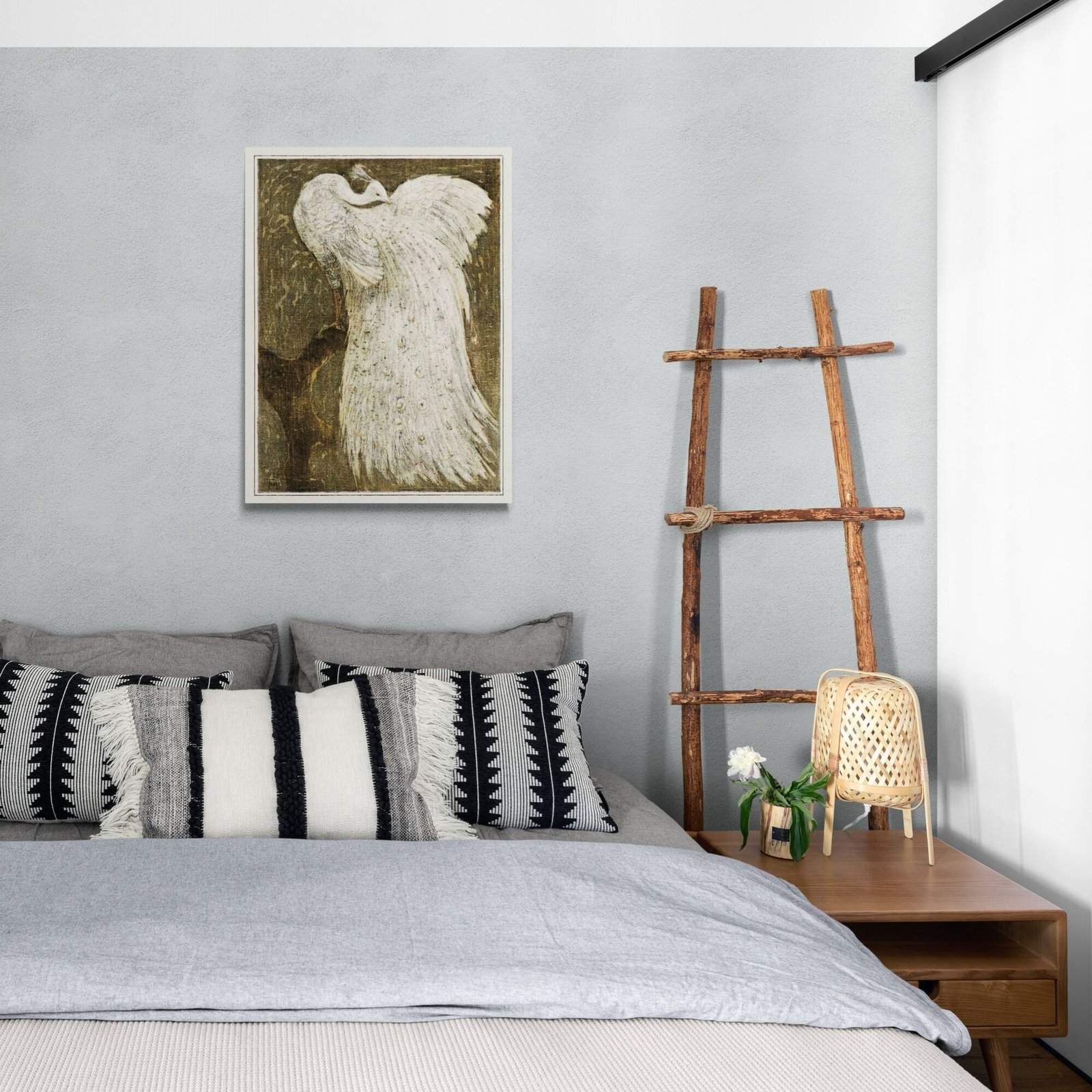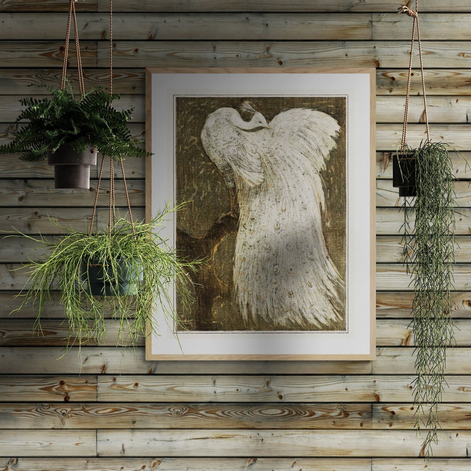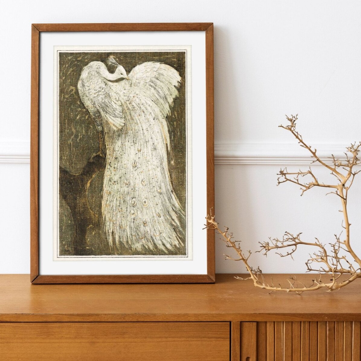 Framed peacock artwork on wooden sideboard.Theo van Hoytema – White Peacock on Branch