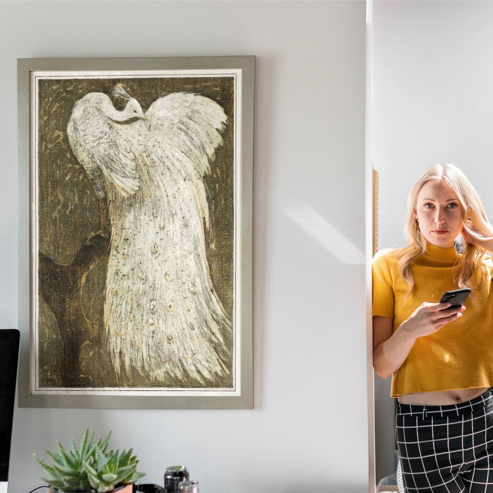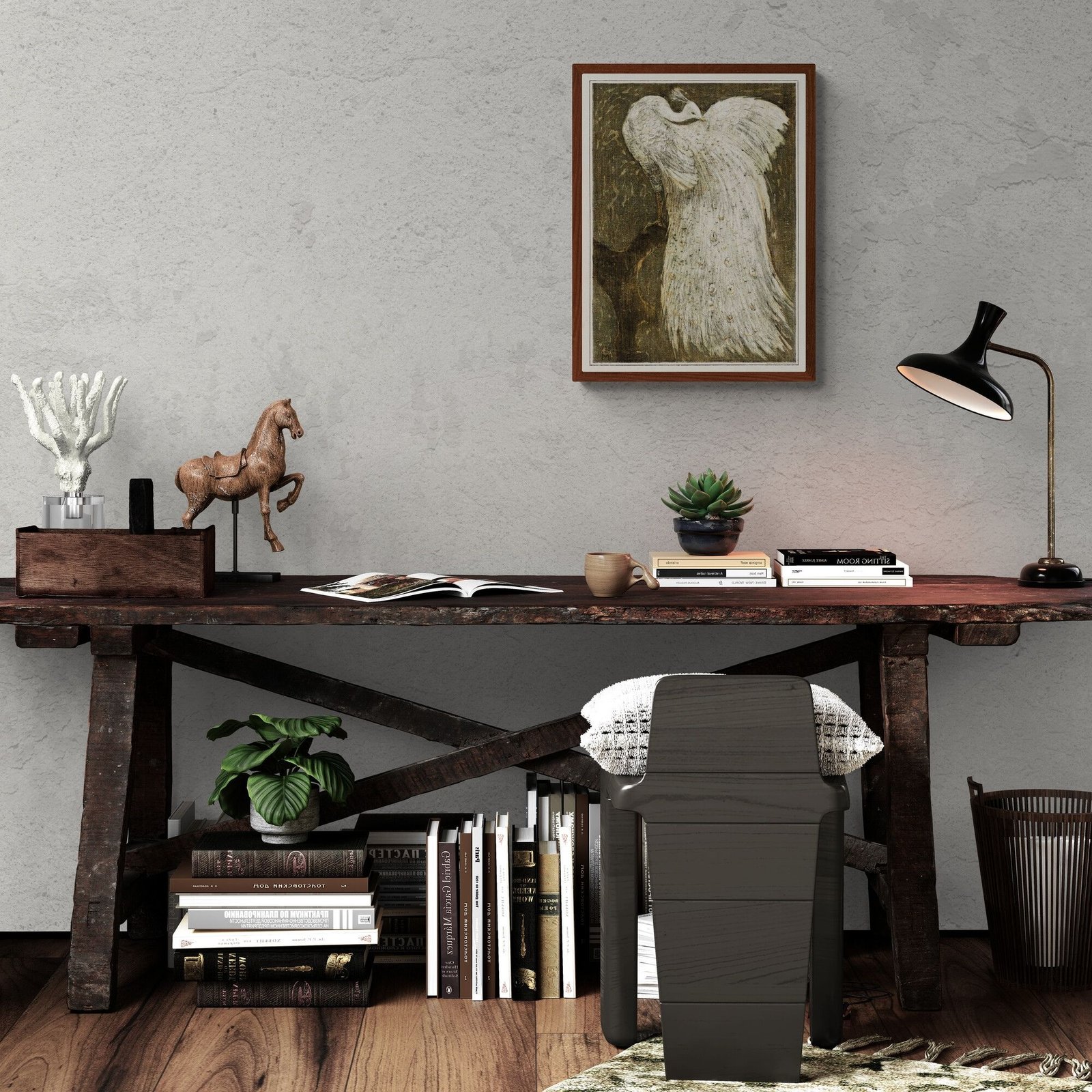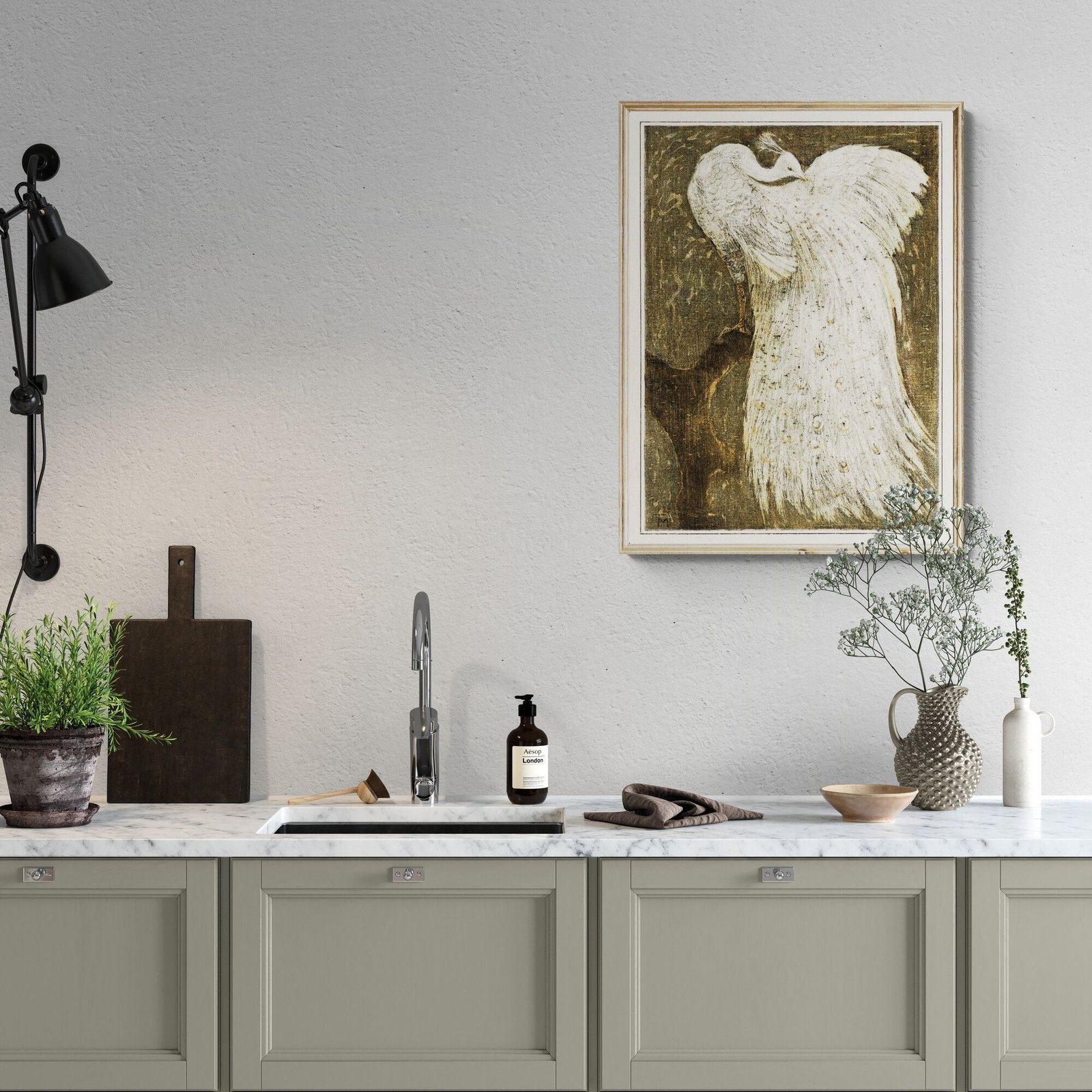 Framed peacock artwork on wooden sideboard.Theo van Hoytema – White Peacock on Branch