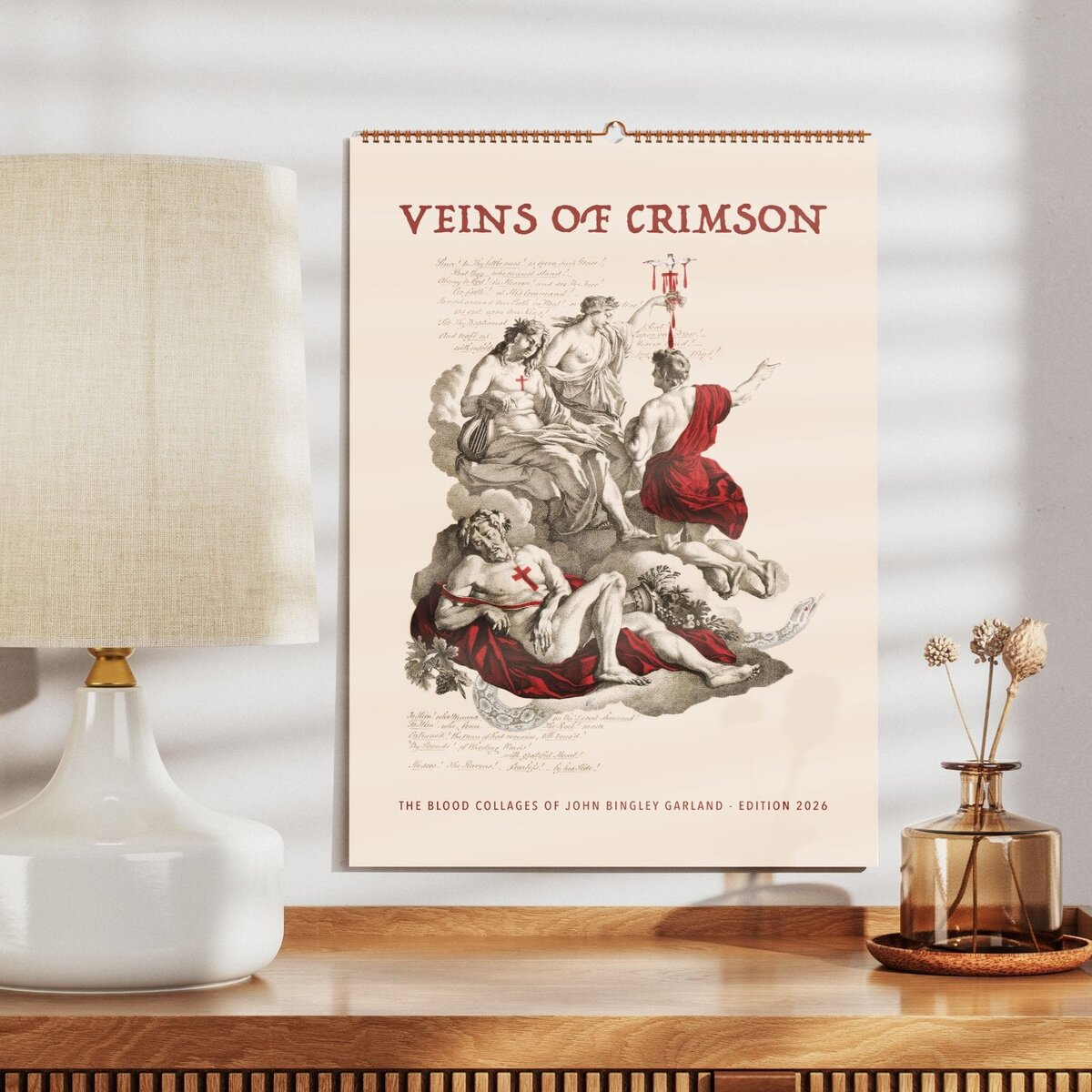 Explore our “Veins of Crimson Wall Calendar”, a tribute to the hauntingly beautiful blood collages of John Bingley Garland. Garland, a 19th-century merchant, politician, and Newfoundland’s first Speaker of the House, created these intricate works as a wedding gift for his daughter. His collages, blending Romantic engravings, religious iconography, and vivid crimson details, are celebrated for their unique gothic aesthetic. Each month unveils a masterpiece from Garland’s collection, meticulously reproduced to capture the historical and artistic essence. This calendar doubles as frameable art prints, making it a perfect gift for art enthusiasts and history lovers alike.