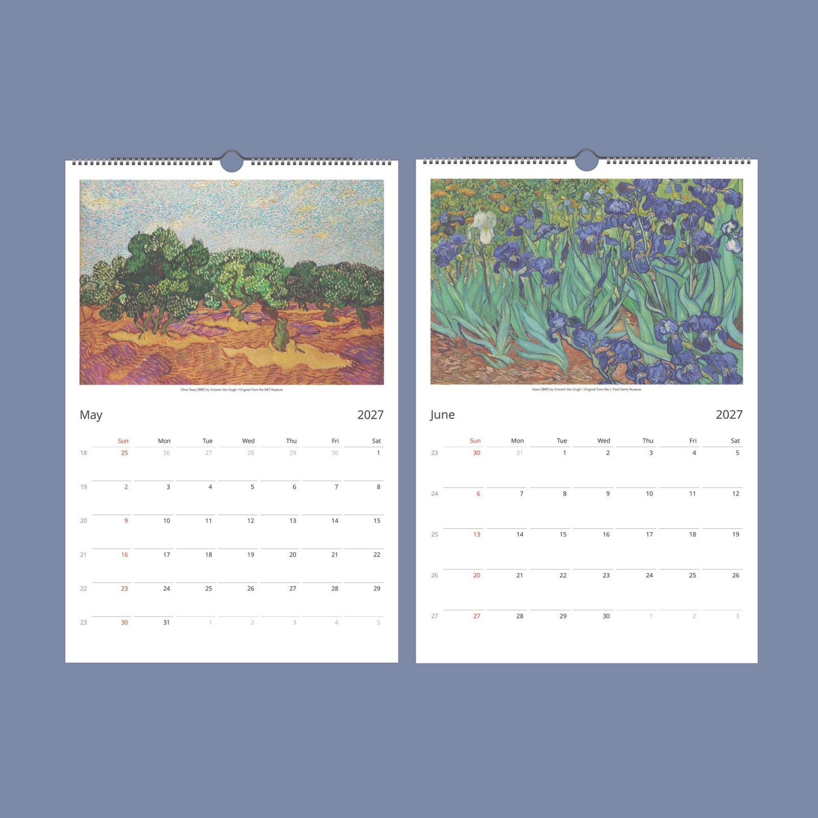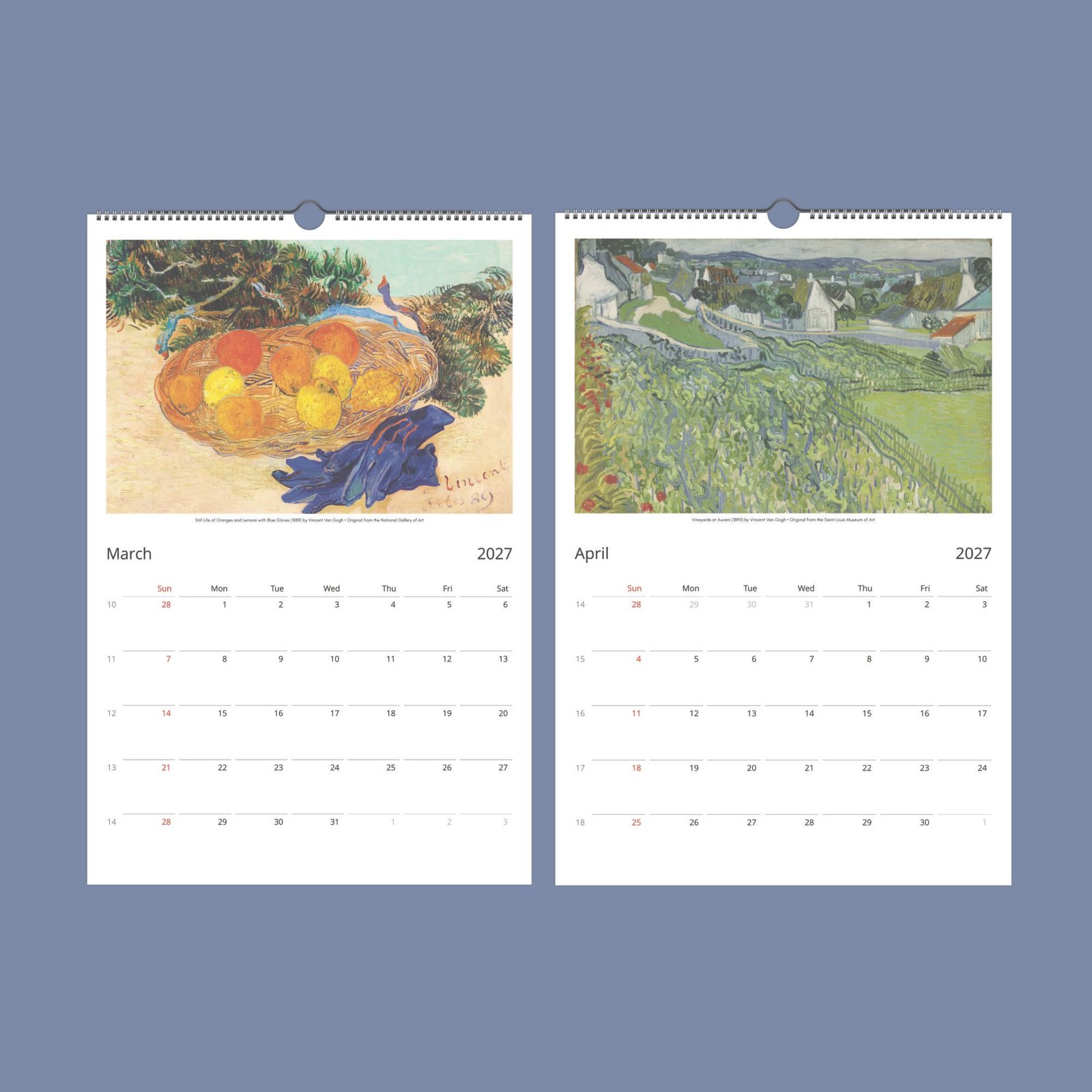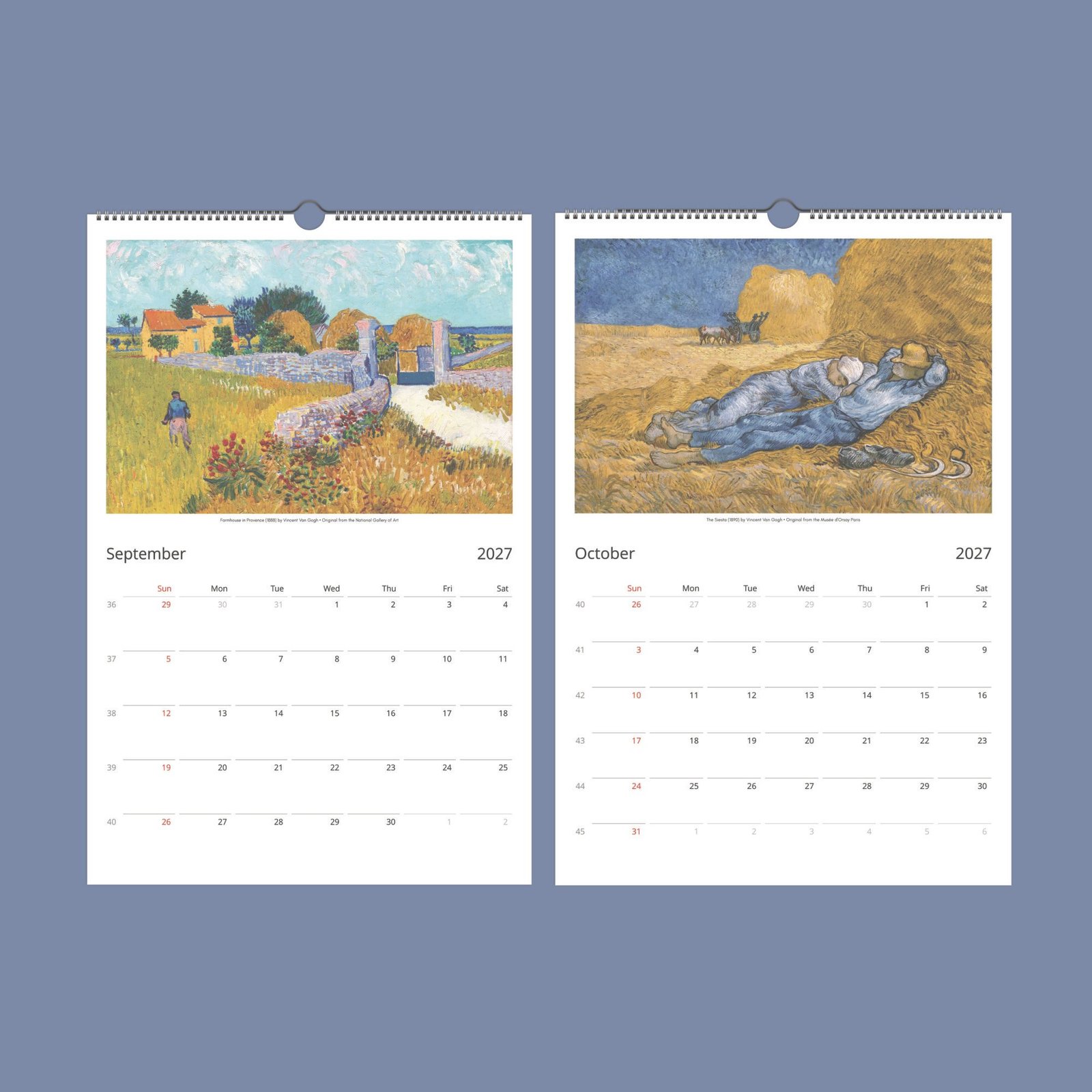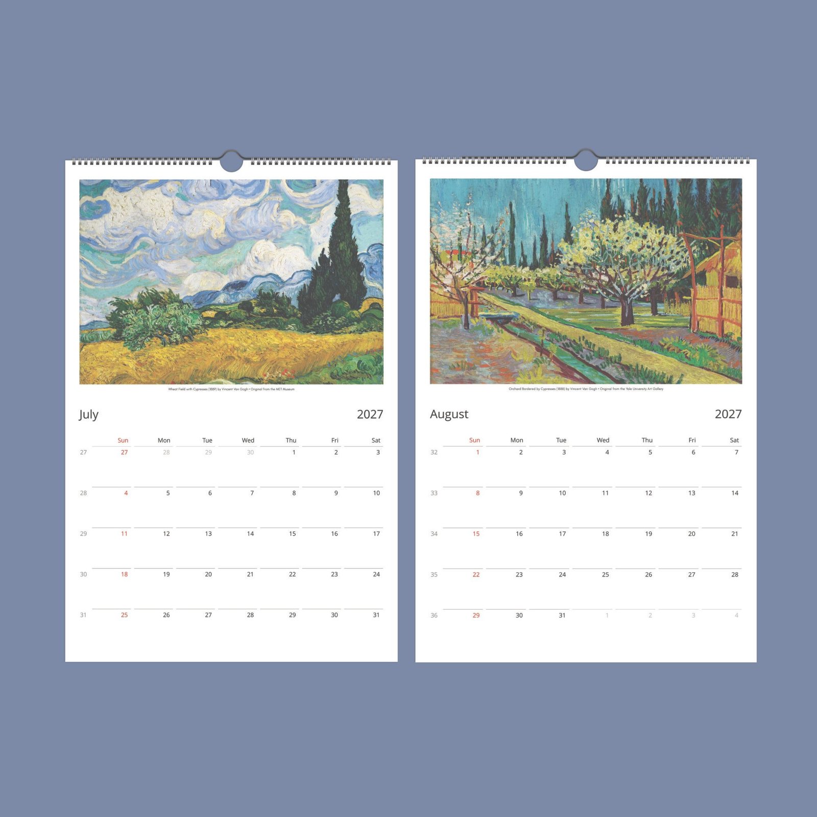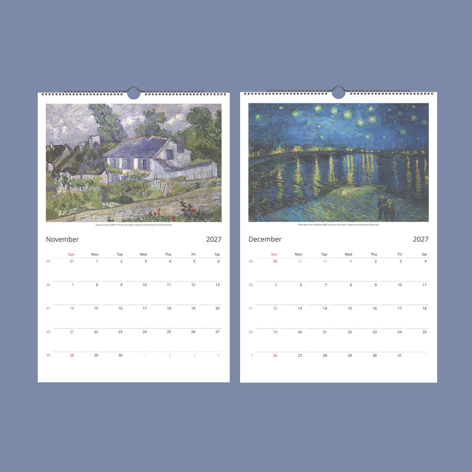 Our Wall Calendar is a daily tribute to Van Gogh’s enduring impact on the art world. Tailored for the discerning eye, it features spacious layouts for personal notes and important dates, designed to be marked with a permanent pen on our finely crafted paper. While focusing on the essentials, it excludes holidays, yet includes week numbers, presented in English for universal accessibility. It’s more than a calendar—it’s a conversation piece, a source of inspiration, and after the year’s end, a collection of art ready to be transformed into framed masterpieces for your home.