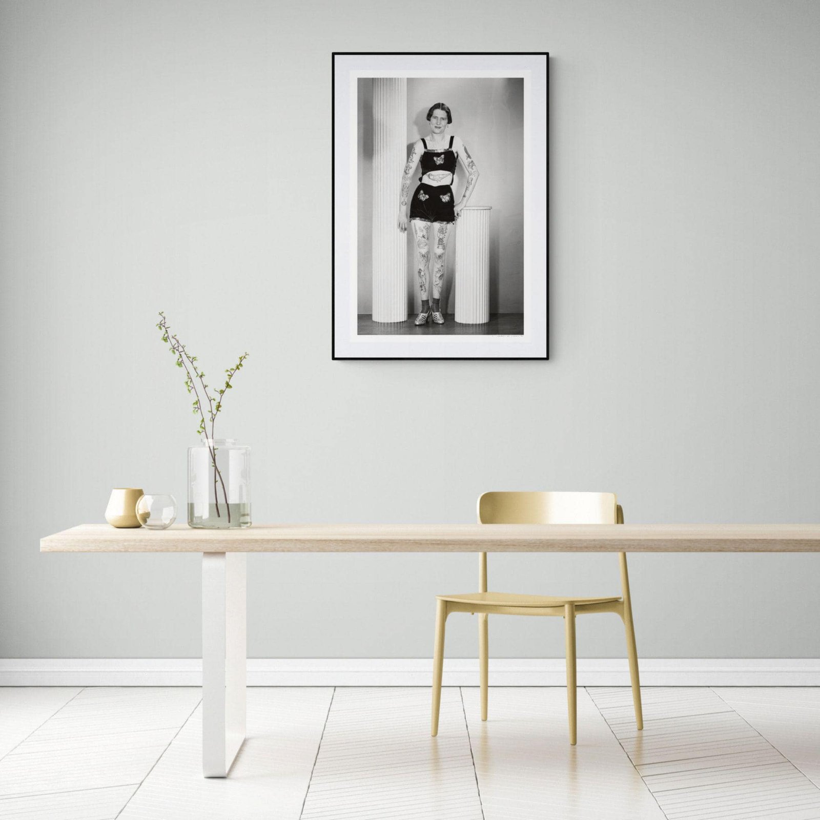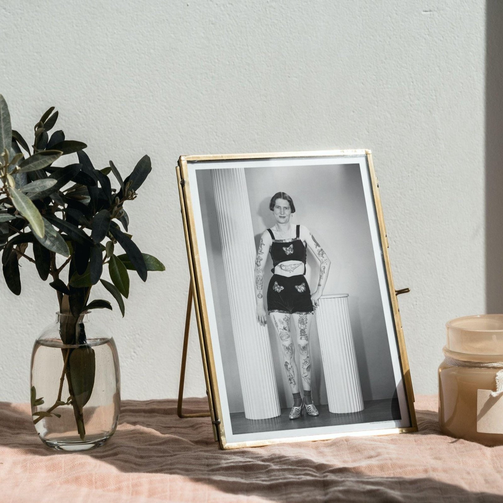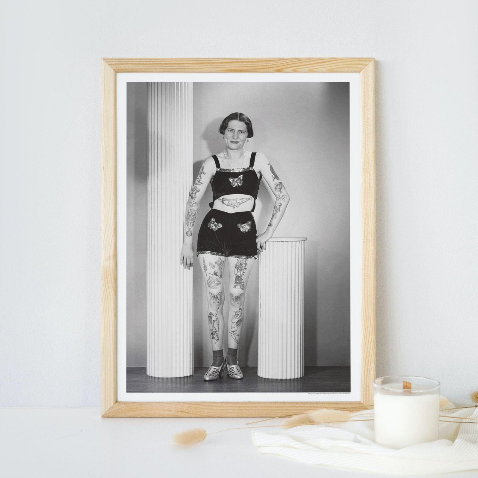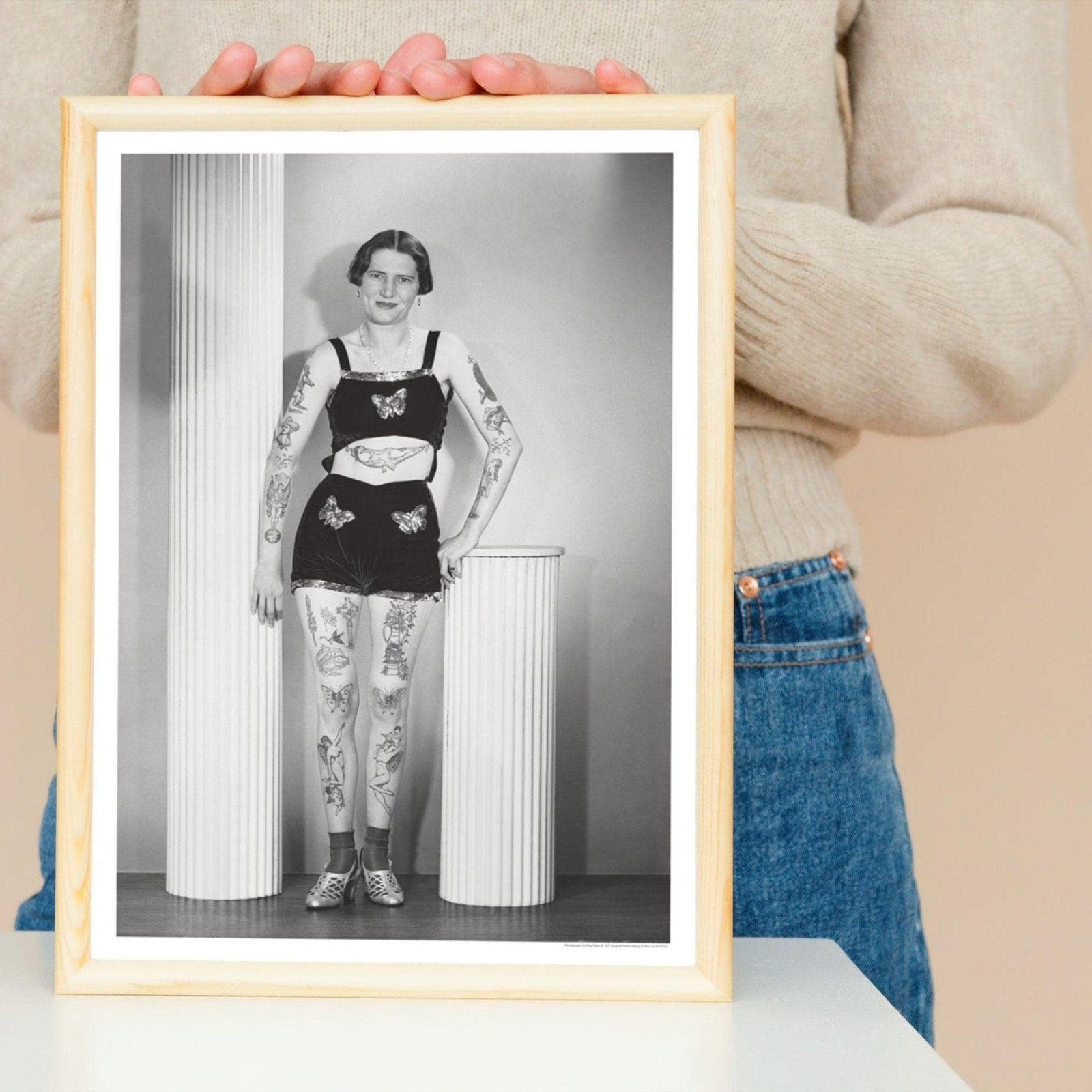 Framed vintage photo of tattooed woman in shorts.Vintage Tattoo Art – Butterfly Ink Rebel