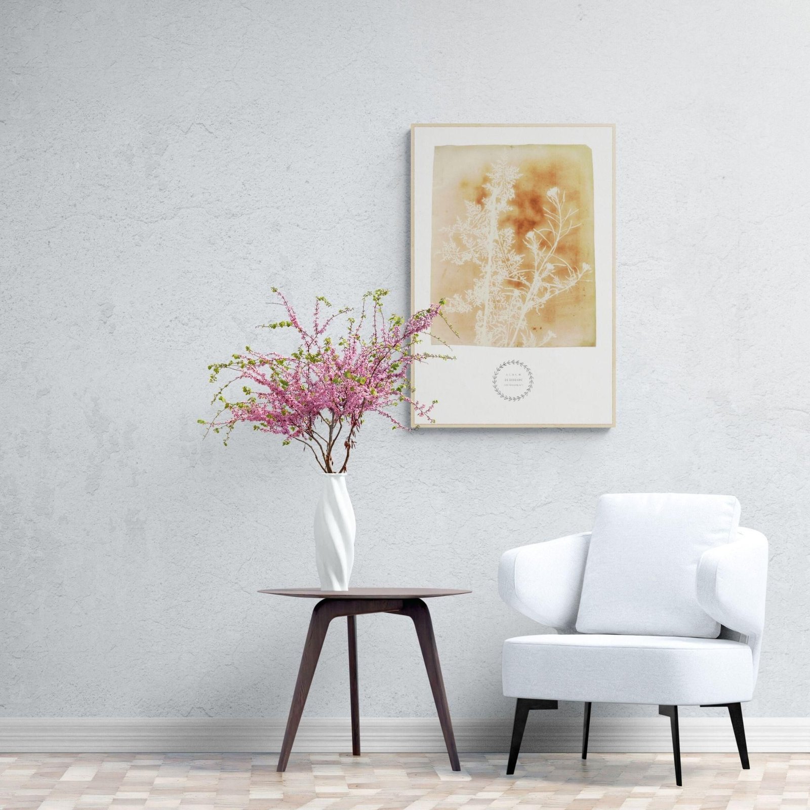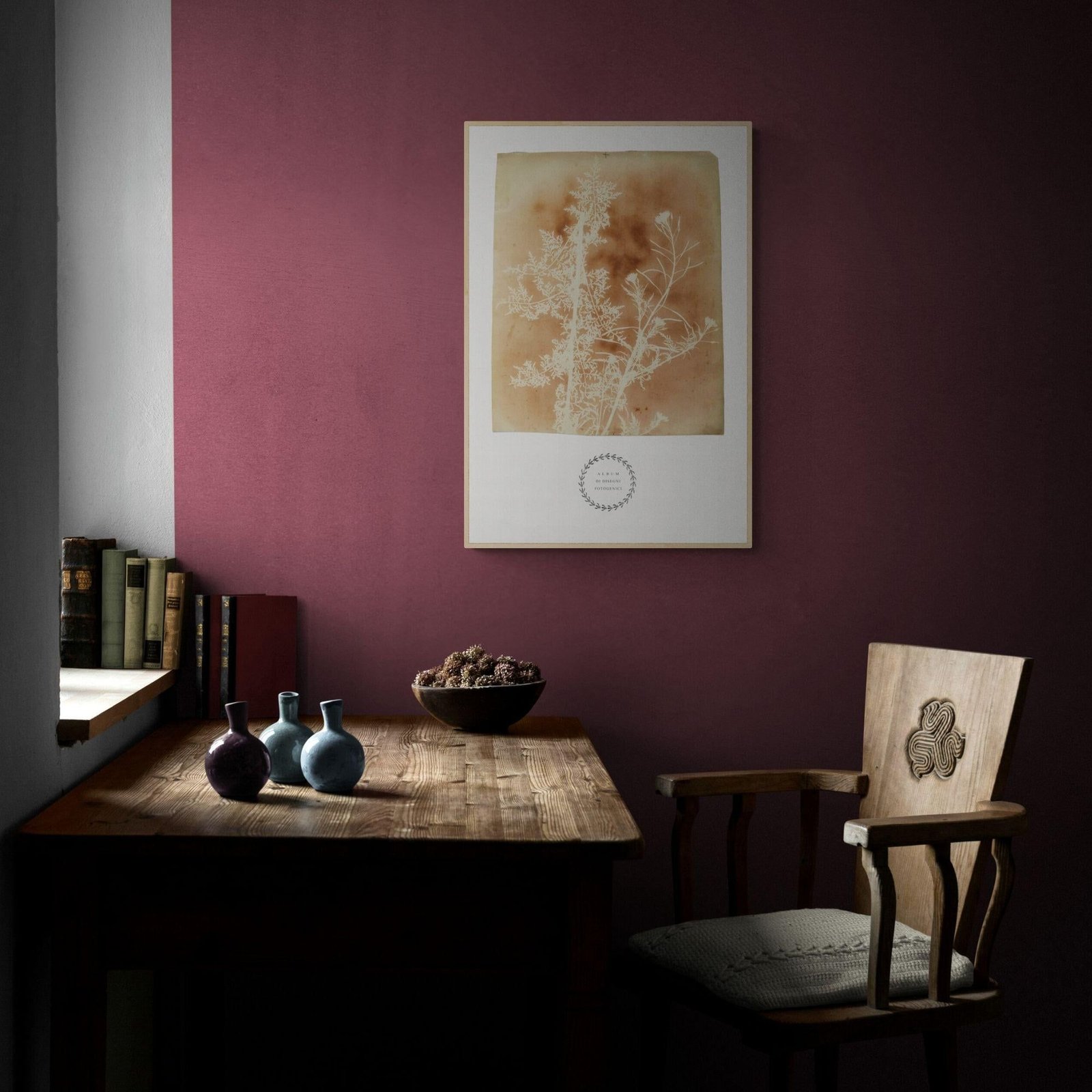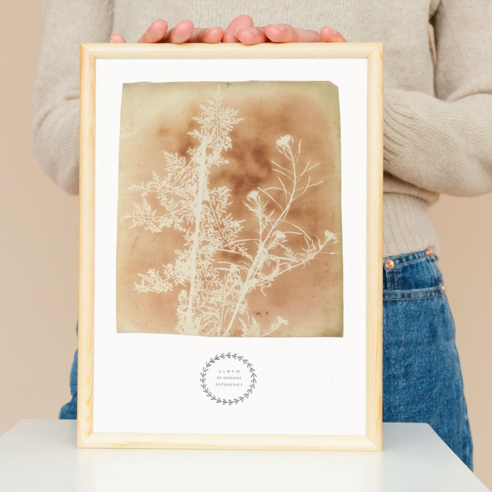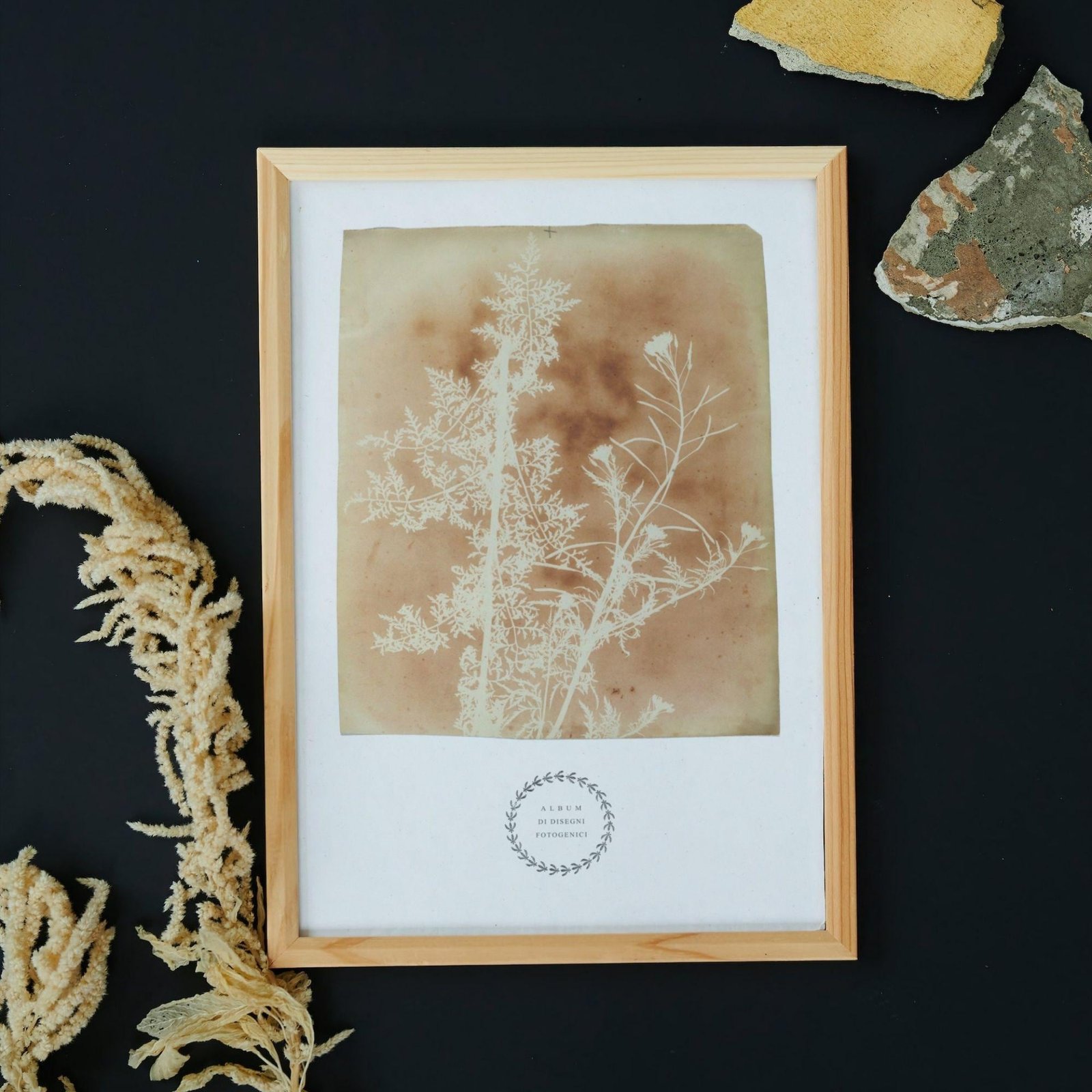 Framed botanical art with dried plant on table.William Henry Fox Talbot – Sisymbrium Cumingianum