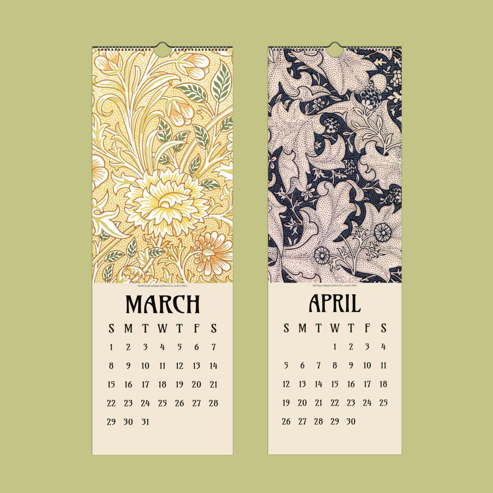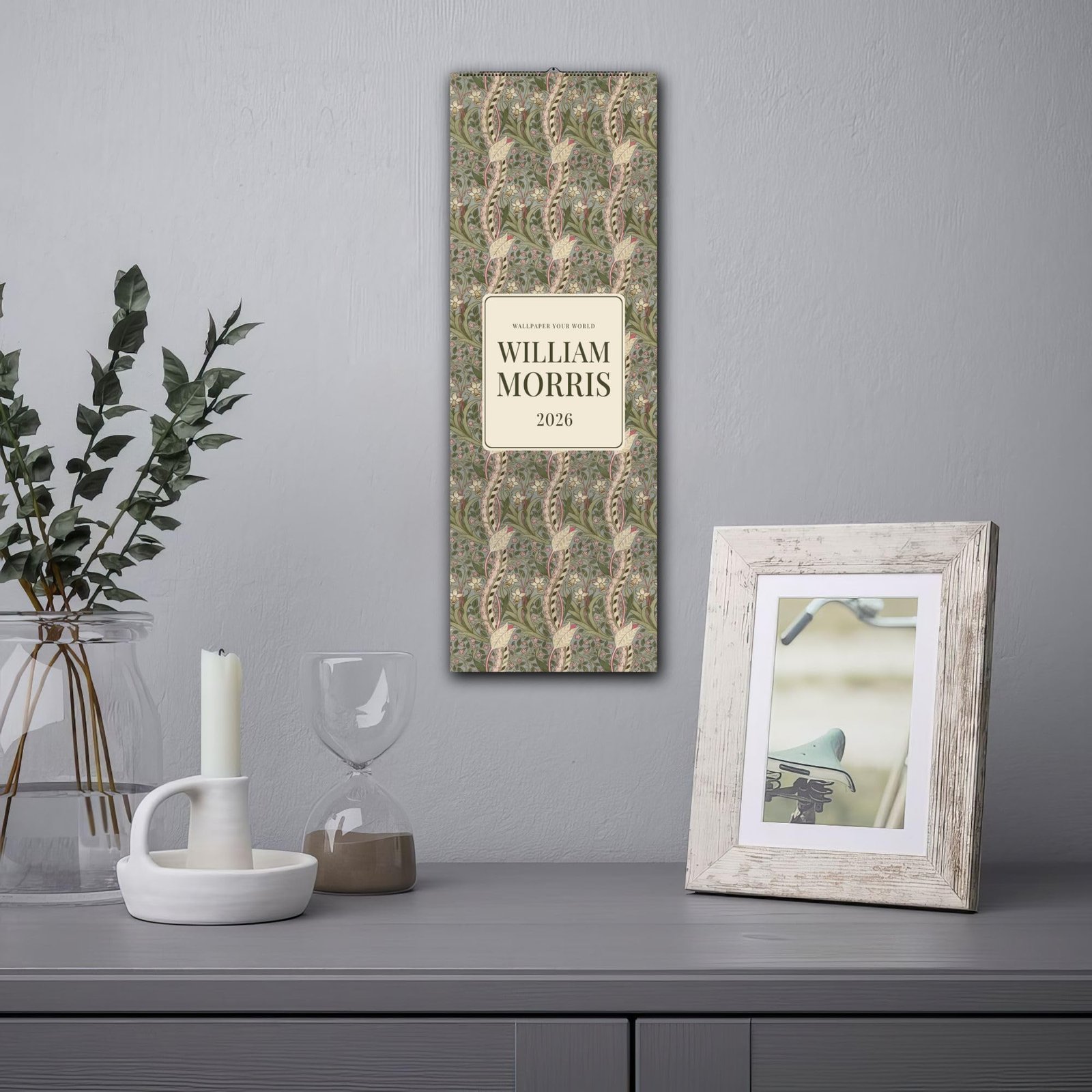 William Morris 2026 calendar on wall above table.William Morris Wall Calendar (Daffodil Cover)